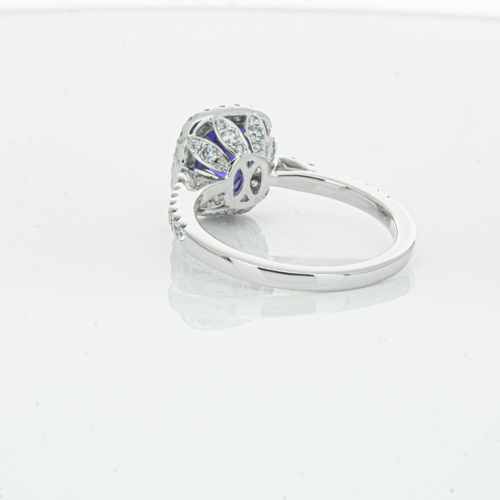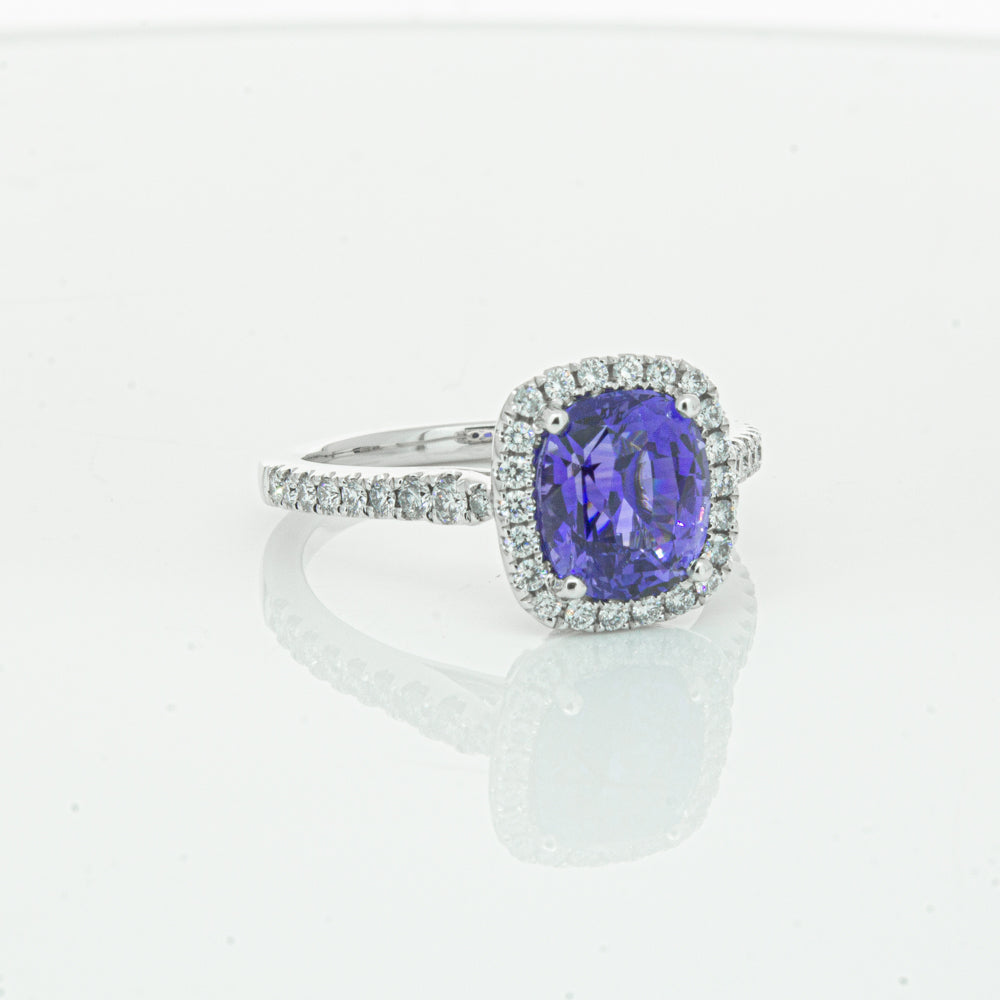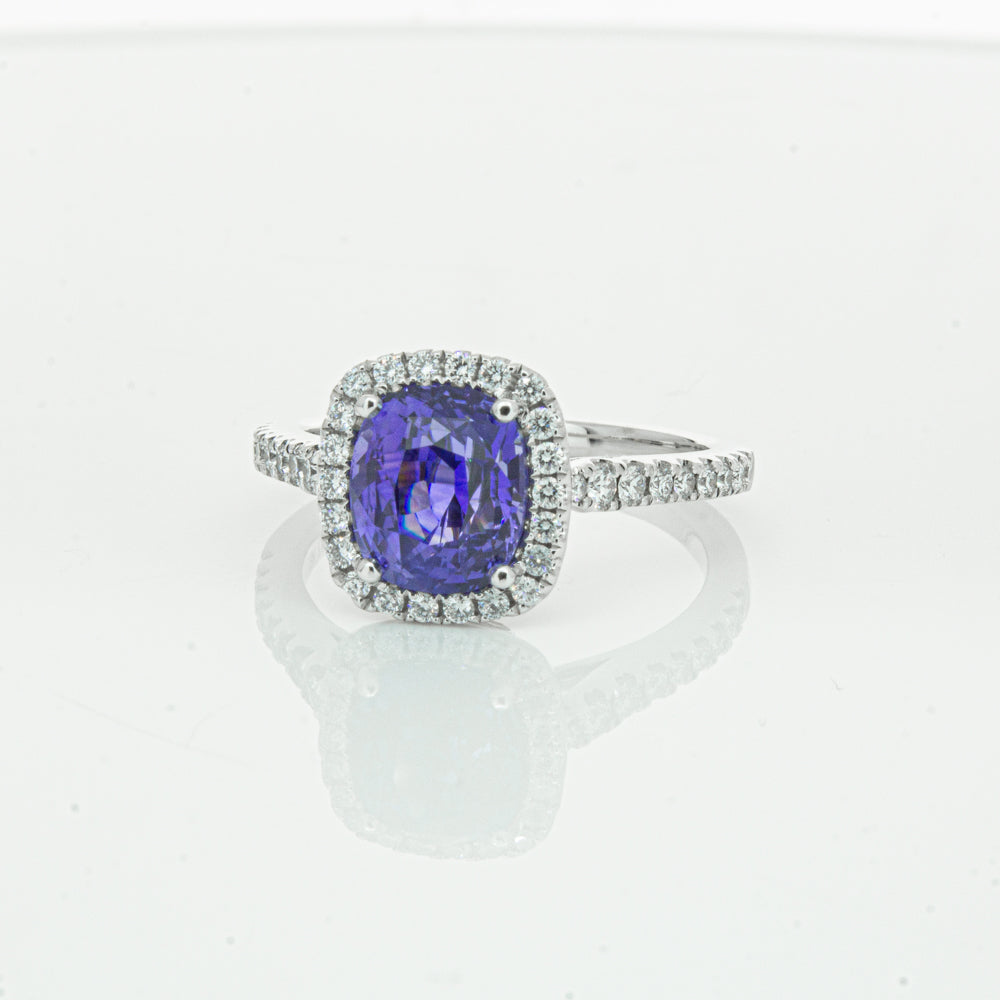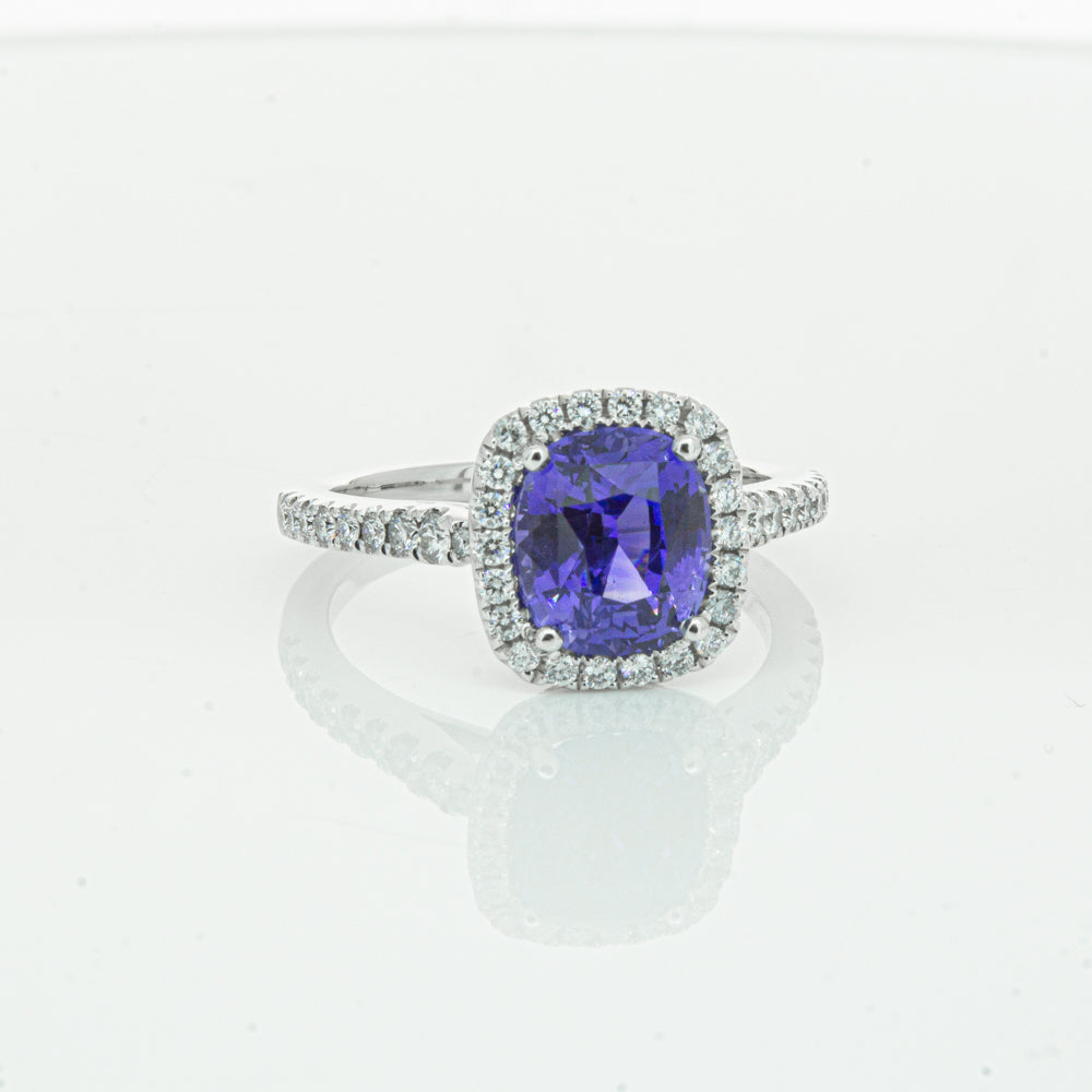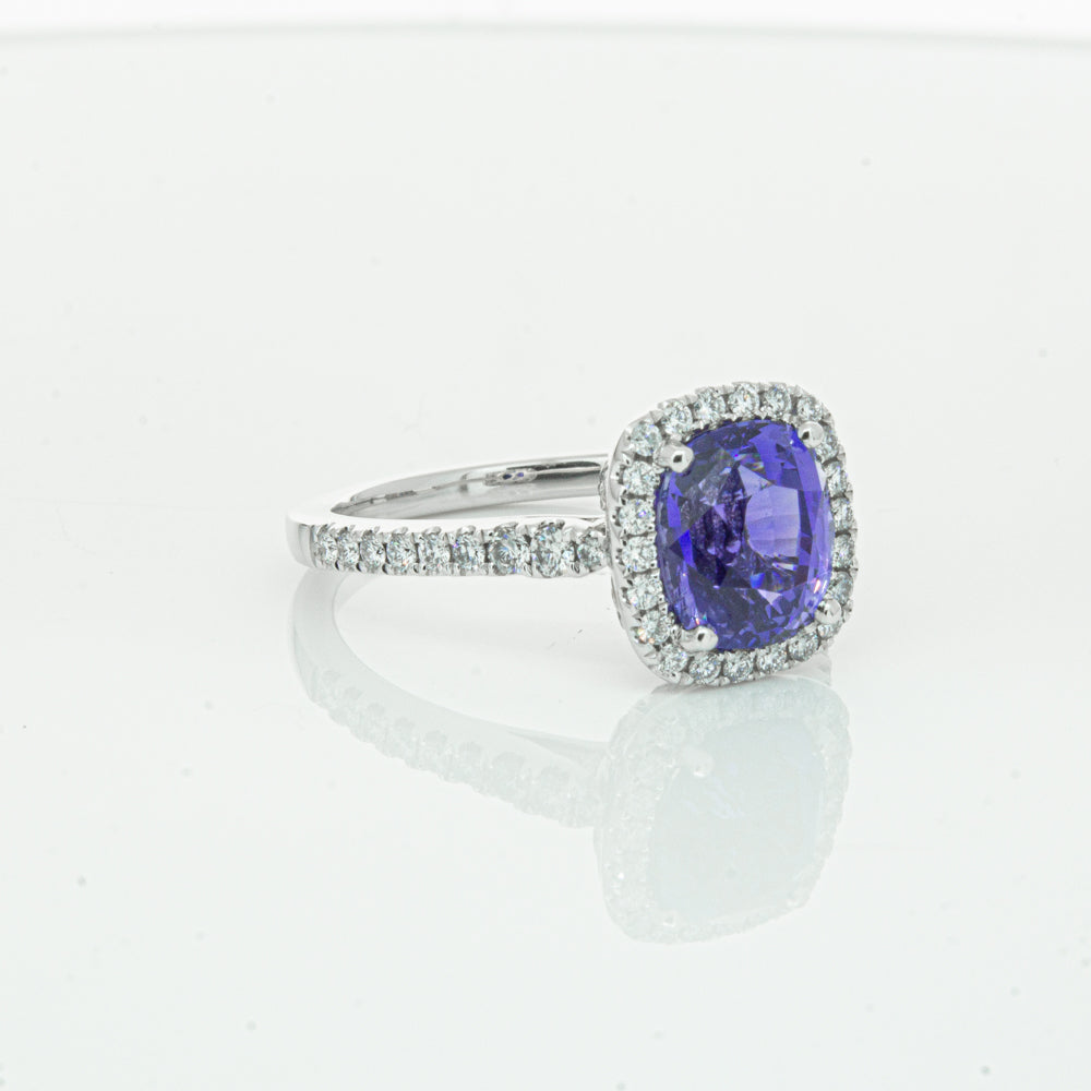 “Our proprietary Sierra design heroes a stunning fine blue cushion cut sapphire, your eyes drawn into the natural beauty and depth of colour in this enchanting gem. The sapphire is surrounded by a sparkling halo of diamonds, adding to the ring’s brilliance and allure. The combination of the fine blue sapphire and the sparkling bright white diamonds creates a dazzling display of light and colour that captures the eye and enchants the senses. Subtle features such as pinched shoulders and the diamond encrusted under bezel add to the unique allure. Made in high palladium white gold it is a special piece made to be treasured.” - Joseph Tattersfield