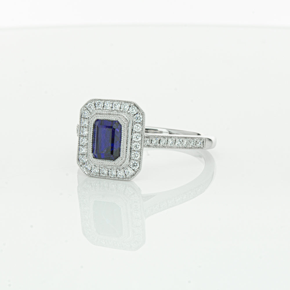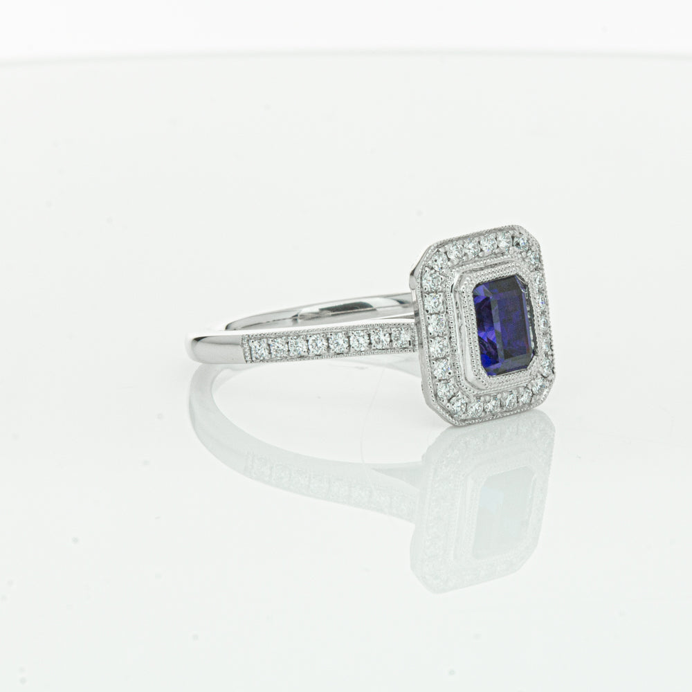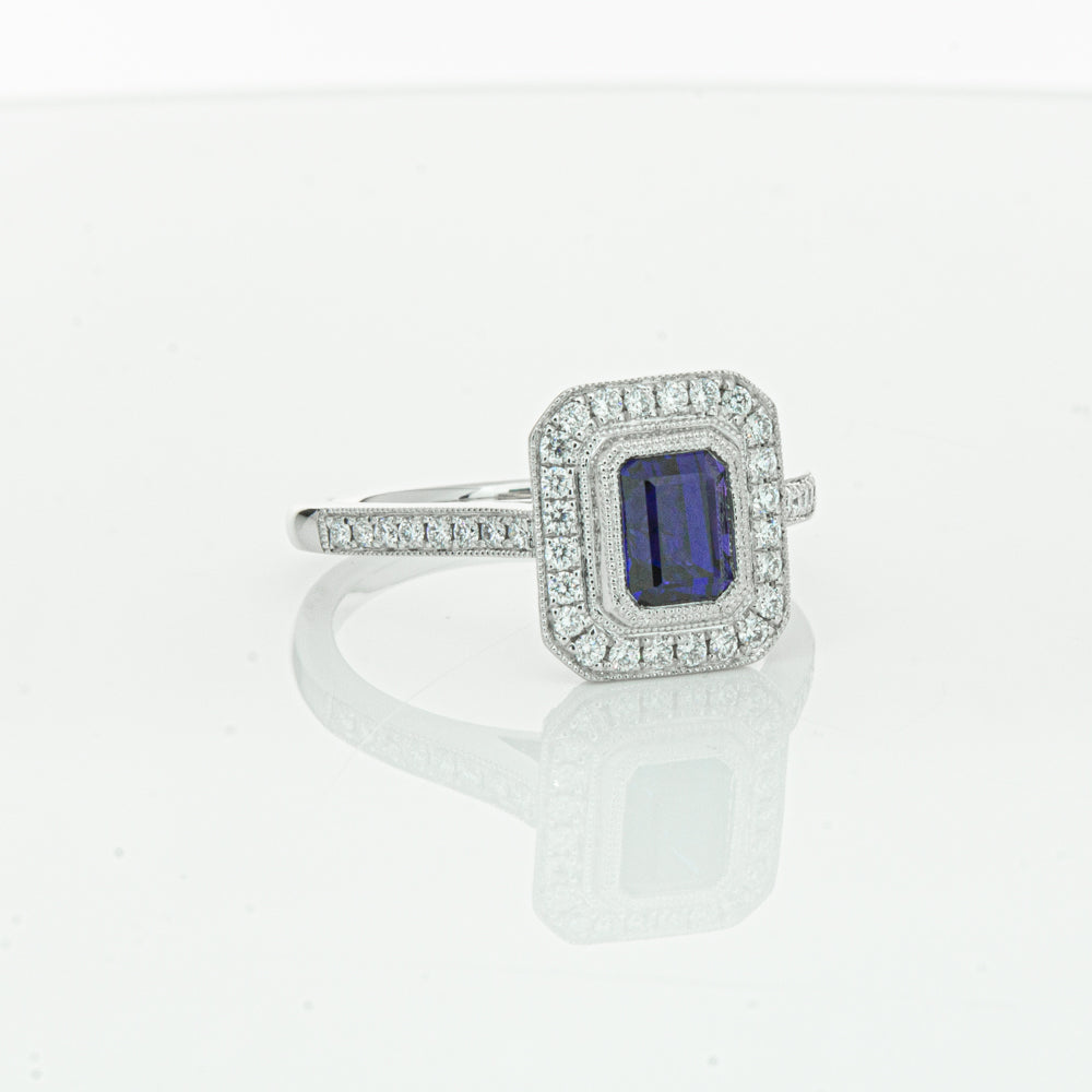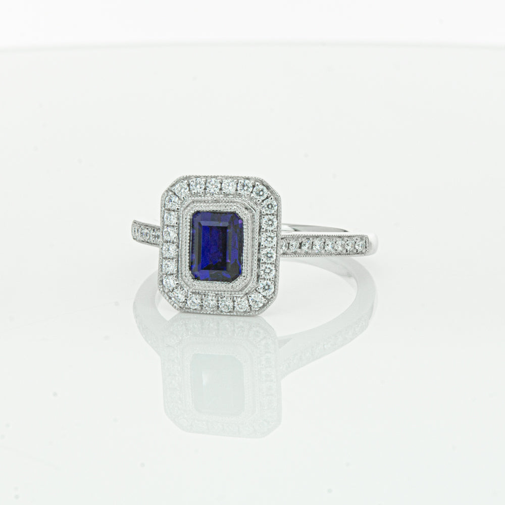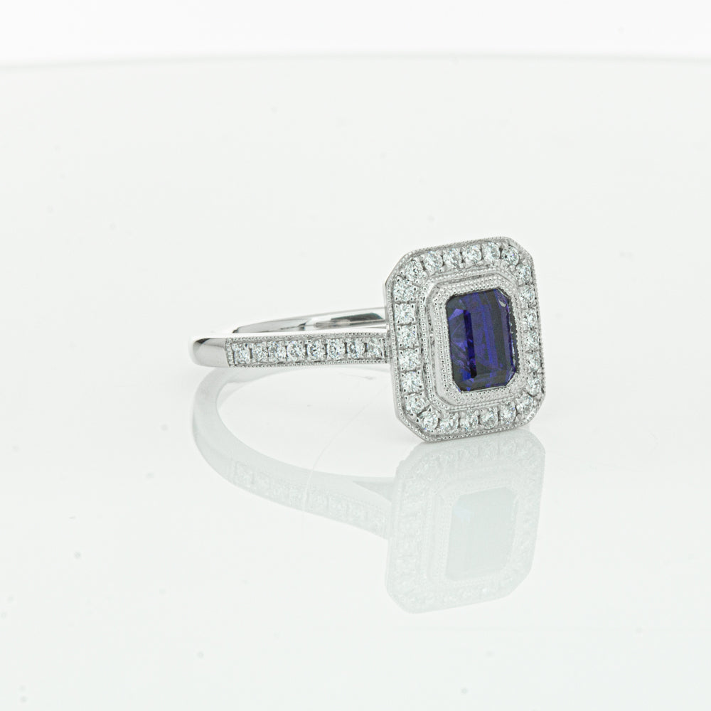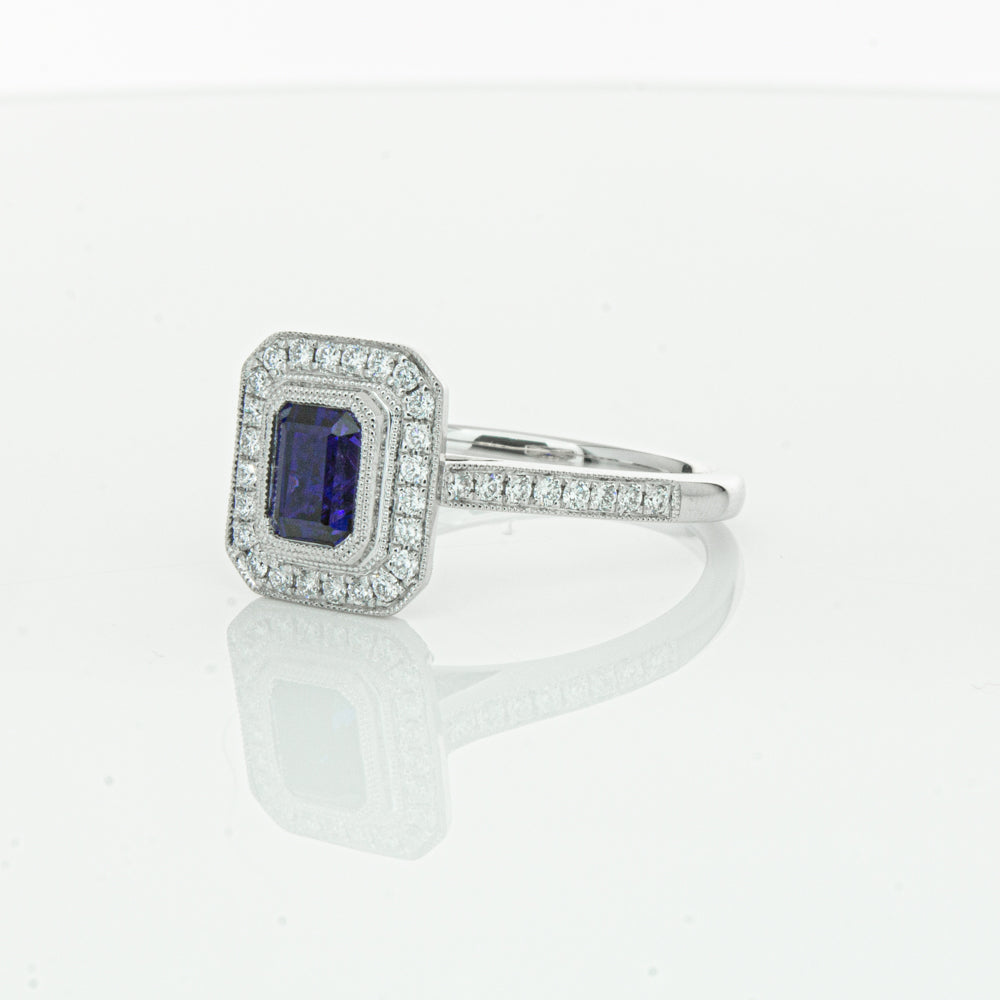 A timeless classic, you will cherish this elegant sapphire and diamond ring. This piece boasts a strong blue sapphire with a millgrain diamond halo and is carefully set in 18ct white gold from our signature 1899 collection.