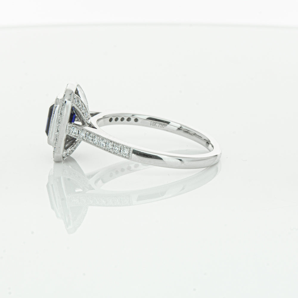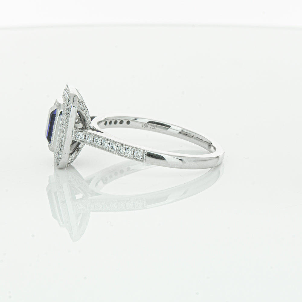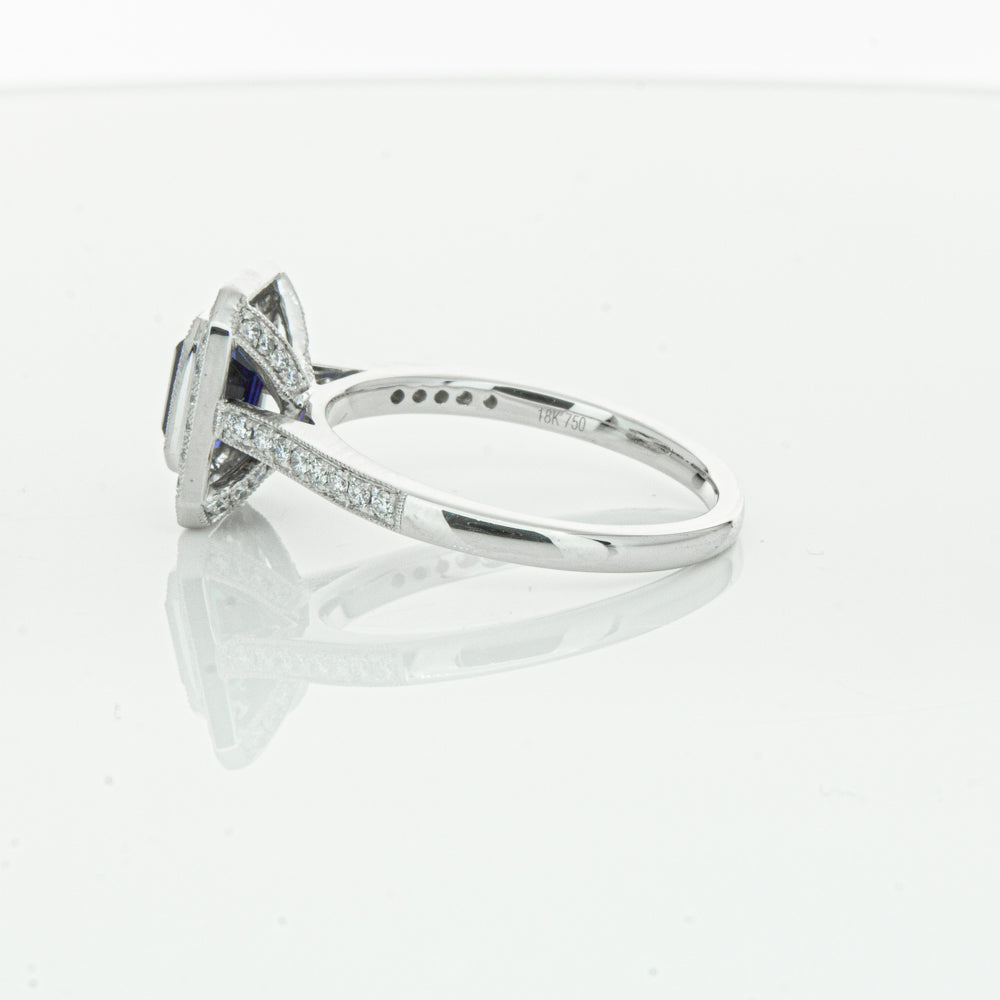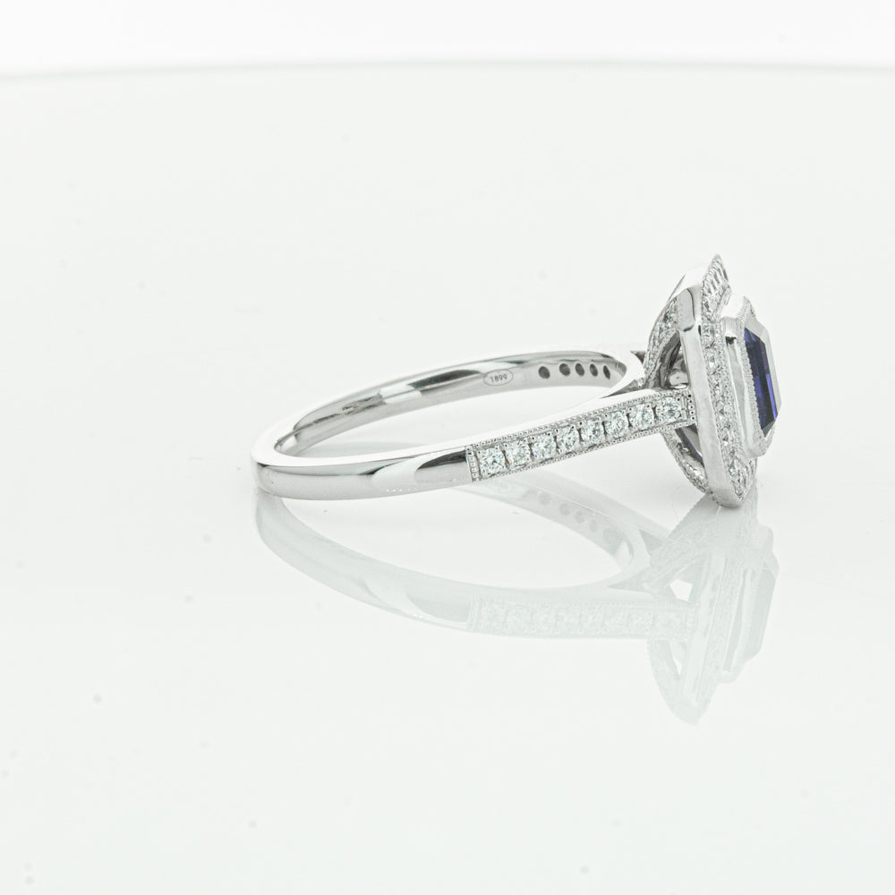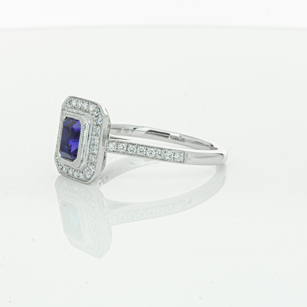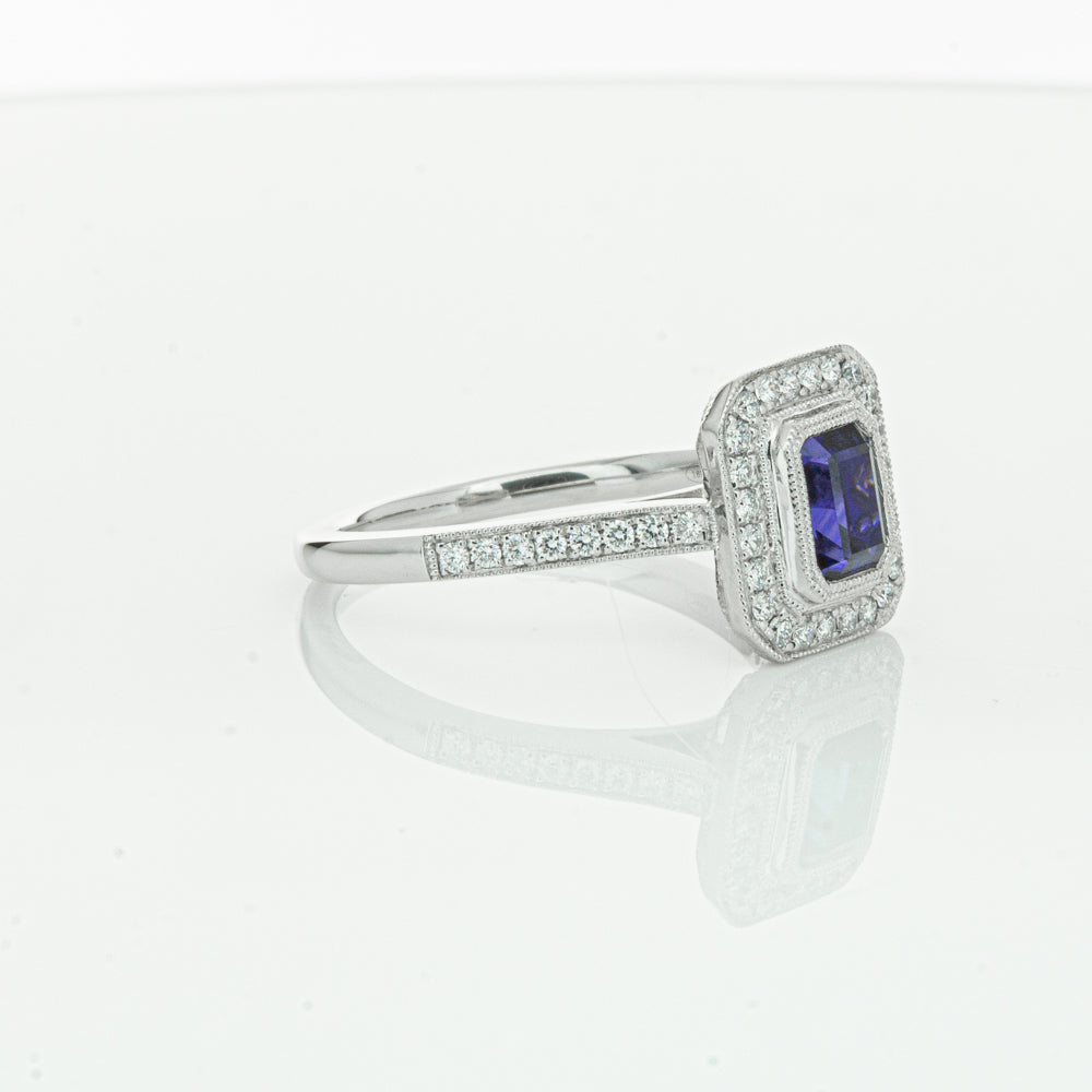 A timeless classic, you will cherish this elegant sapphire and diamond ring. This piece boasts a strong blue sapphire with a millgrain diamond halo and is carefully set in 18ct white gold from our signature 1899 collection.