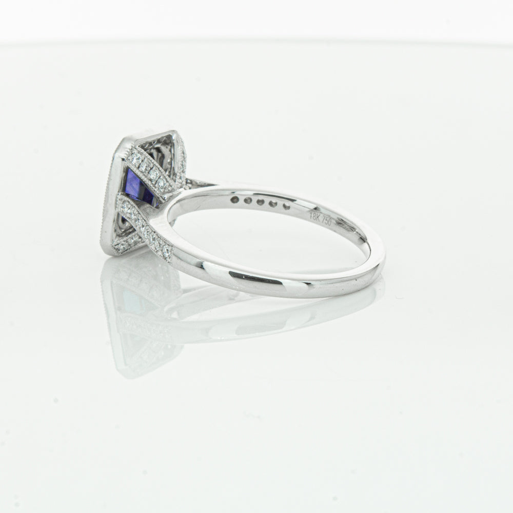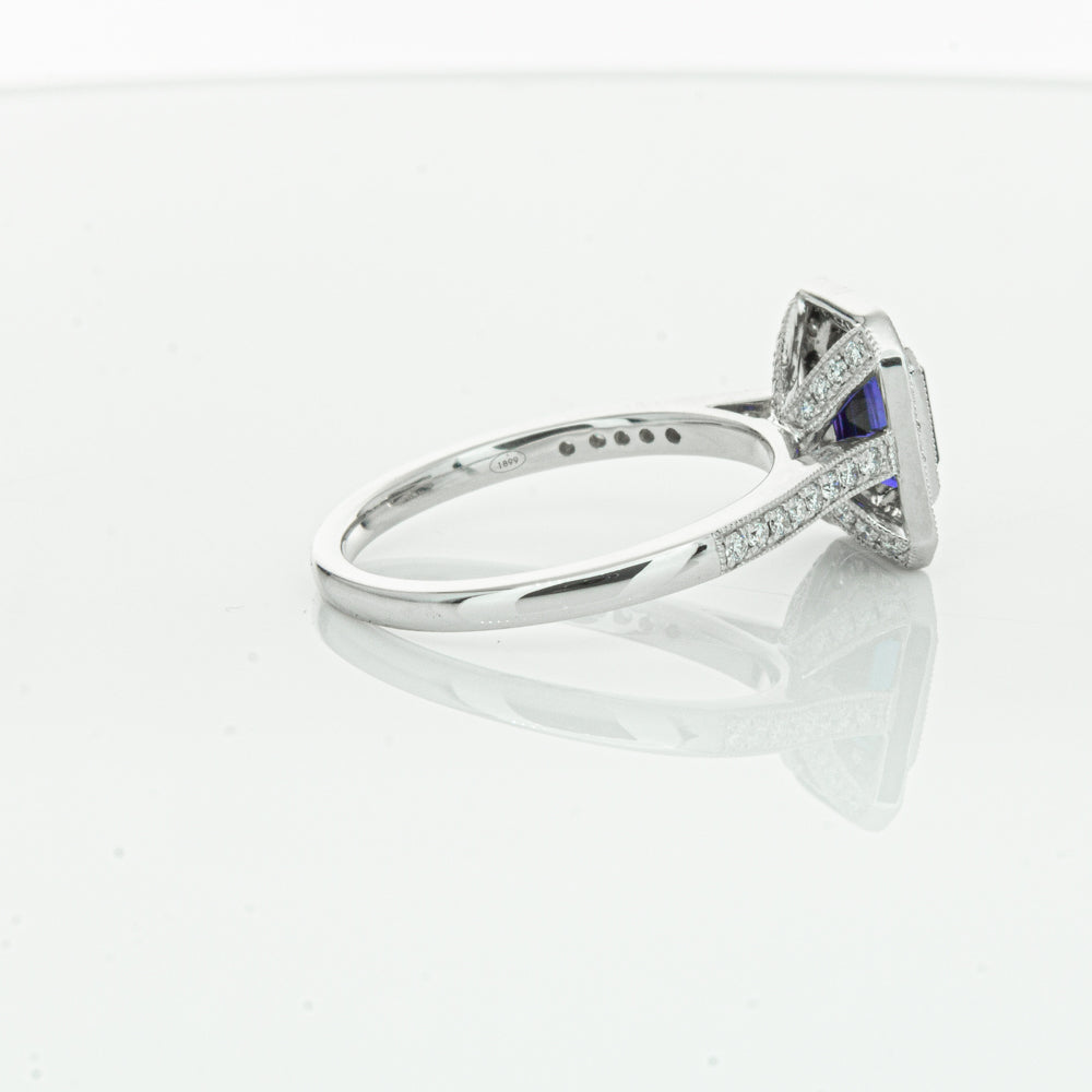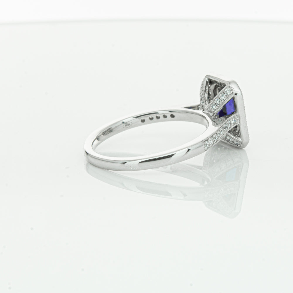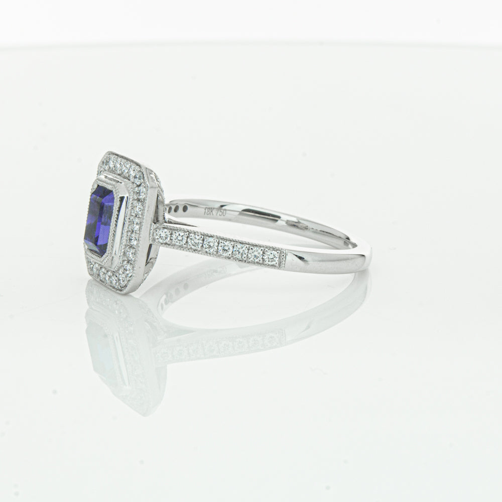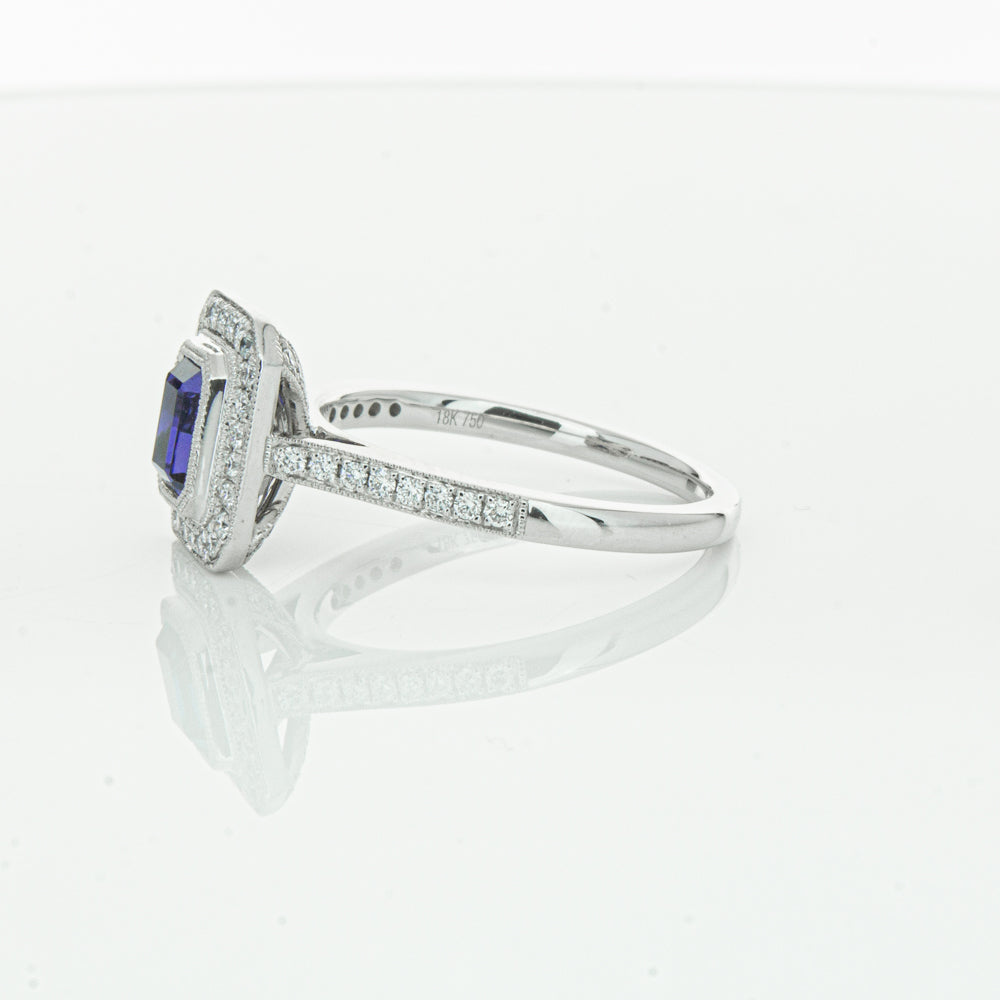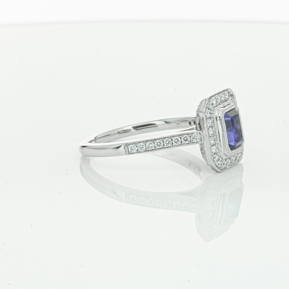 A timeless classic, you will cherish this elegant sapphire and diamond ring. This piece boasts a strong blue sapphire with a millgrain diamond halo and is carefully set in 18ct white gold from our signature 1899 collection.
