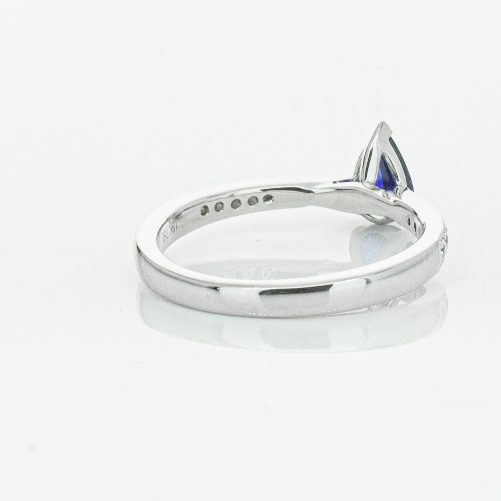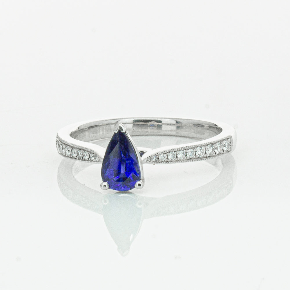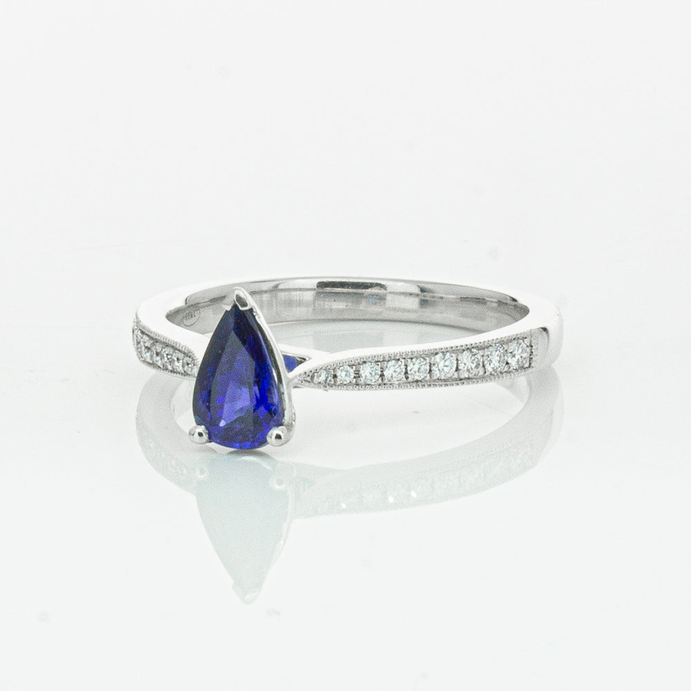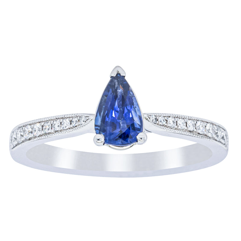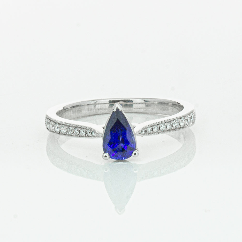 You will light up when you sees this mesmerising sapphire and diamond Zenith ring. Crafted to perfection in 18ct white gold this elegant ring boasts a six claw set pear faceted sapphire which rests on sleek diamond set shoulders.
