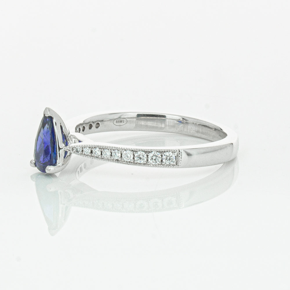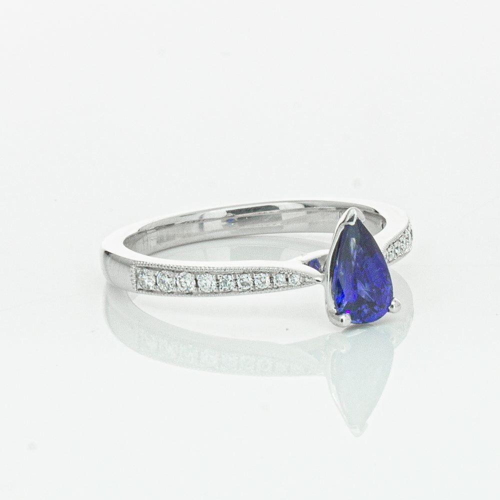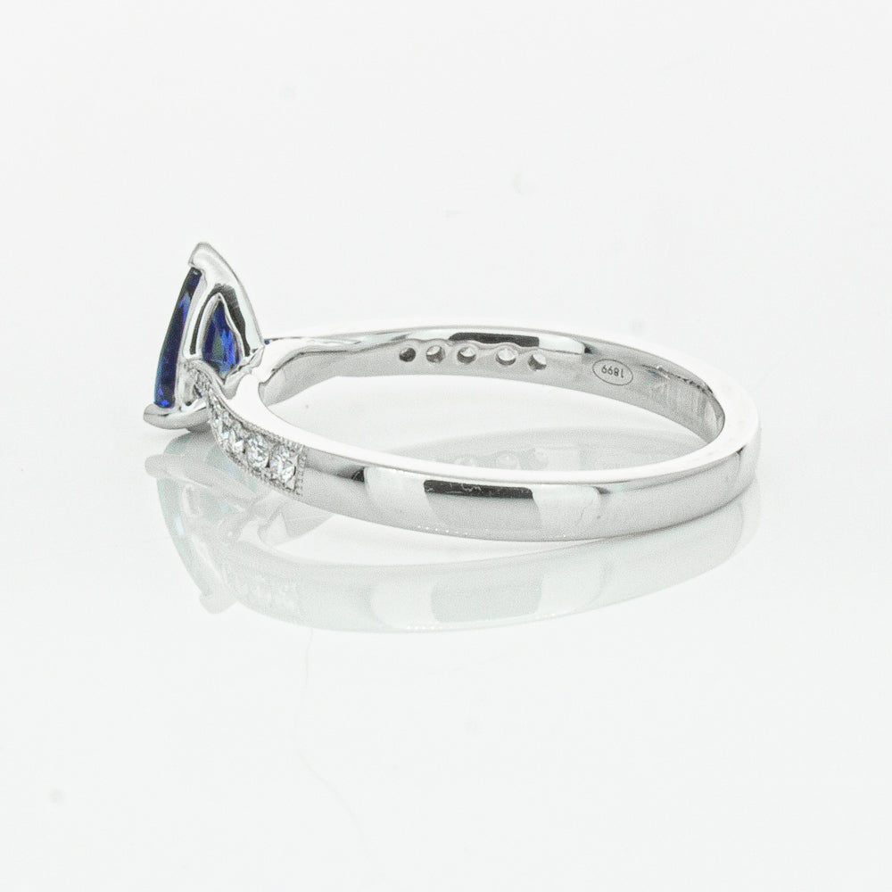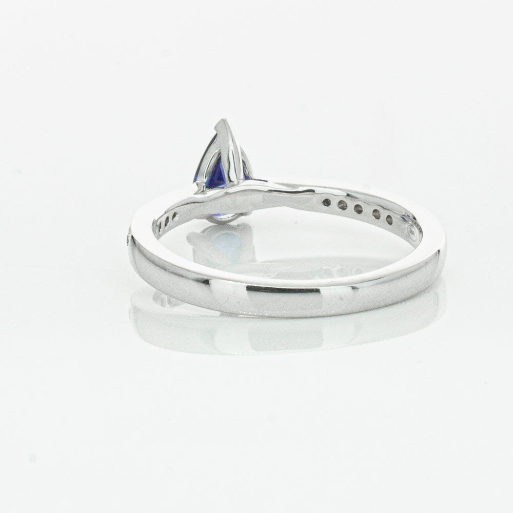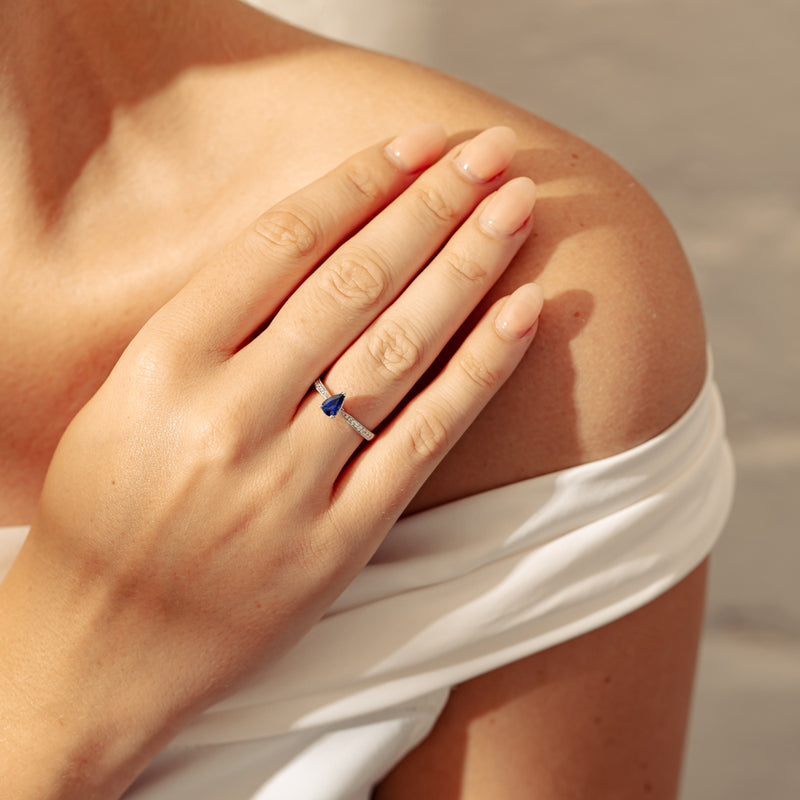 You will light up when you sees this mesmerising sapphire and diamond Zenith ring. Crafted to perfection in 18ct white gold this elegant ring boasts a six claw set pear faceted sapphire which rests on sleek diamond set shoulders.