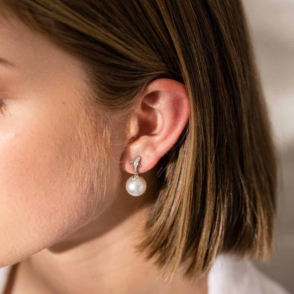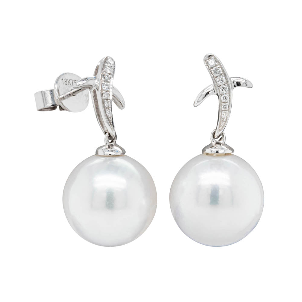 Light up the room in these glistening south sea pearl and diamond kiss earrings! The perfect accessory for that special occasion, these spectacular earrings are sure to receive many compliments. Crafted from luxurious 18ct white gold, this precious pair boasts two south sea pearls resting from a set diamond mount. Go on, spoil yourself!