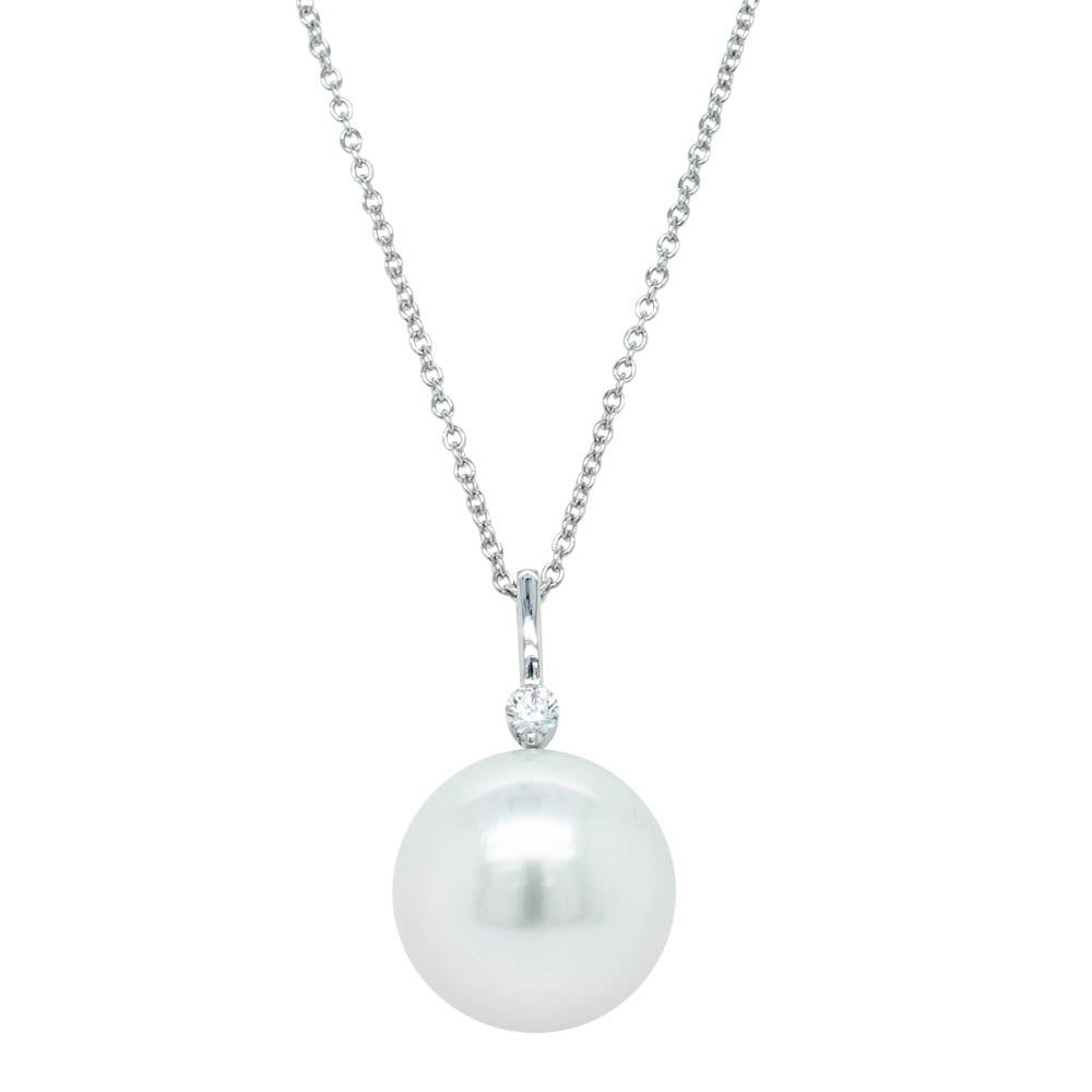 Surprise a loved one with this sophisticated pearl and diamond pendant. This elegant piece features a cultured south sea pearl and swings from a diamond set peg mount. Your loved one will cherish this staple piece forever.