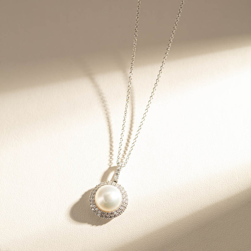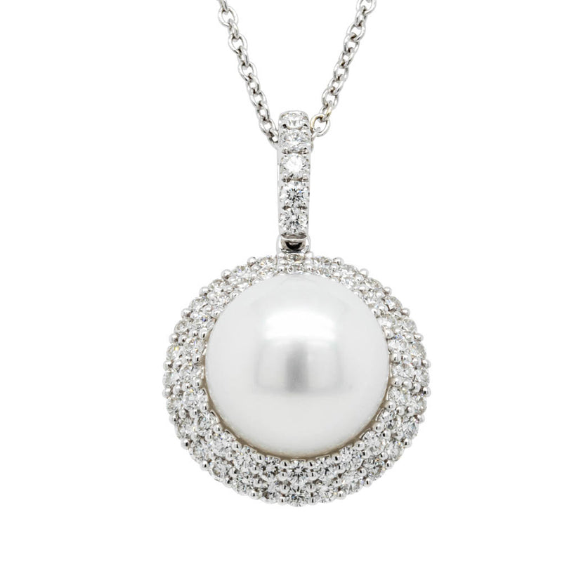 She will fall in love with this luxurious pearl and diamond pendant. Carefully crafted in beautiful 18ct white gold this piece boats a gorgeous south sea pearl which is framed by a cluster of round brilliant cut diamonds. This piece is sure to put a sparkle in her step!