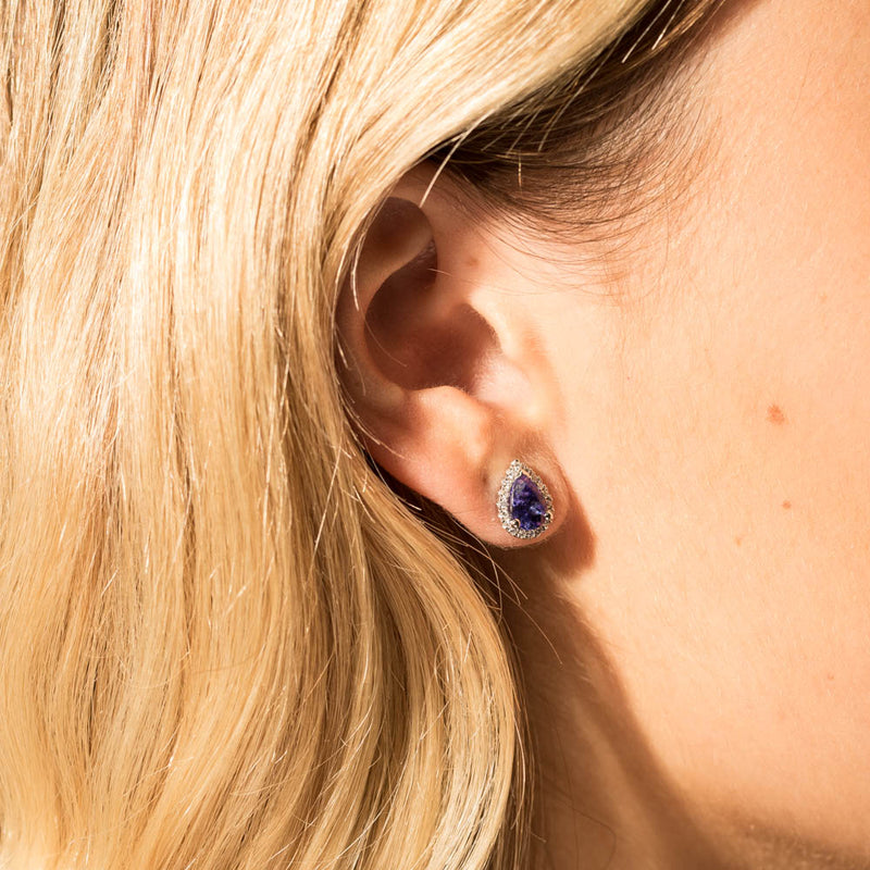18ct white gold earrings feature two pear cut tanzanites framed by a dazzling halo of white diamonds.