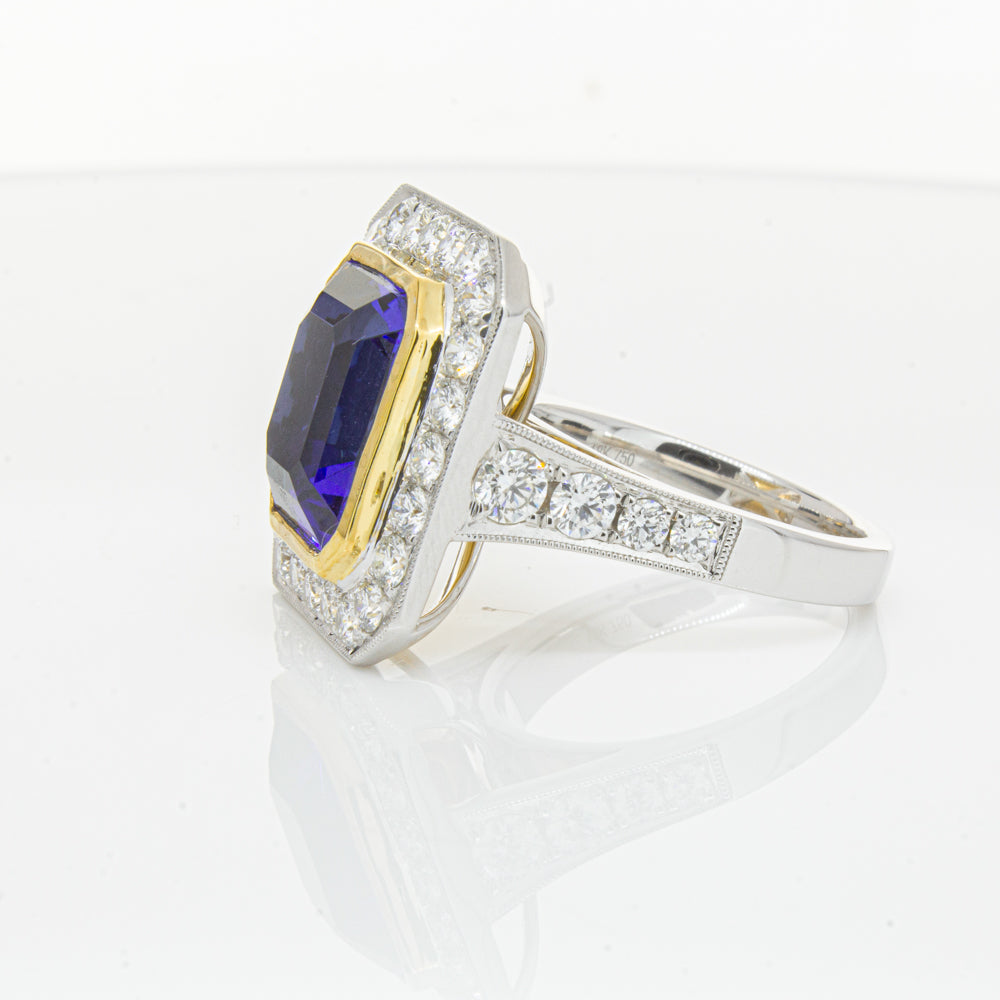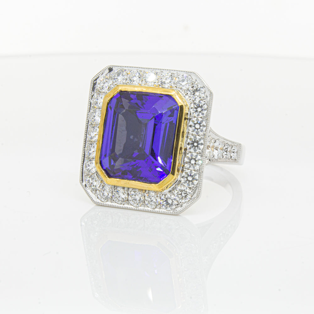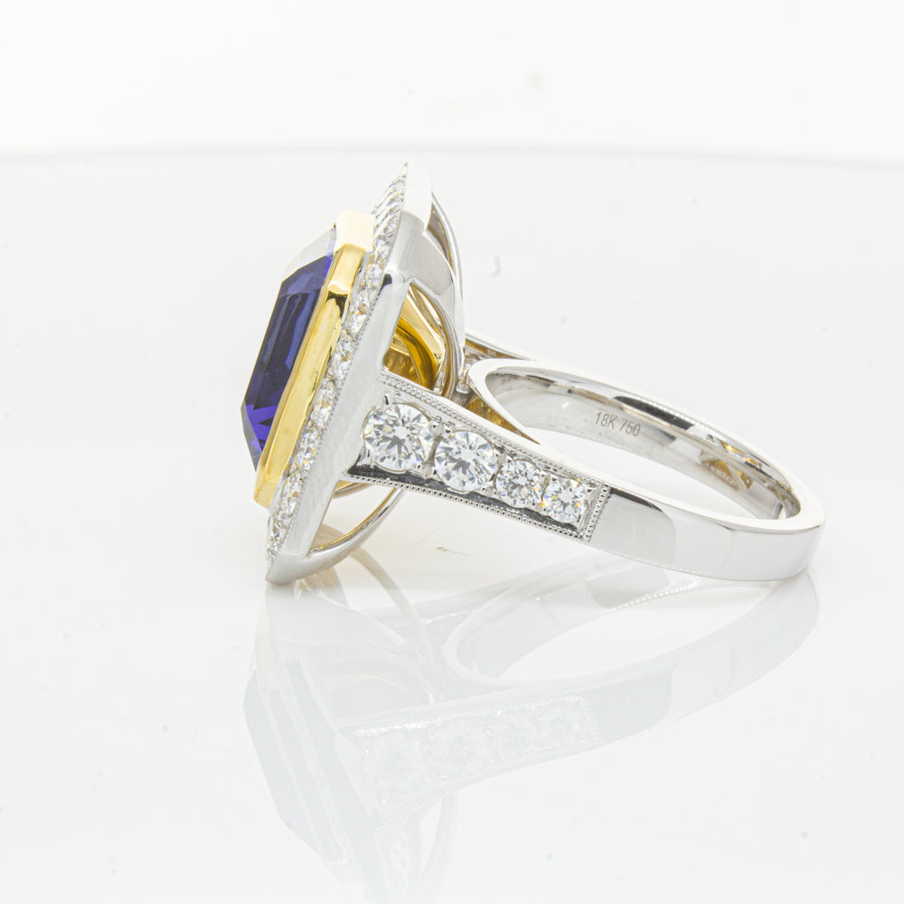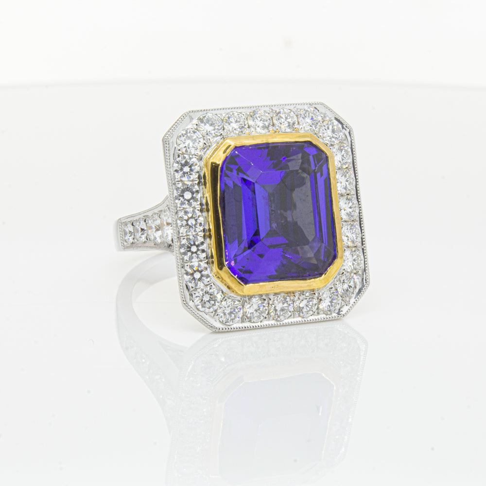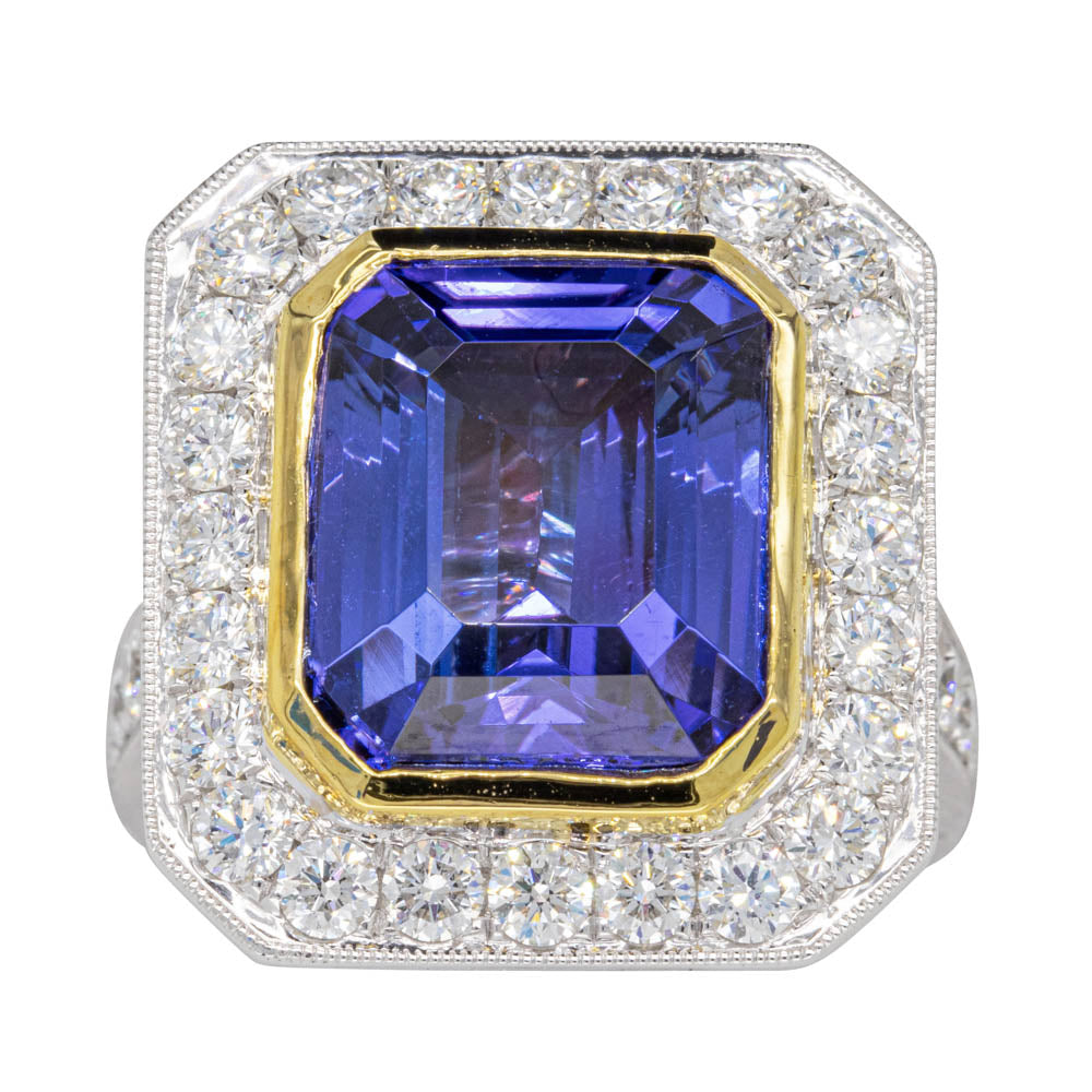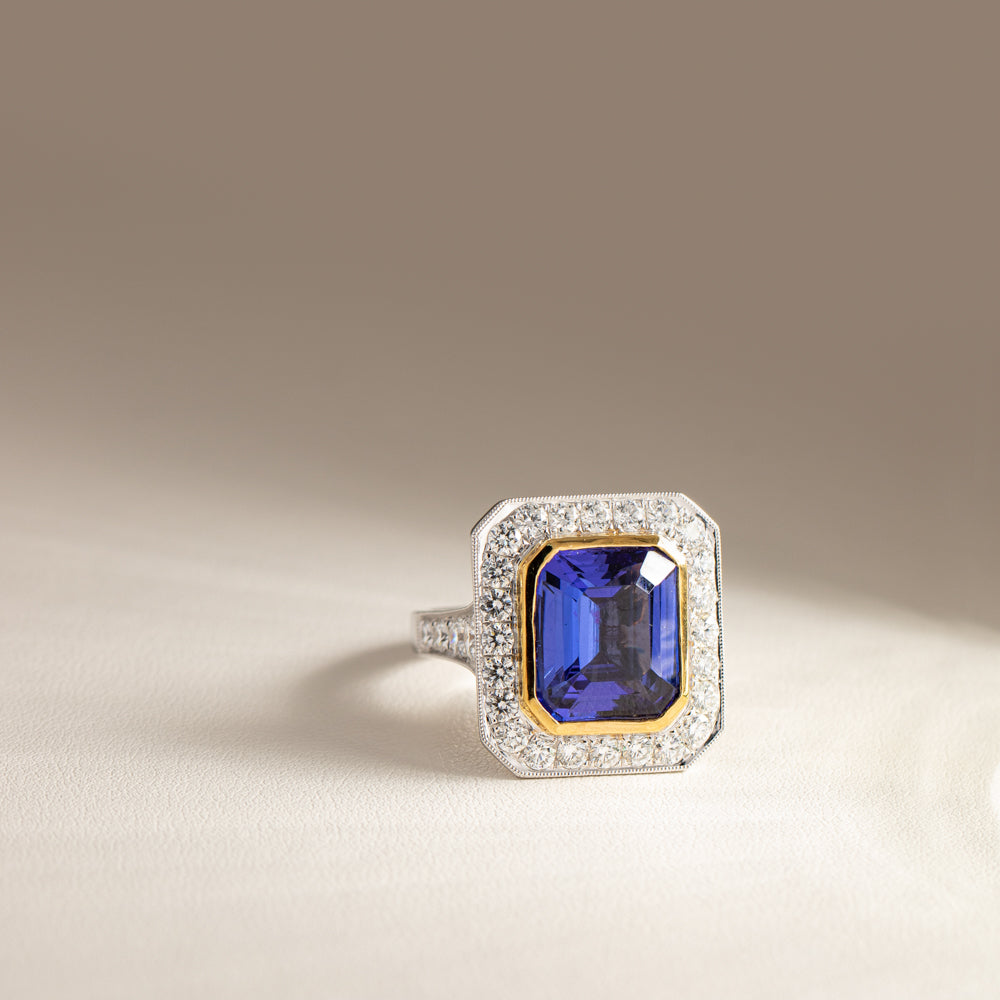 Designed to impress, this exquisite tanzanite and diamond ring will leave you speechless. This sophisticated ring boasts a shimmering deep violet-blue tanzanite set in 18ct white and yellow gold with a step cut shaped diamond halo.