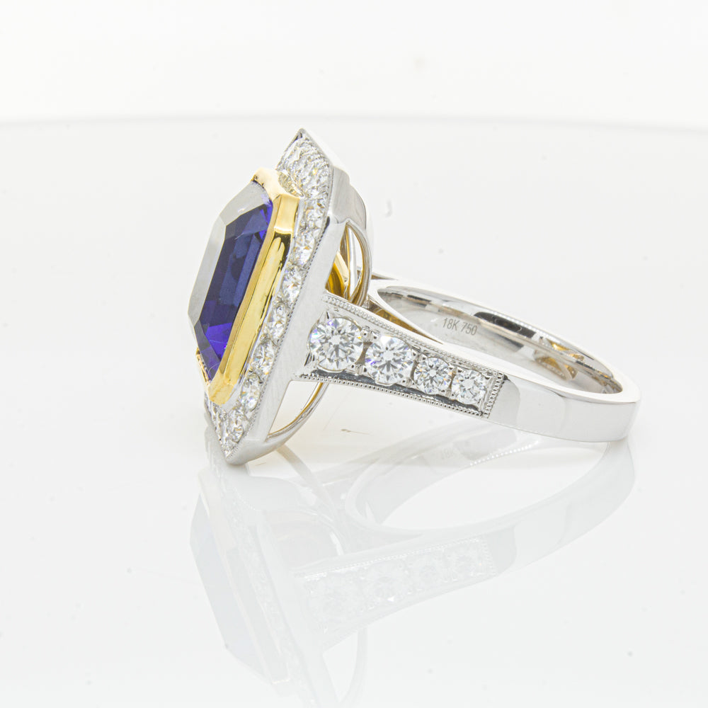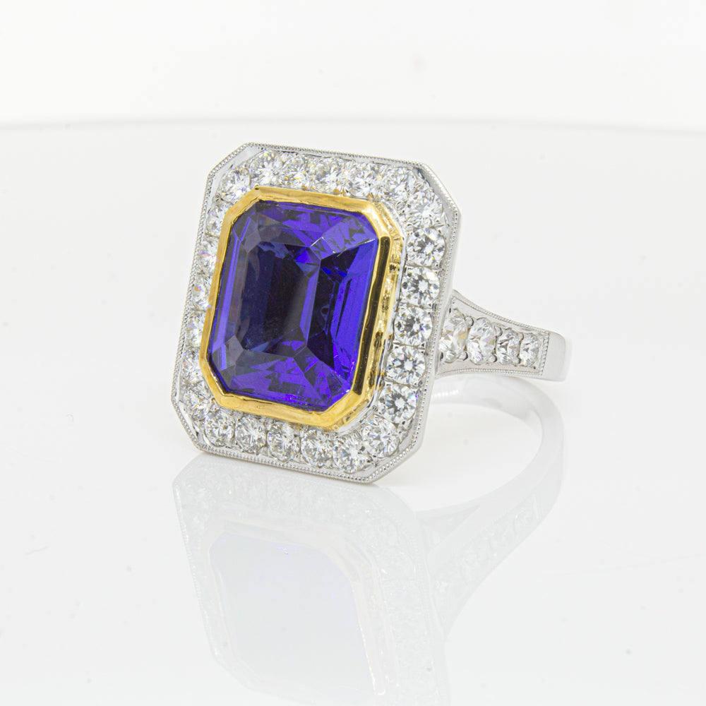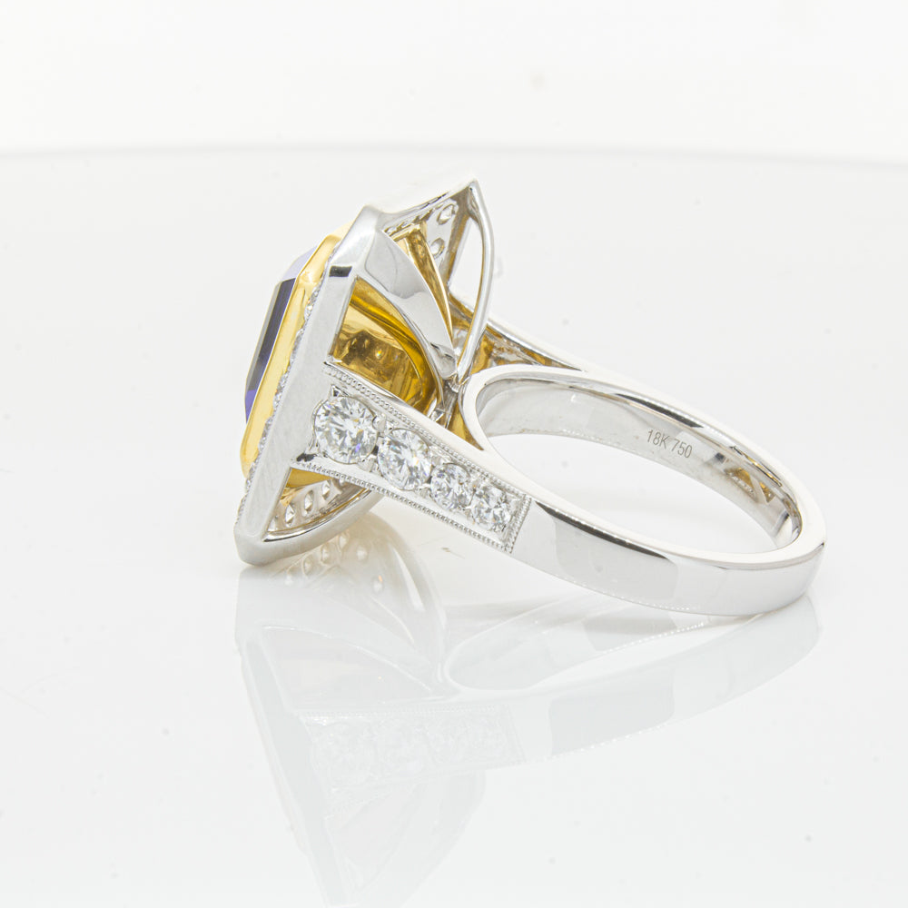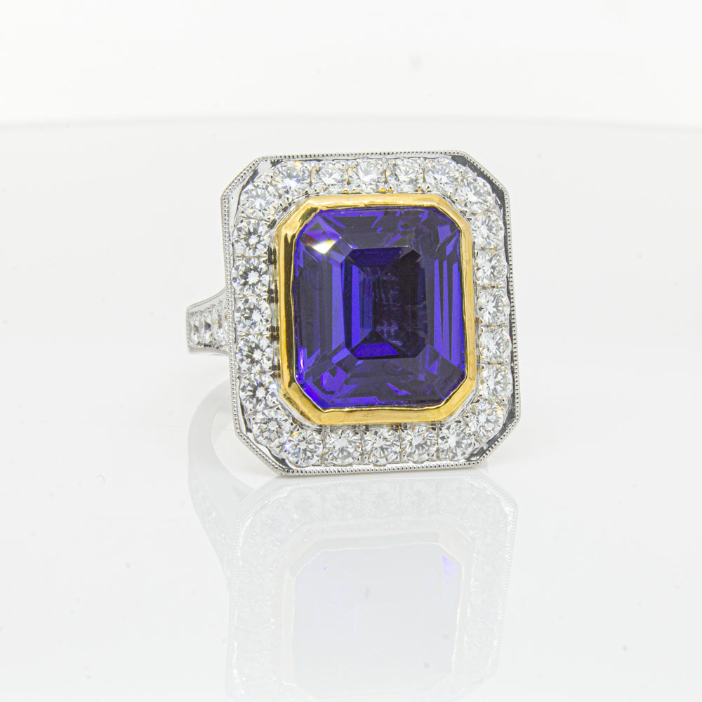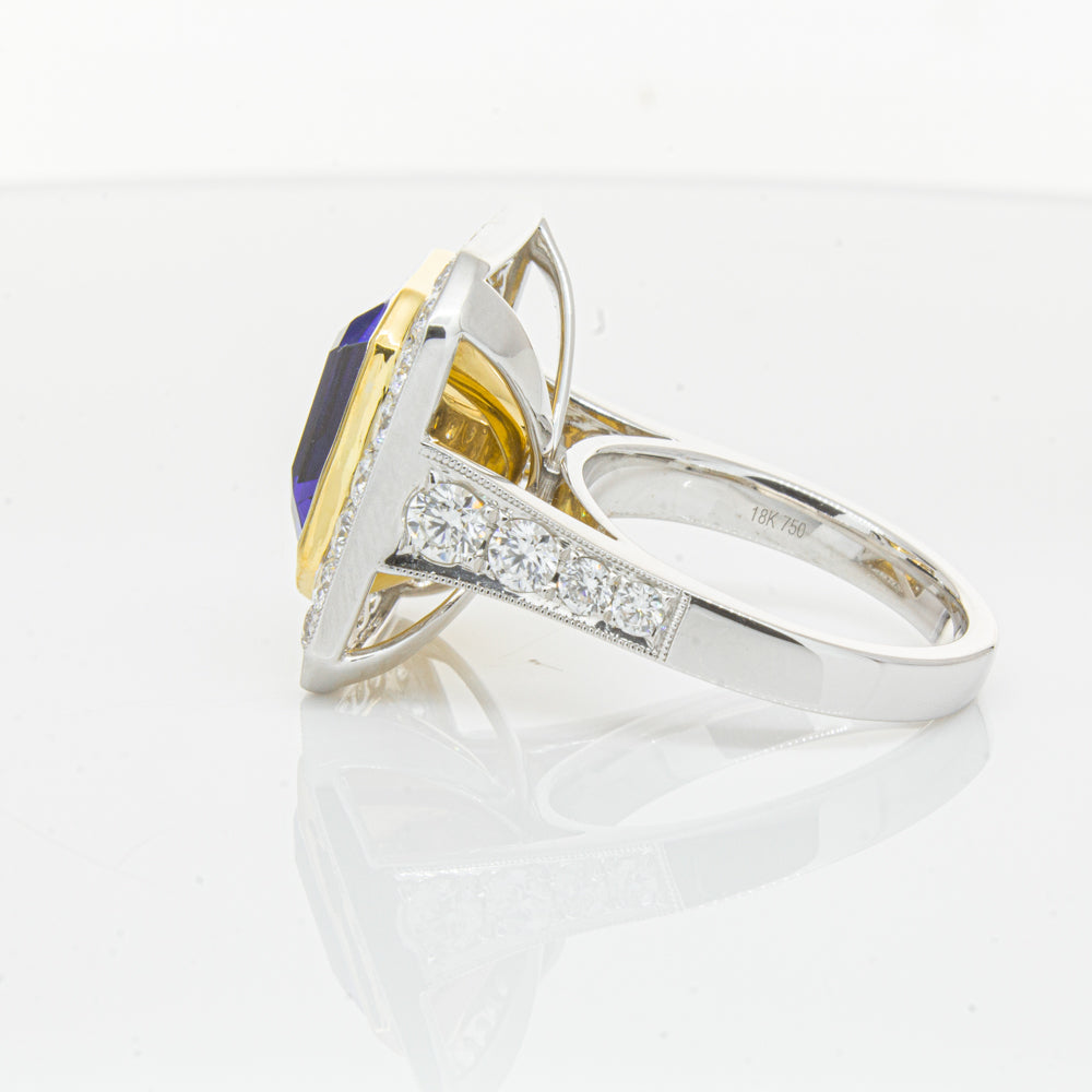 Designed to impress, this exquisite tanzanite and diamond ring will leave you speechless. This sophisticated ring boasts a shimmering deep violet-blue tanzanite set in 18ct white and yellow gold with a step cut shaped diamond halo.
