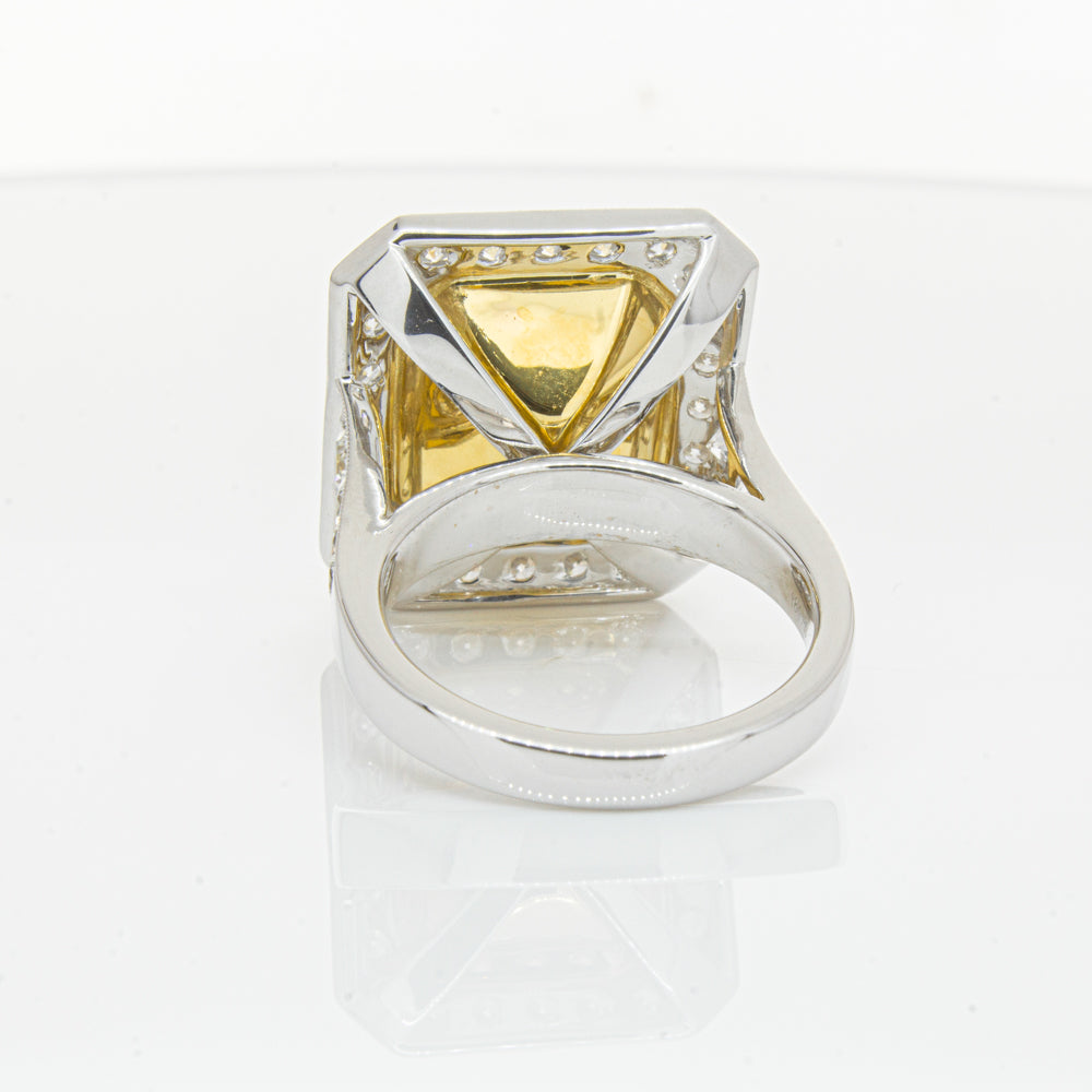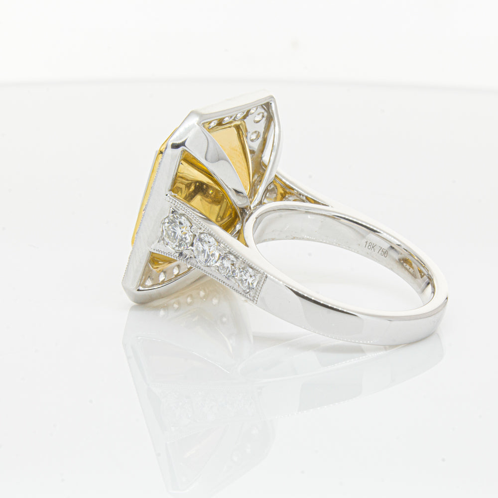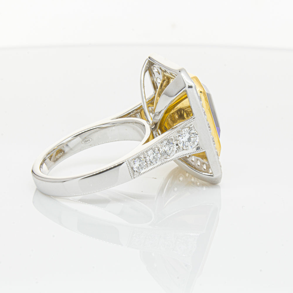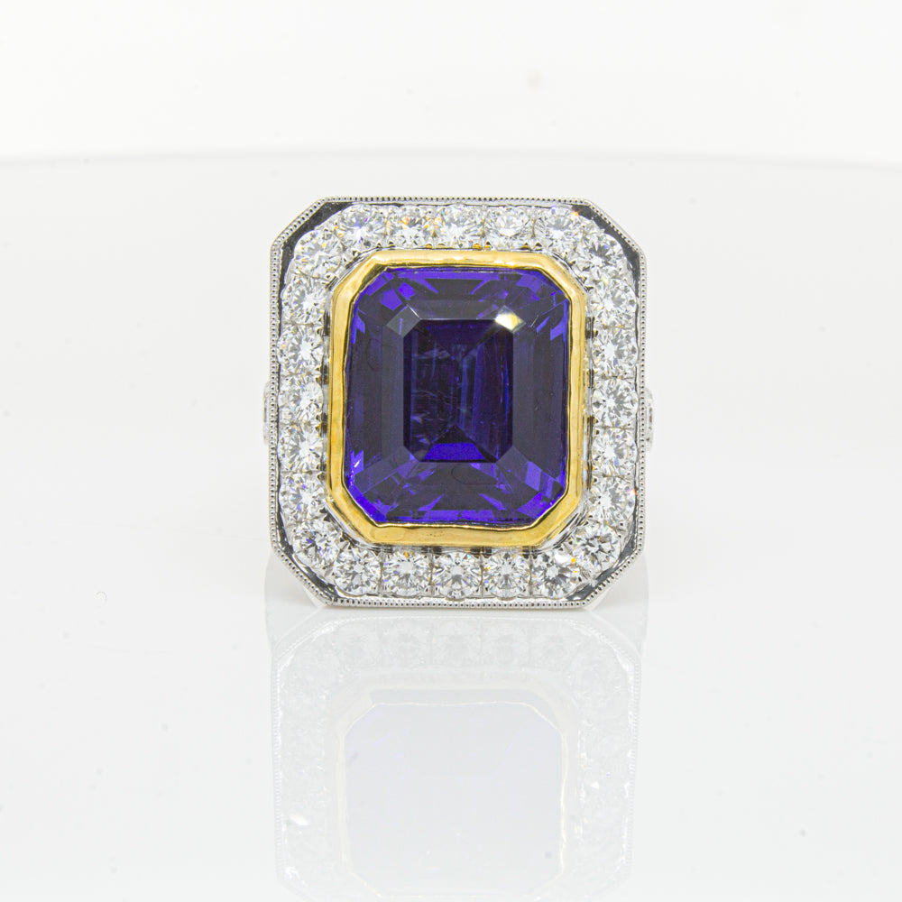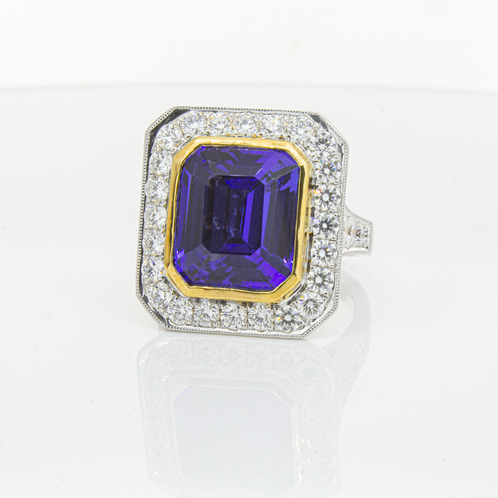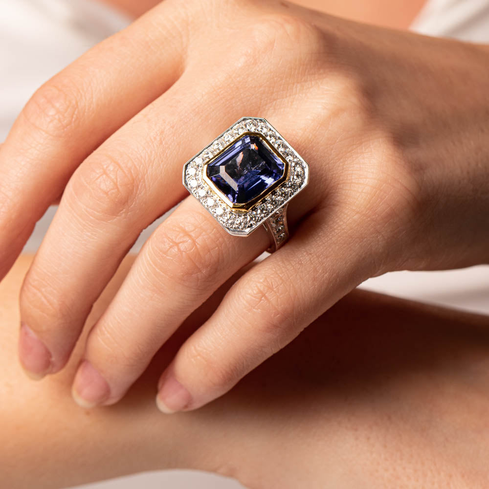 Designed to impress, this exquisite tanzanite and diamond ring will leave you speechless. This sophisticated ring boasts a shimmering deep violet-blue tanzanite set in 18ct white and yellow gold with a step cut shaped diamond halo.