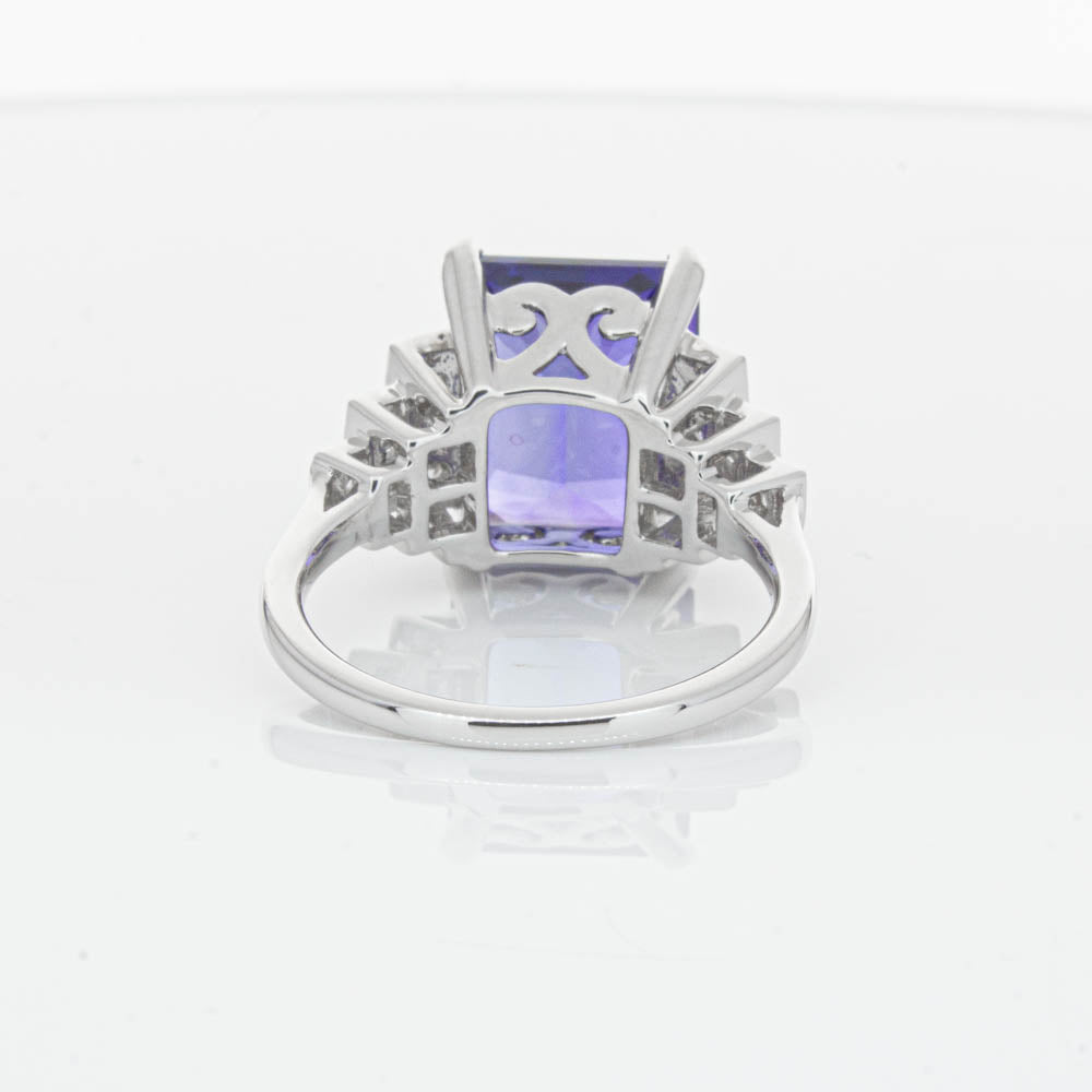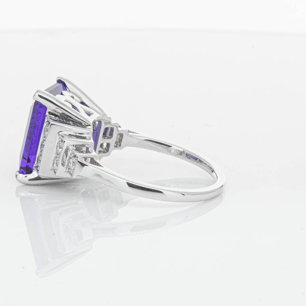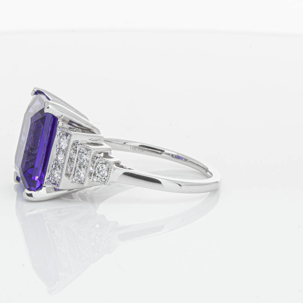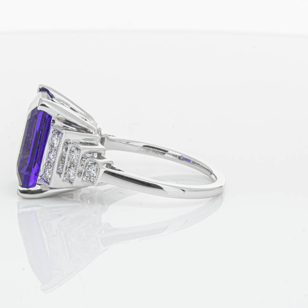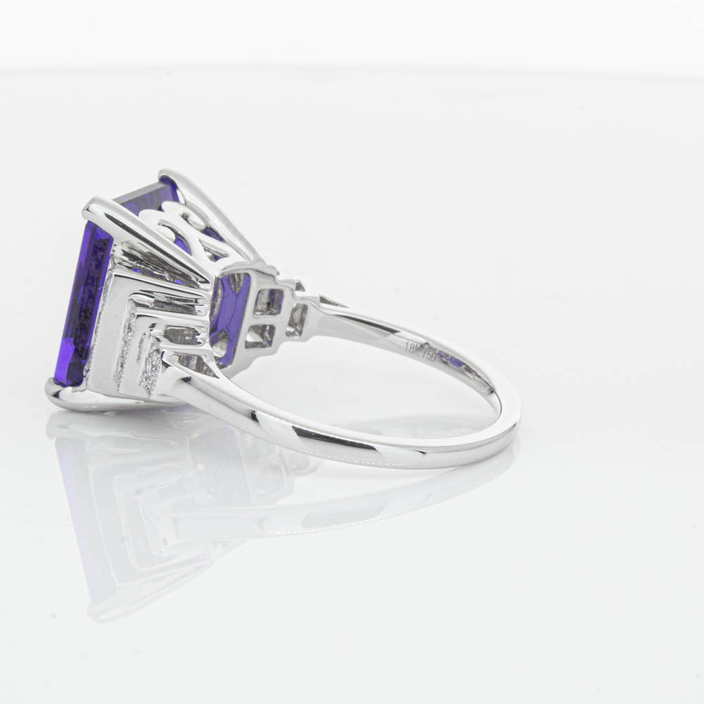 Carefully crafted in 18ct white gold, this Maya ring features one rectangular step cut tanzanite from Tanzania set in an 18ct white gold setting with twelve round brilliant cut dazzling white diamonds.
