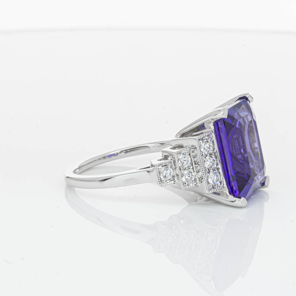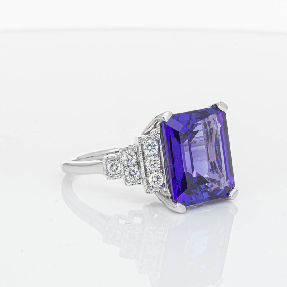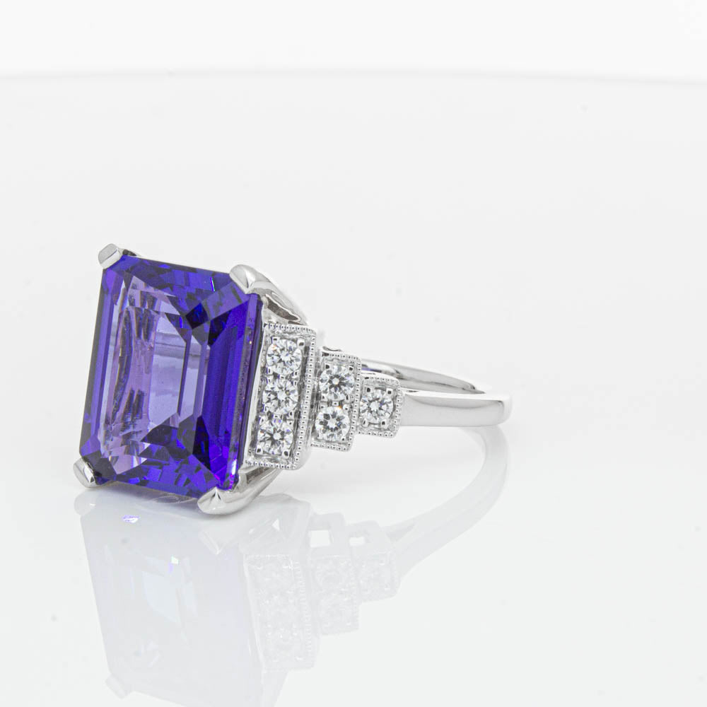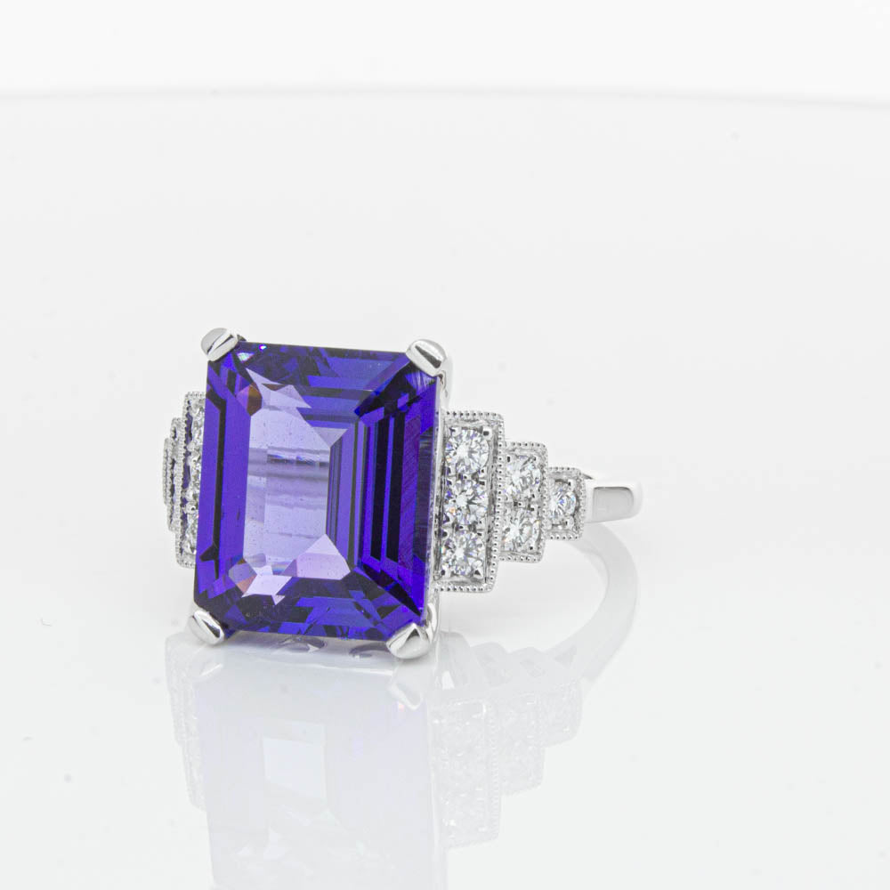 Carefully crafted in 18ct white gold, this Maya ring features one rectangular step cut tanzanite from Tanzania set in an 18ct white gold setting with twelve round brilliant cut dazzling white diamonds.