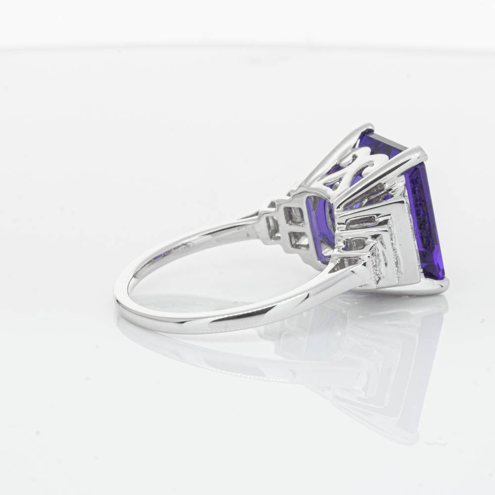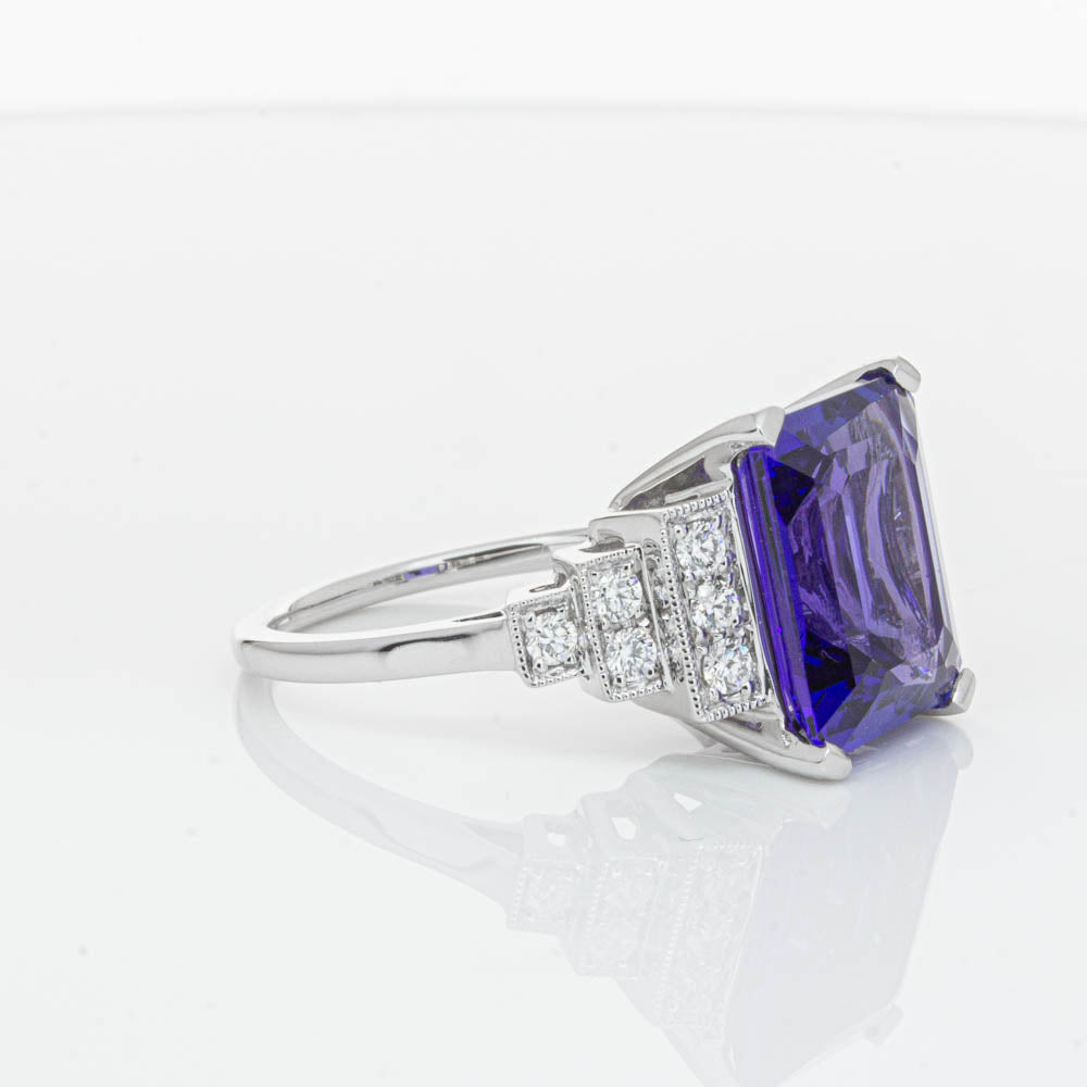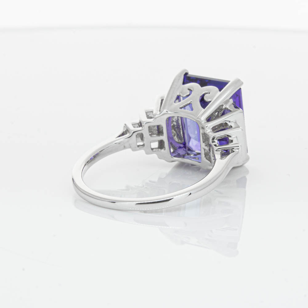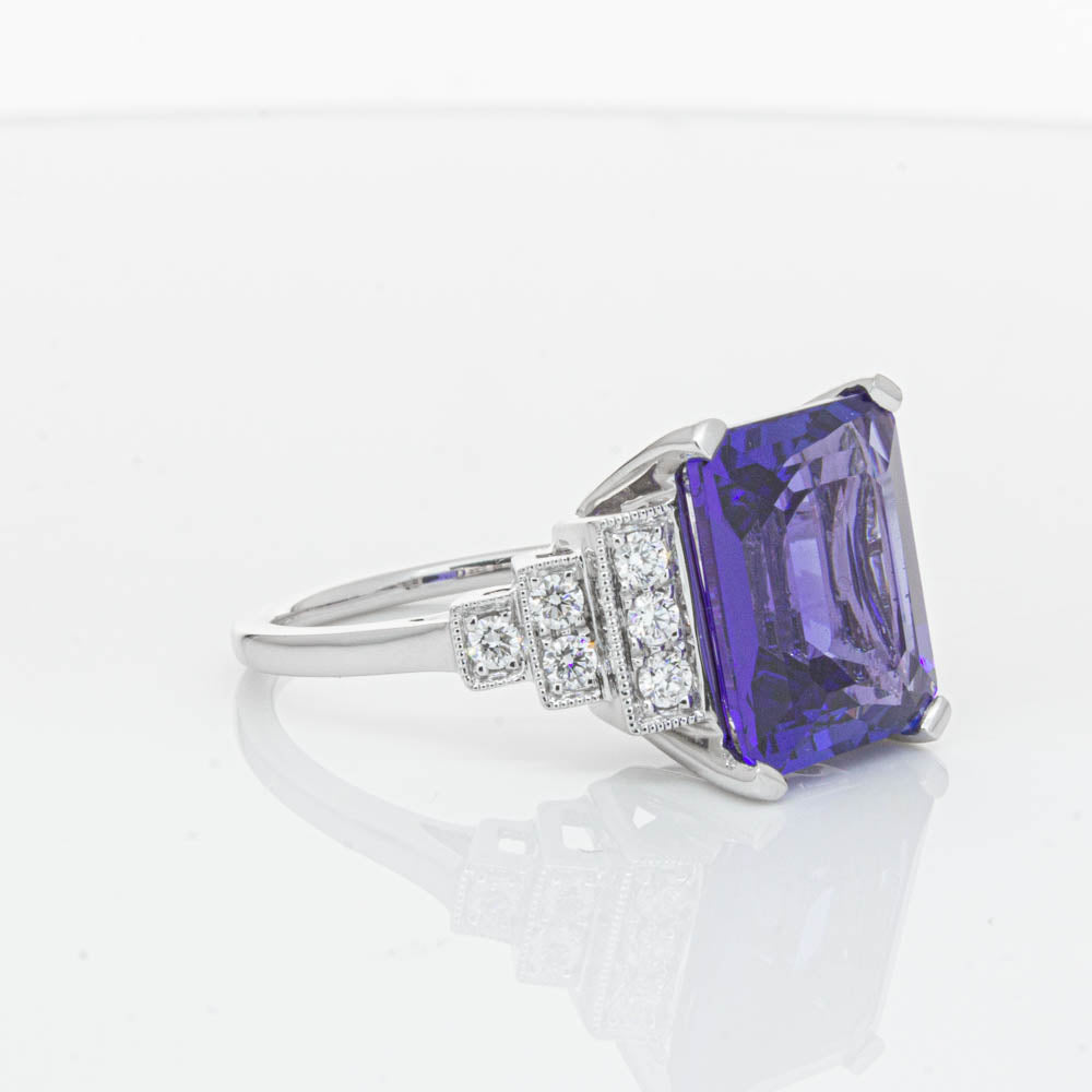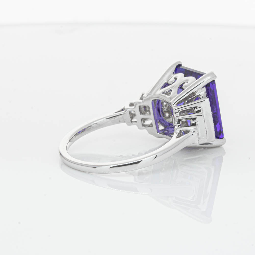 Carefully crafted in 18ct white gold, this Maya ring features one rectangular step cut tanzanite from Tanzania set in an 18ct white gold setting with twelve round brilliant cut dazzling white diamonds.