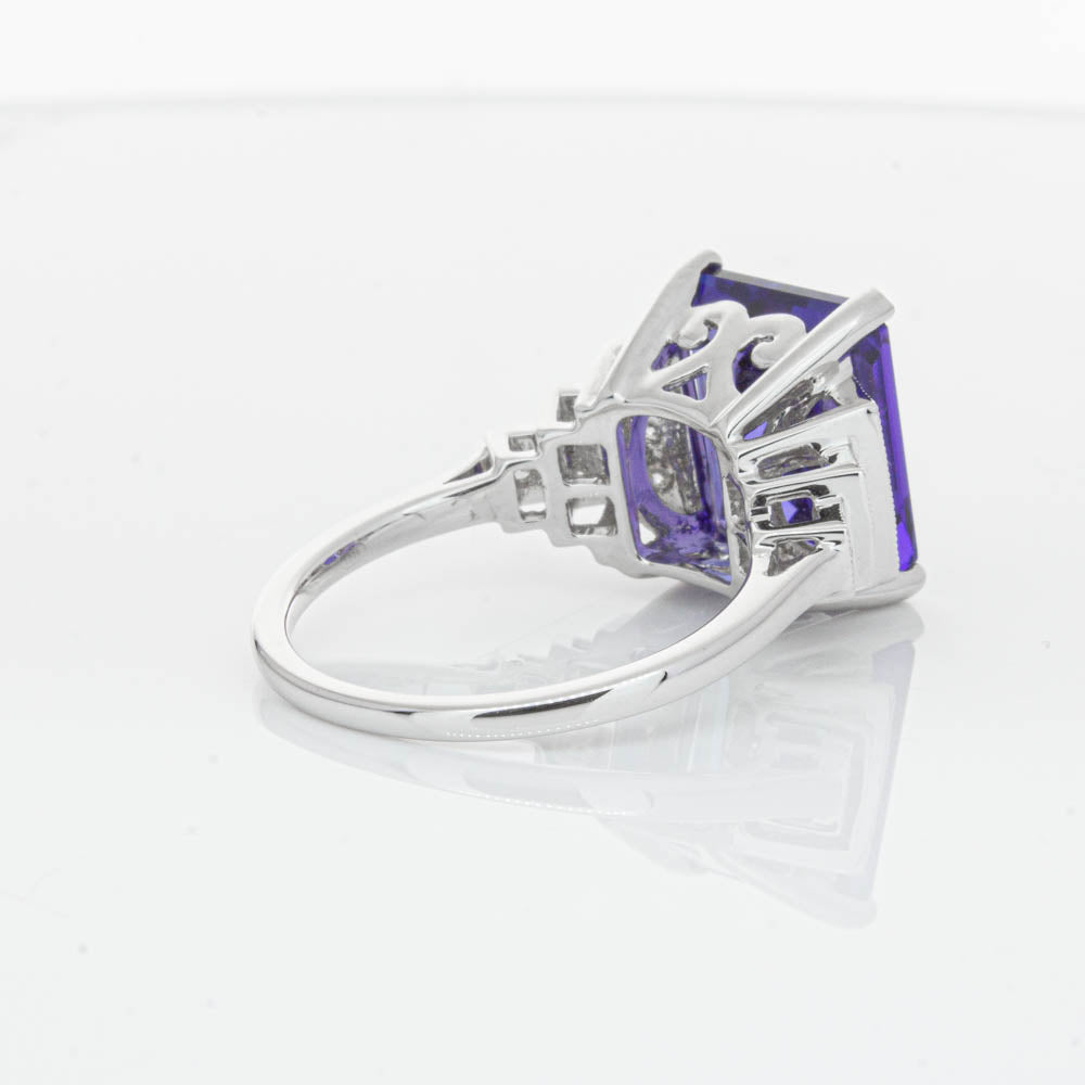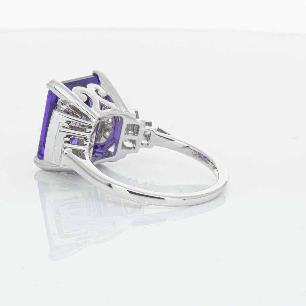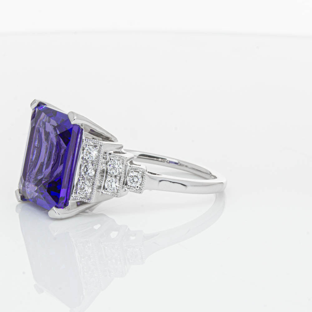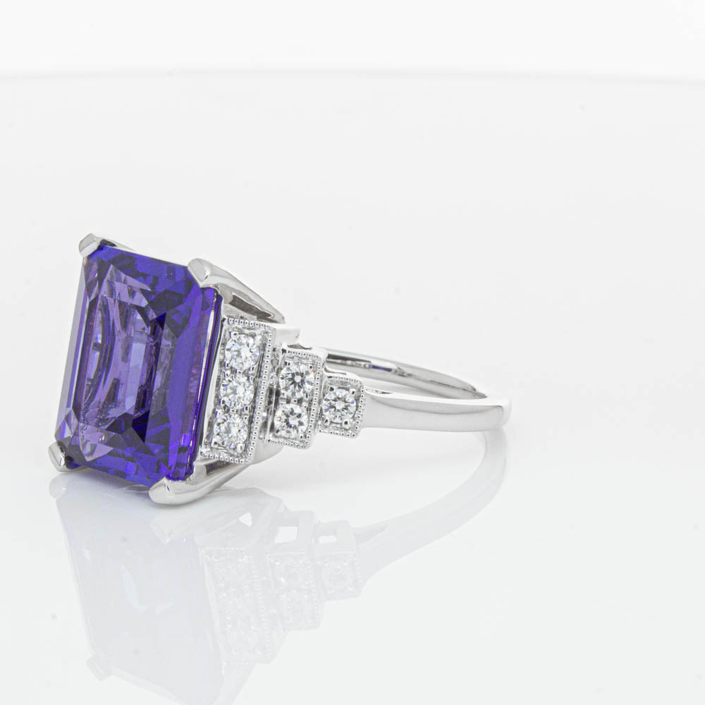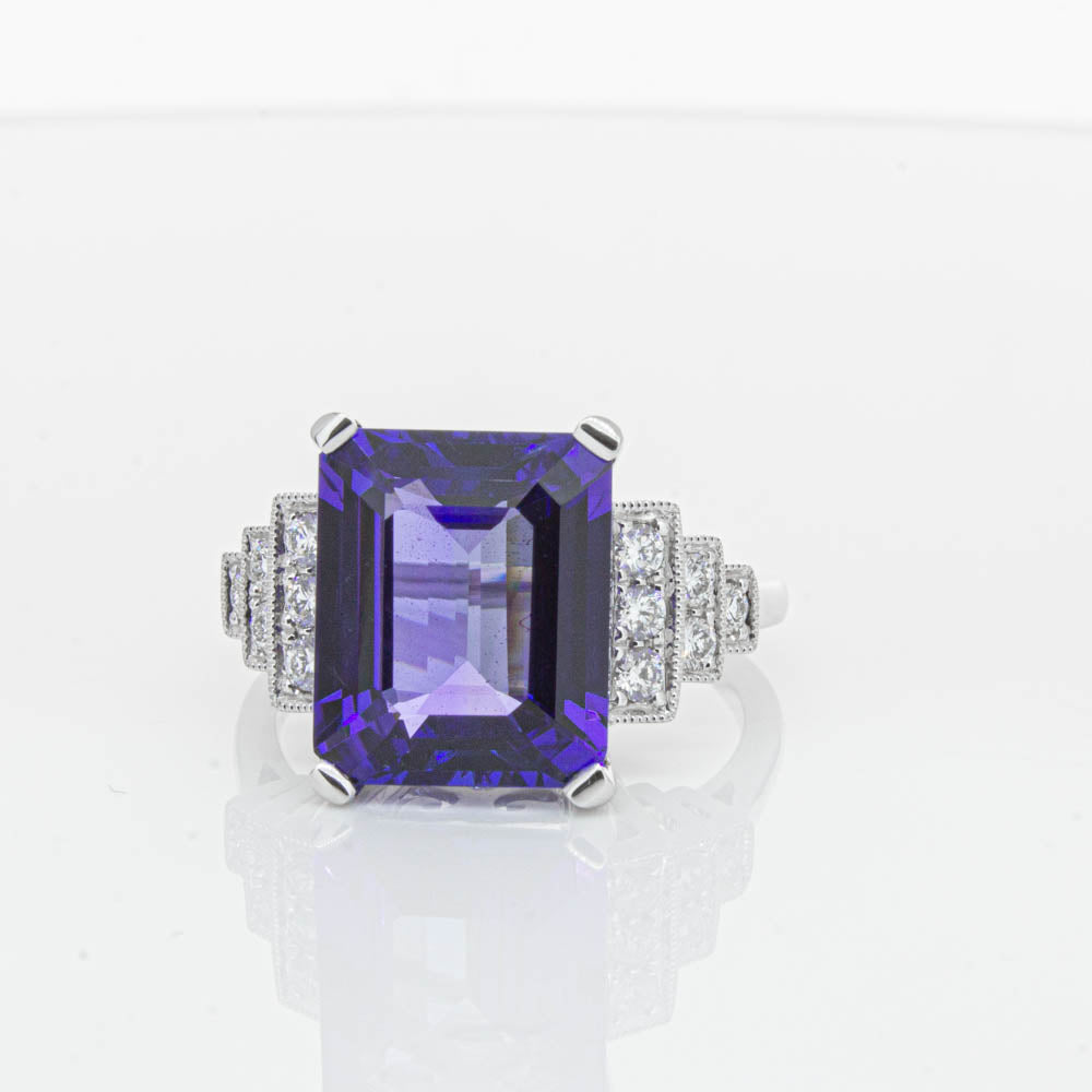 Carefully crafted in 18ct white gold, this Maya ring features one rectangular step cut tanzanite from Tanzania set in an 18ct white gold setting with twelve round brilliant cut dazzling white diamonds.