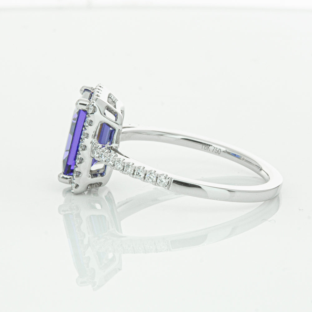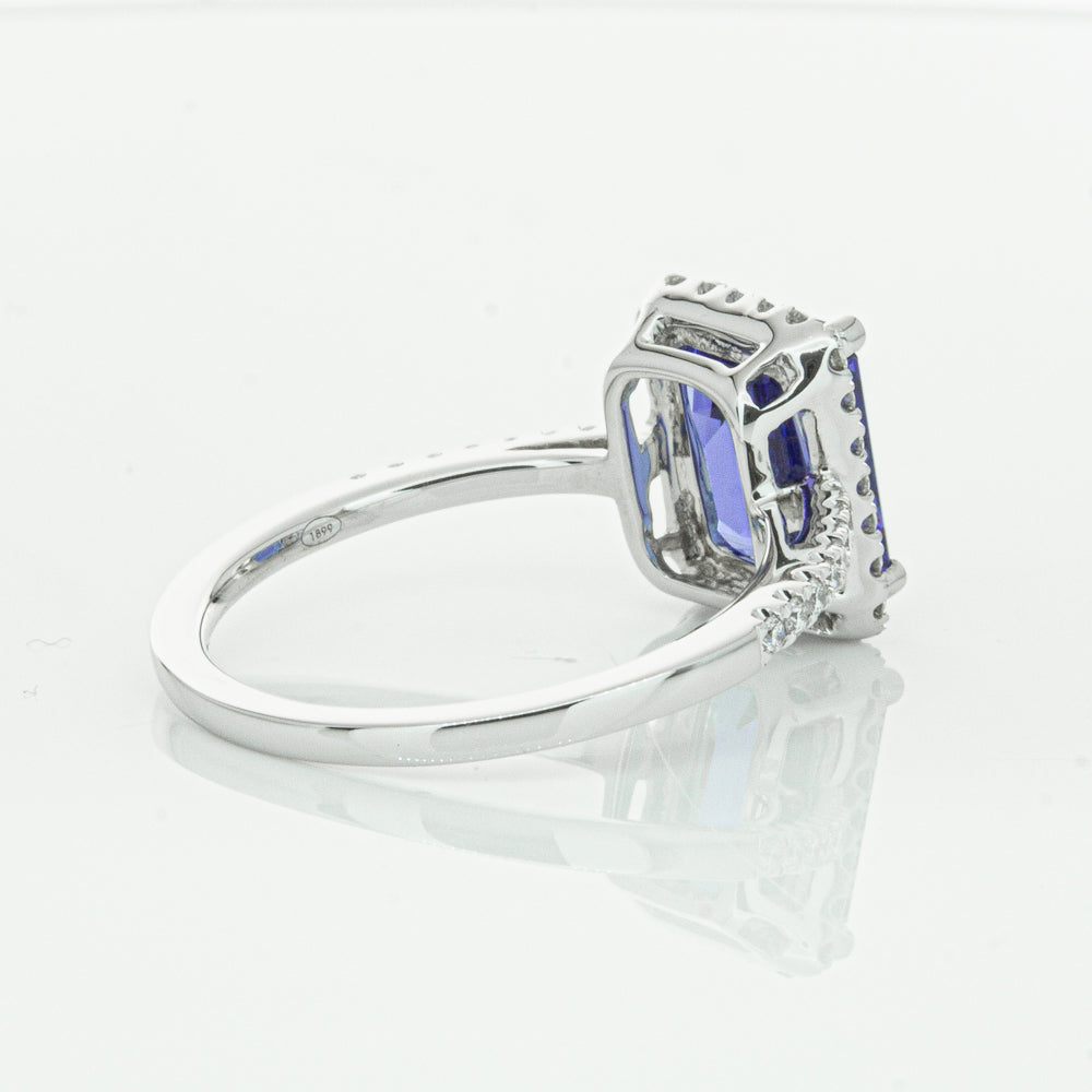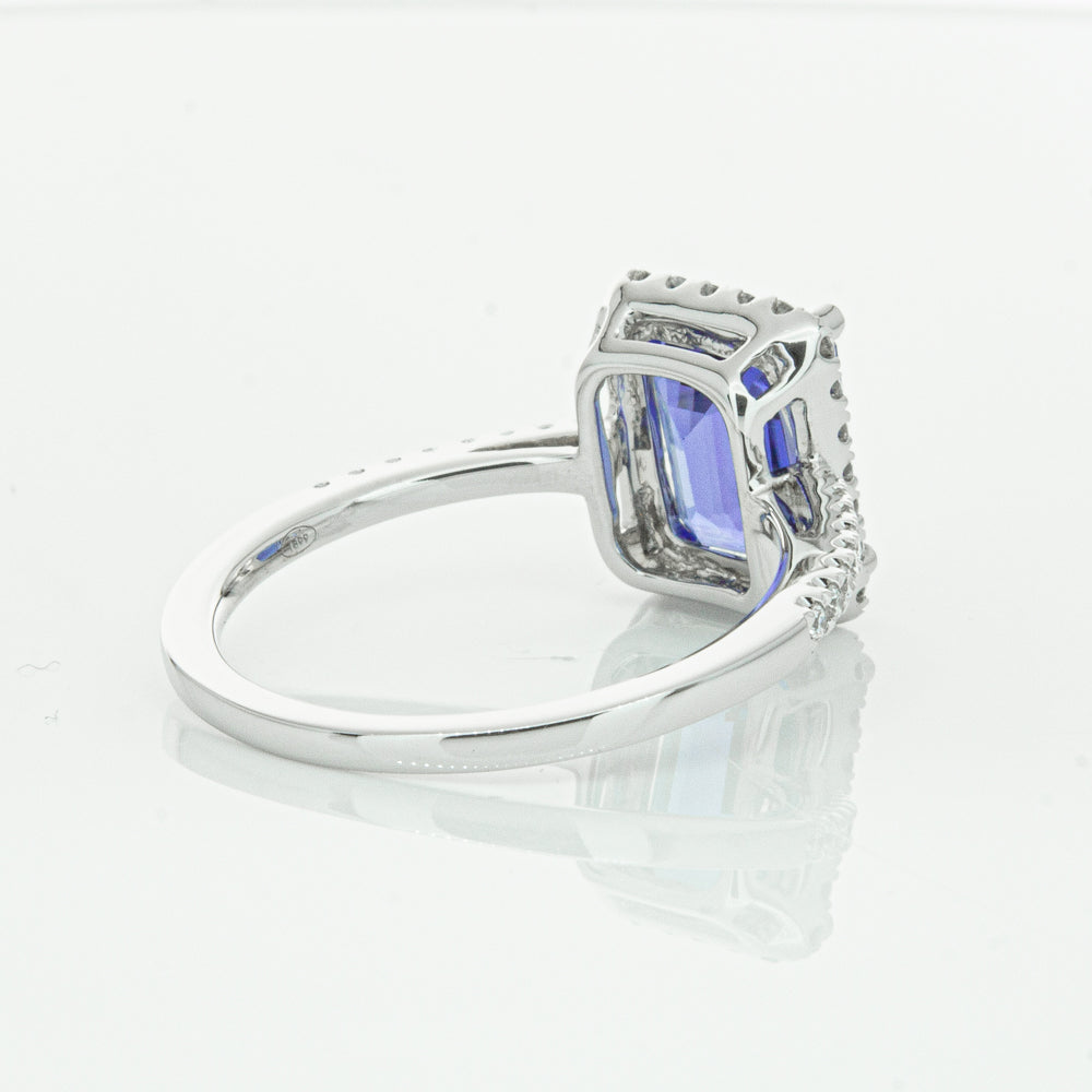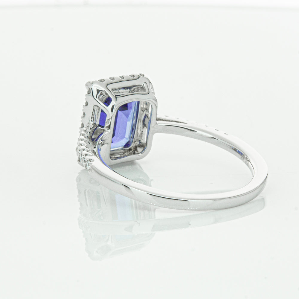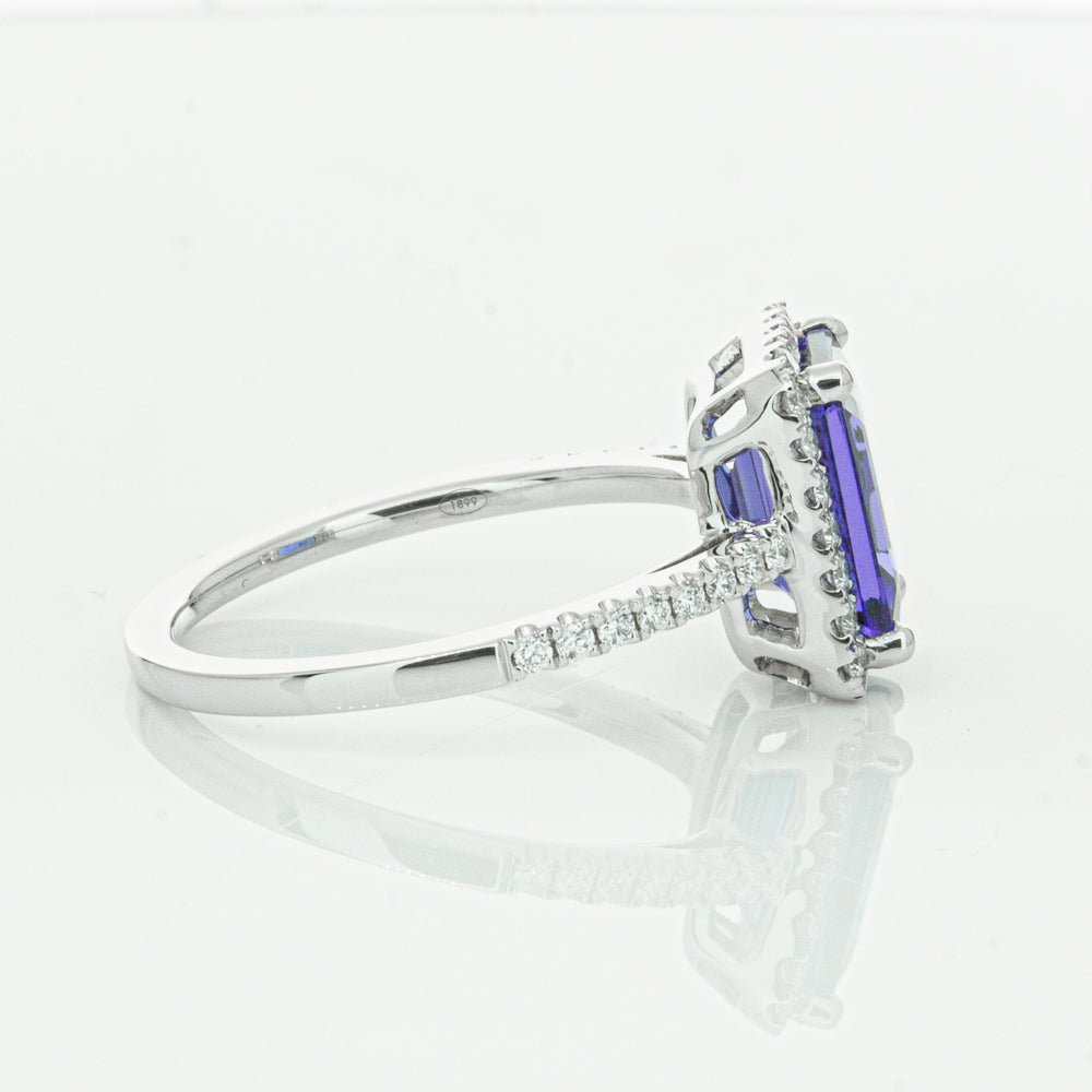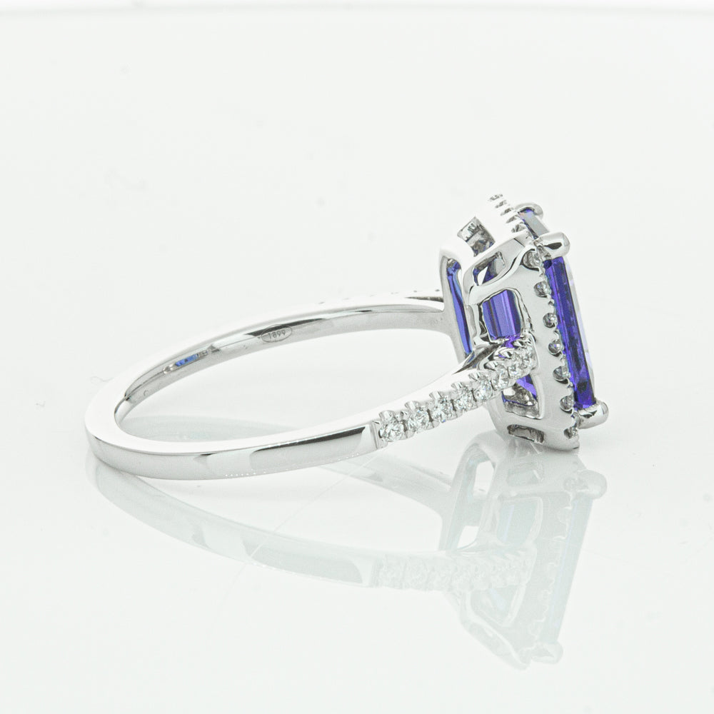 Fall in love with this 18ct white gold ring from our signature 1899 collection featuring one  gorgeous blue rectangular step cut tanzanite framed by a halo of round brilliant cut diamonds with further diamonds along the shoulders.