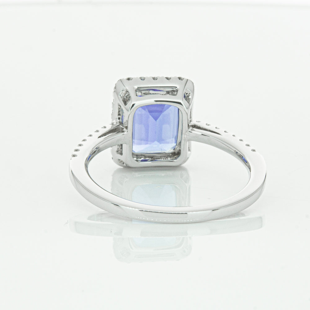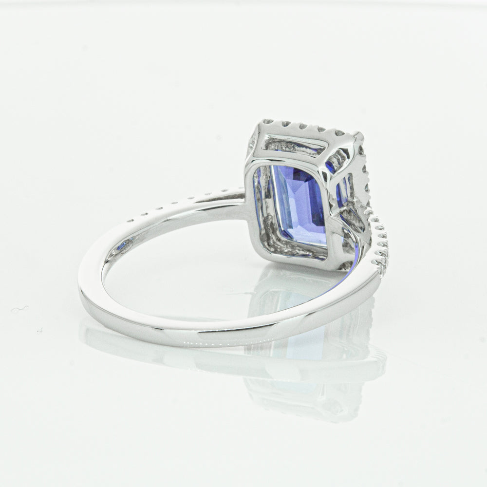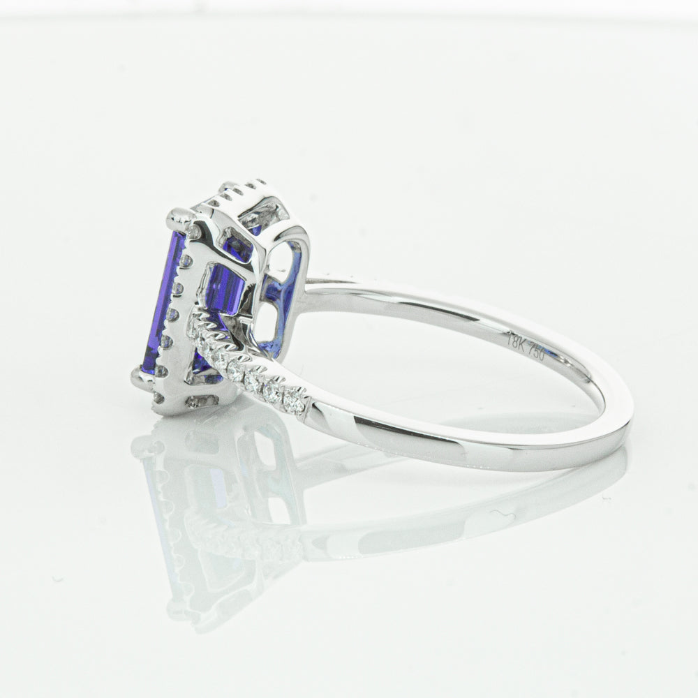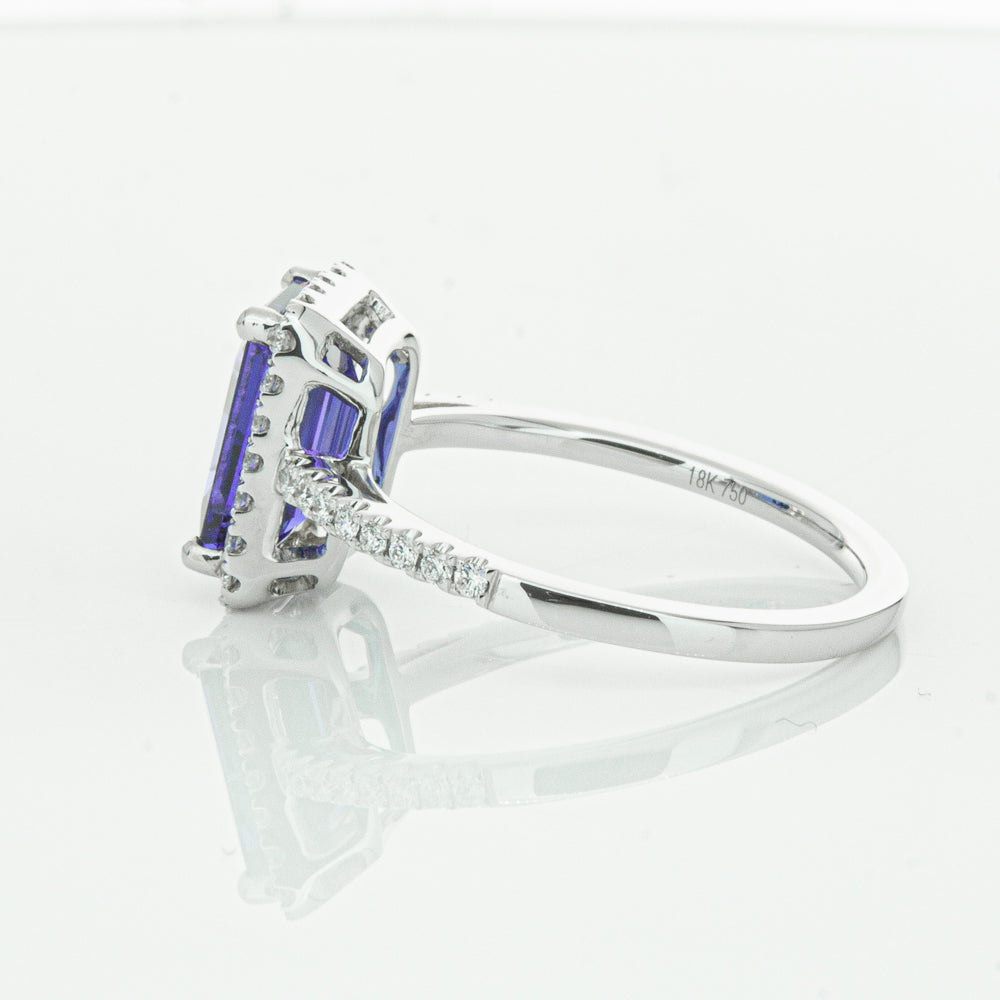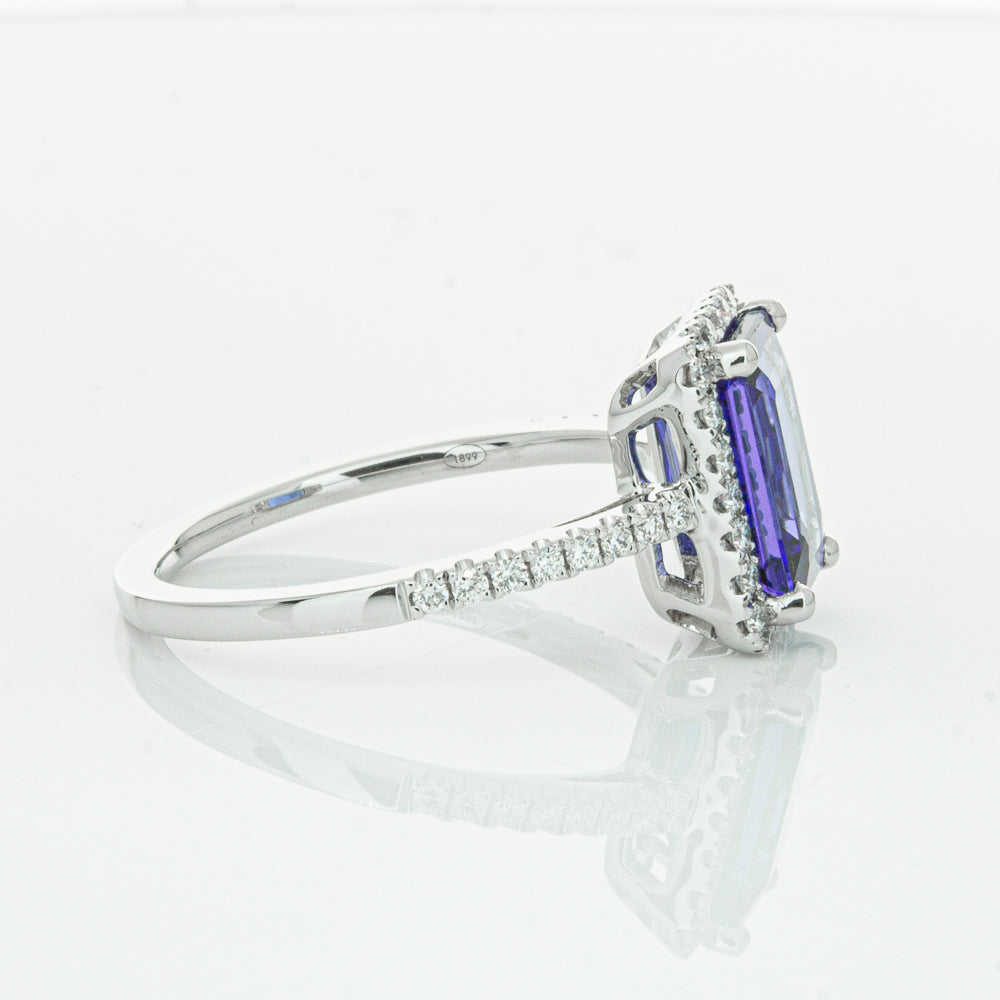 Fall in love with this 18ct white gold ring from our signature 1899 collection featuring one  gorgeous blue rectangular step cut tanzanite framed by a halo of round brilliant cut diamonds with further diamonds along the shoulders.