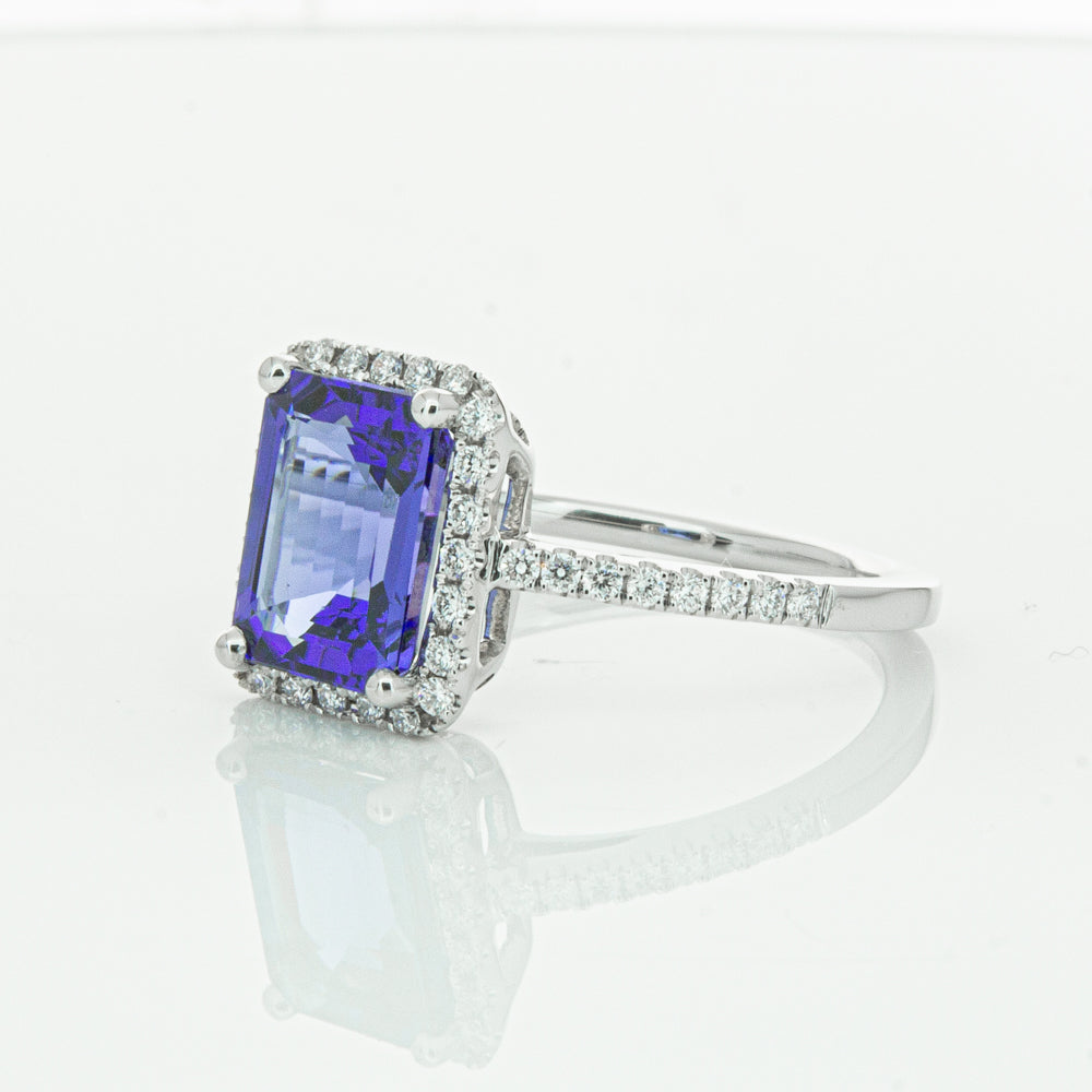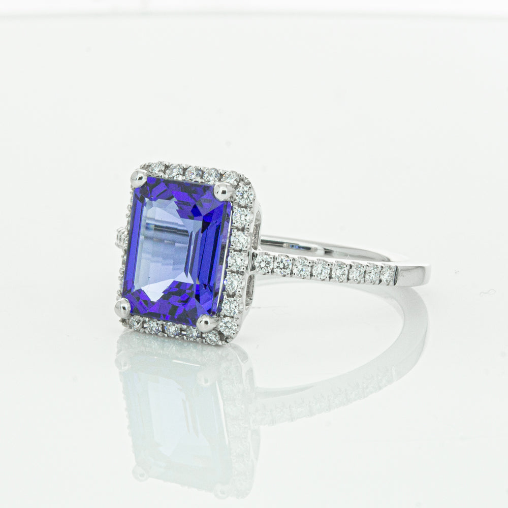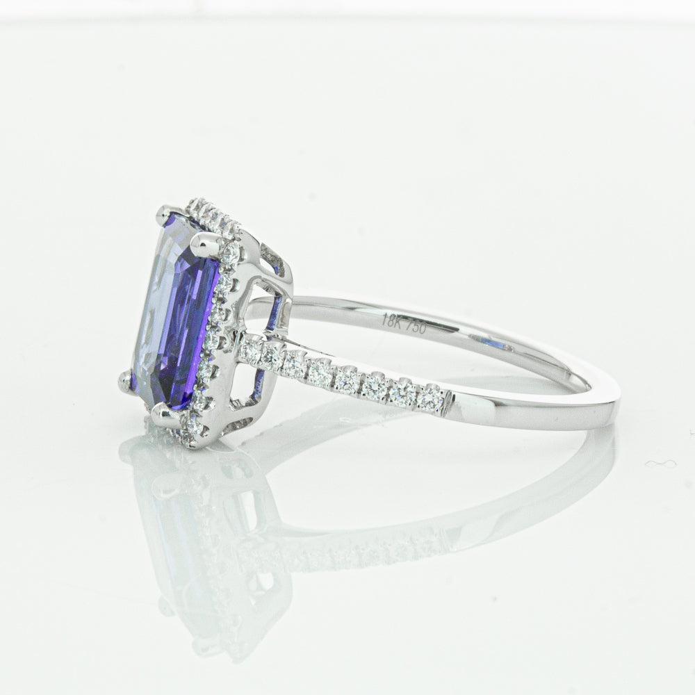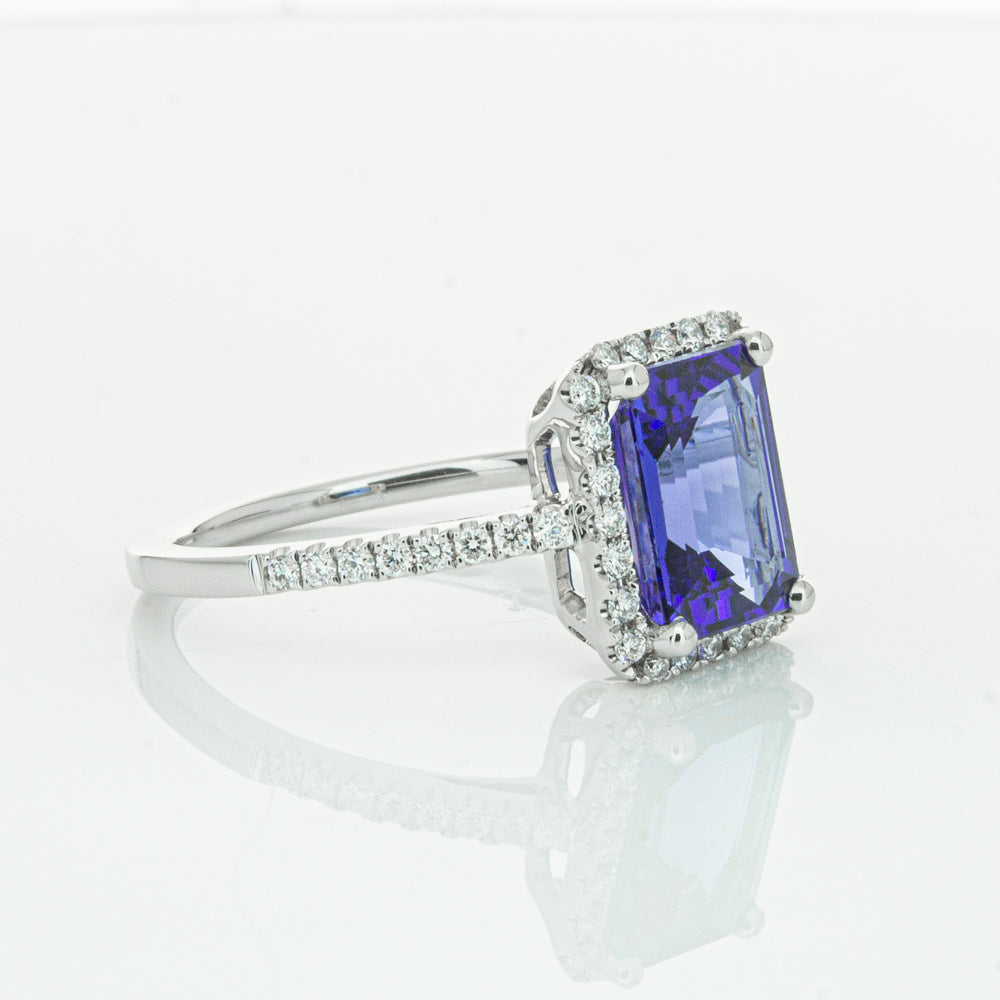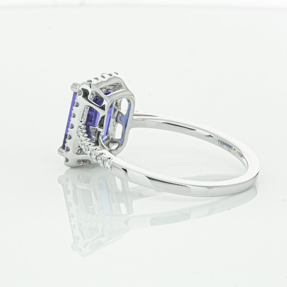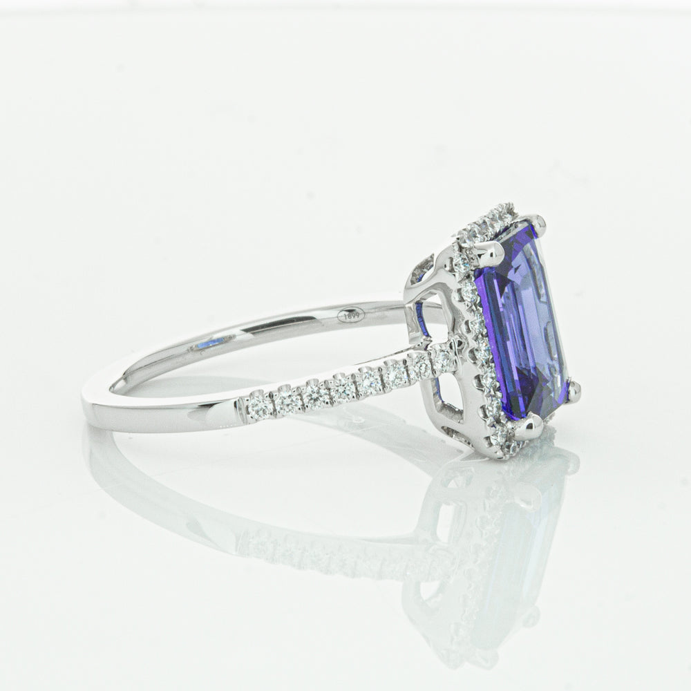 Fall in love with this 18ct white gold ring from our signature 1899 collection featuring one  gorgeous blue rectangular step cut tanzanite framed by a halo of round brilliant cut diamonds with further diamonds along the shoulders.
