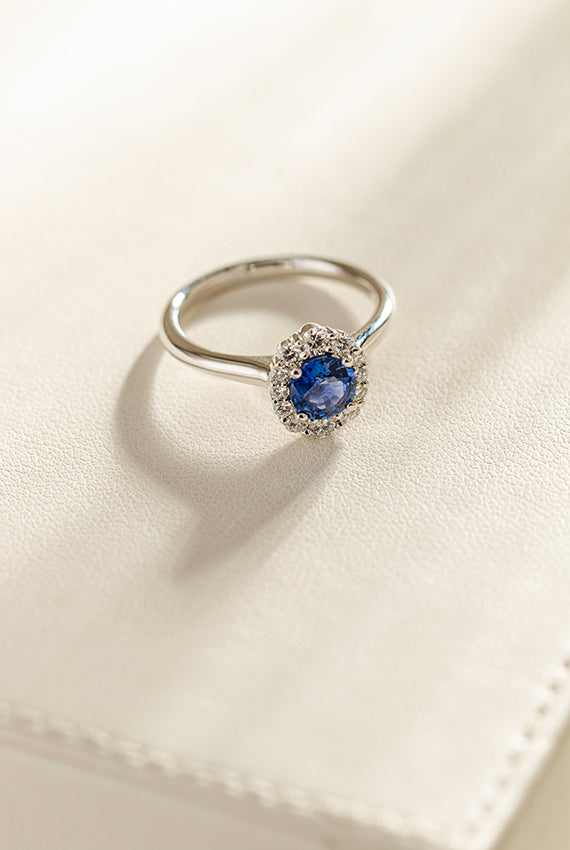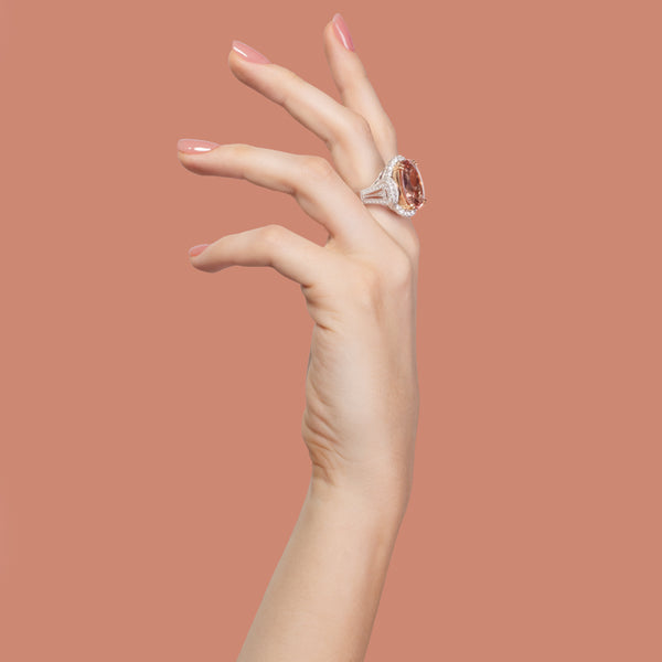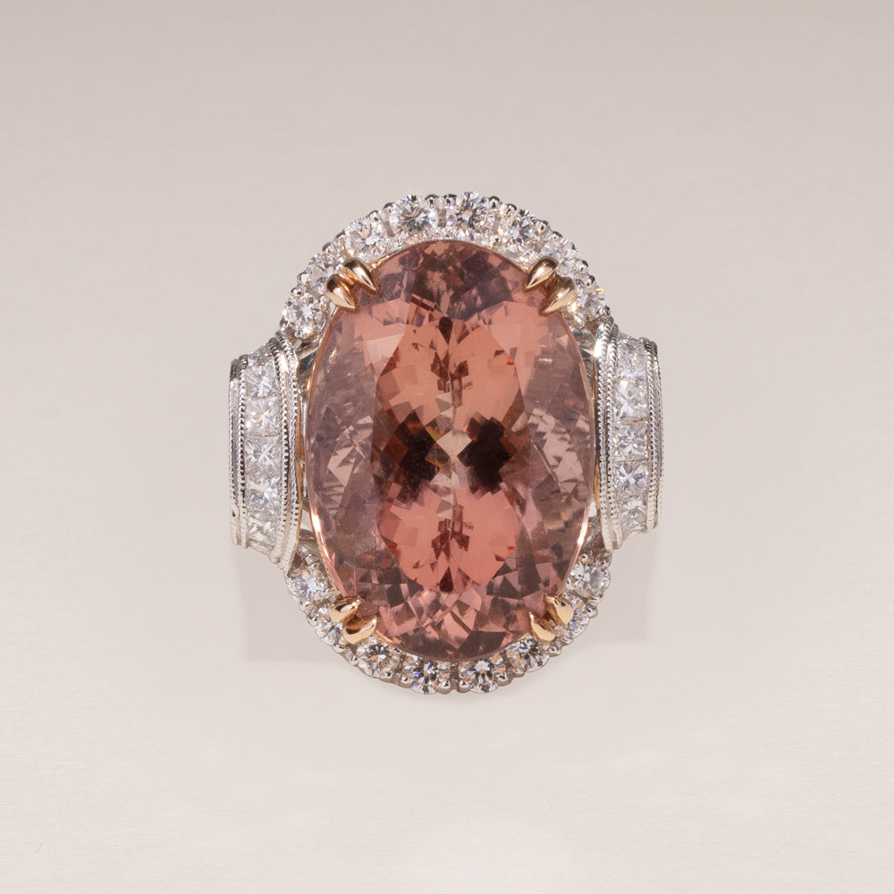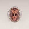 Beautifully crafted in 18ct white and rose gold this ring features an oval faceted morganite framed by a halo of dazzling diamonds.