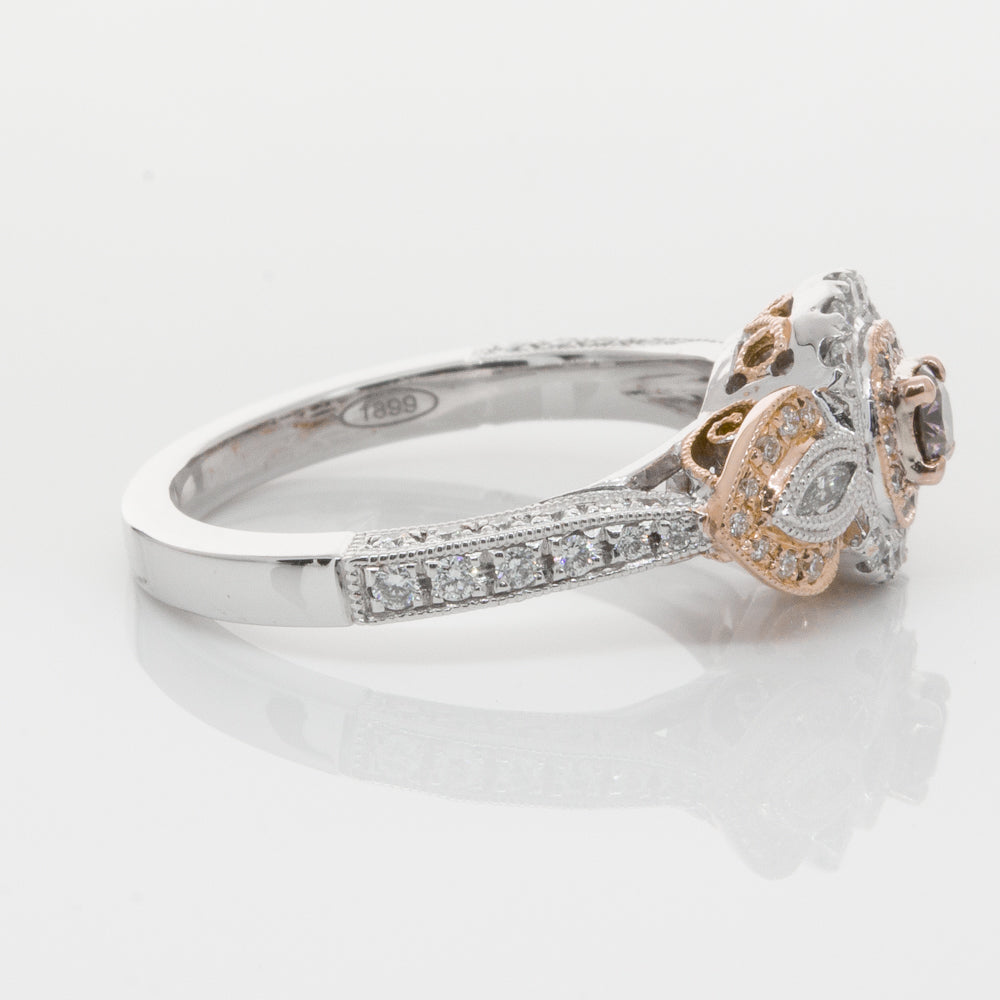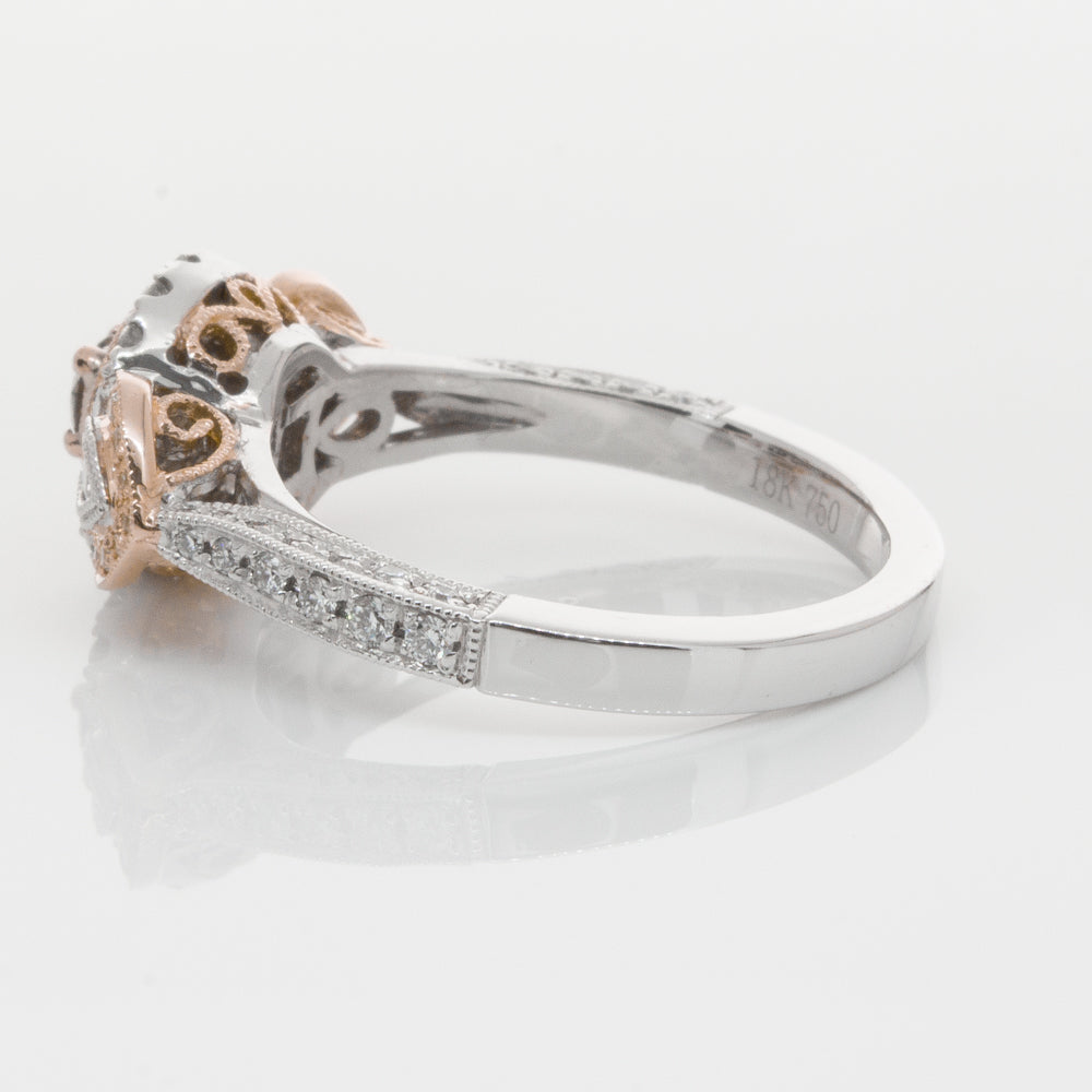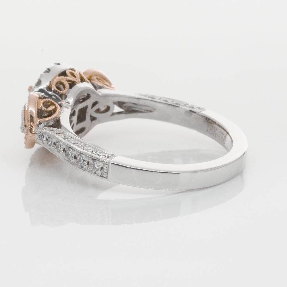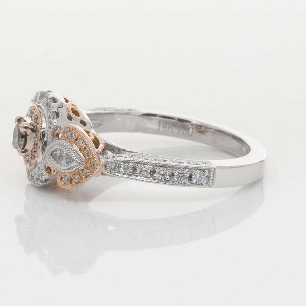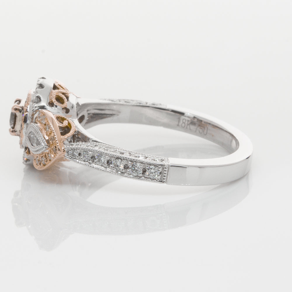 This 18ct white gold ring with rose gold settings features one round brilliant cut diamond framed by dazzling white diamonds, resting on diamond set shoulders.