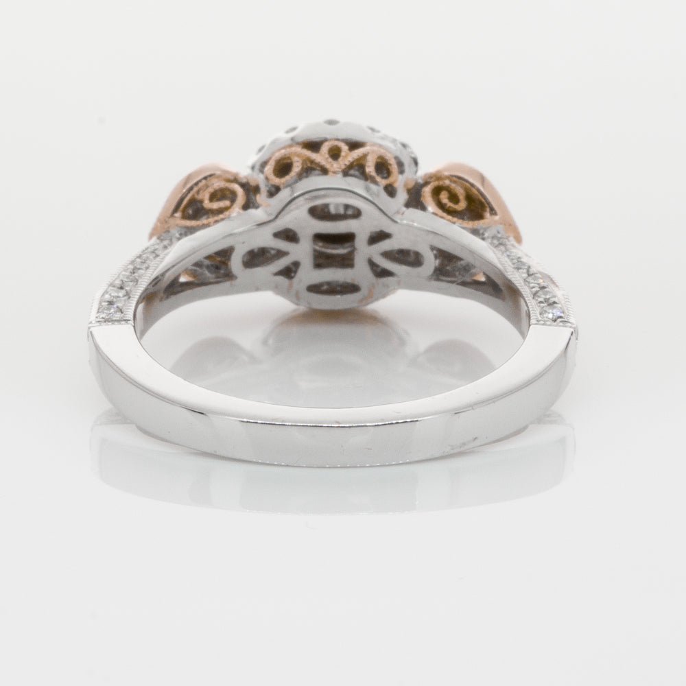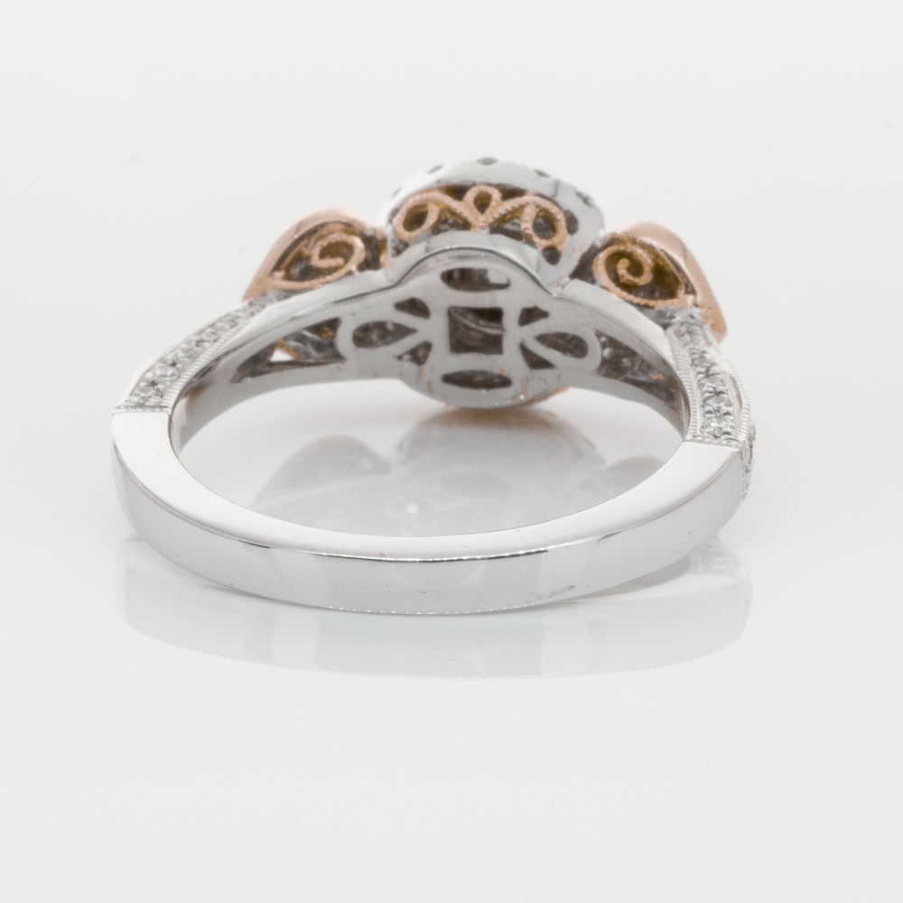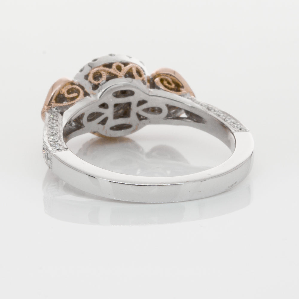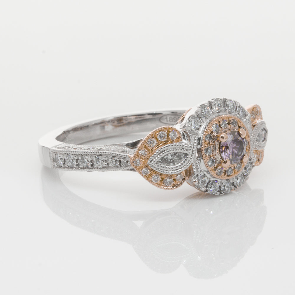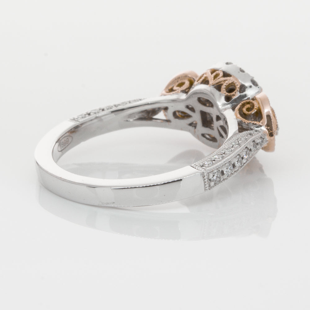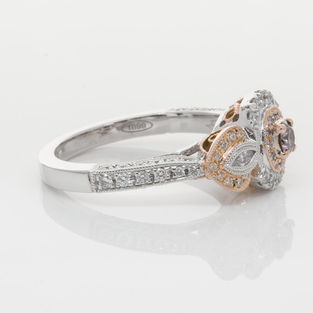 This 18ct white gold ring with rose gold settings features one round brilliant cut diamond framed by dazzling white diamonds, resting on diamond set shoulders.