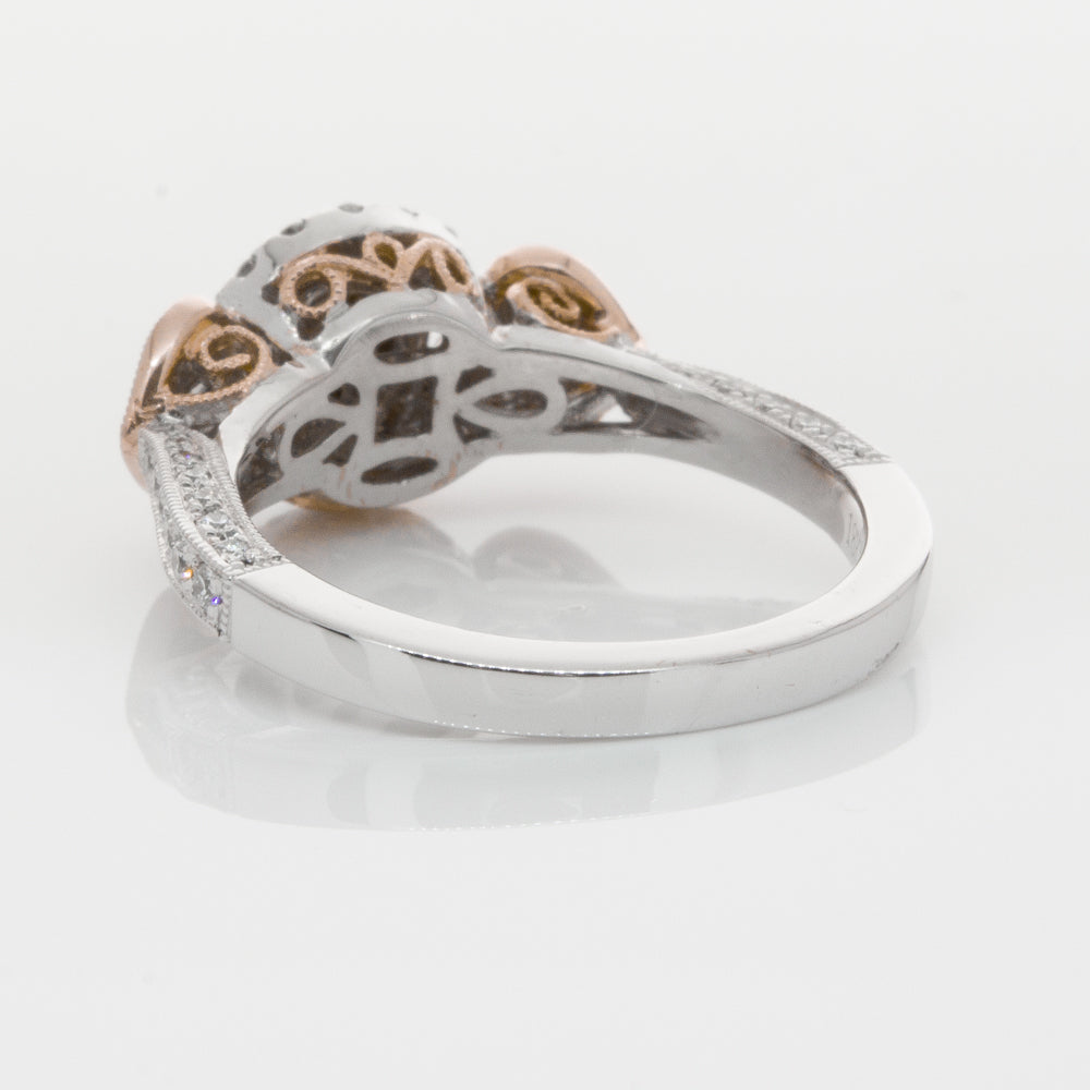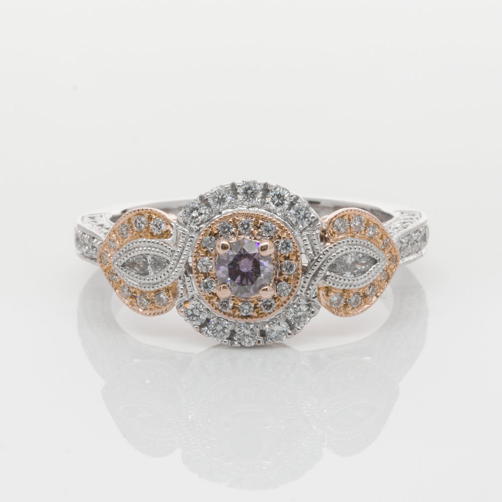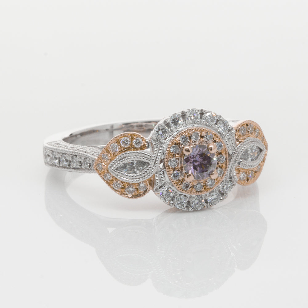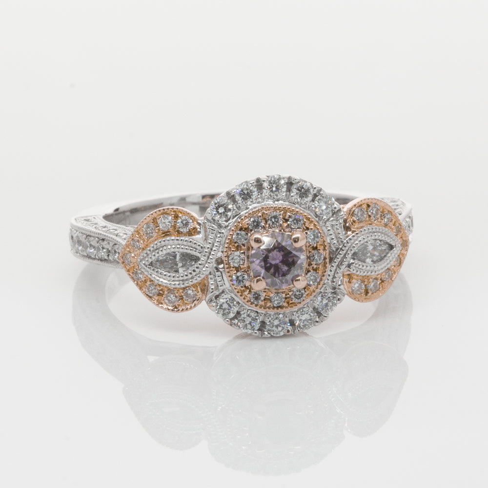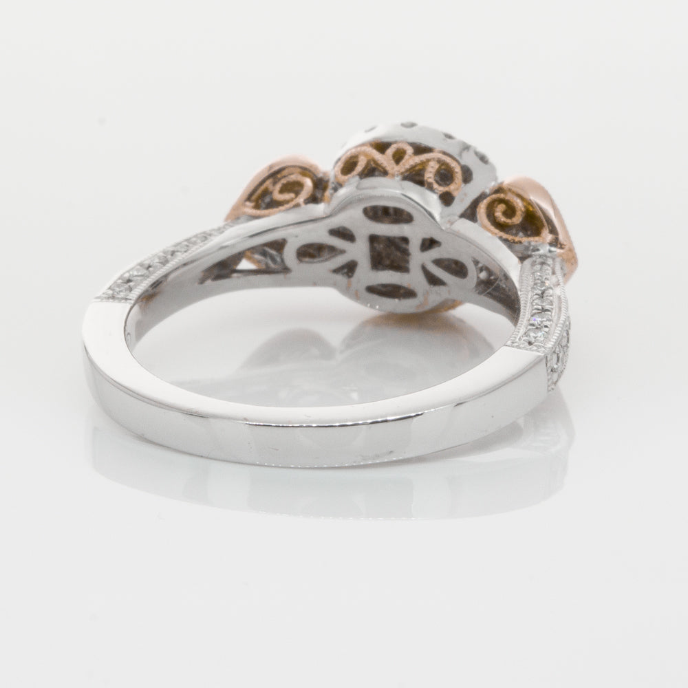 This 18ct white gold ring with rose gold settings features one round brilliant cut diamond framed by dazzling white diamonds, resting on diamond set shoulders.