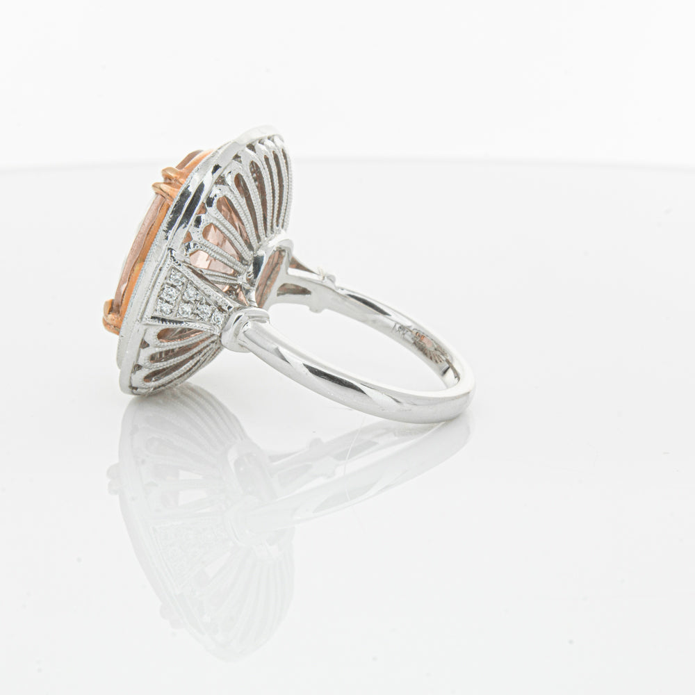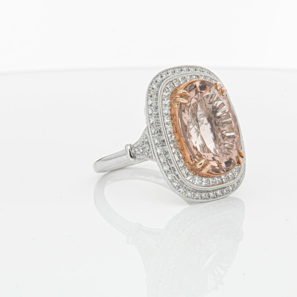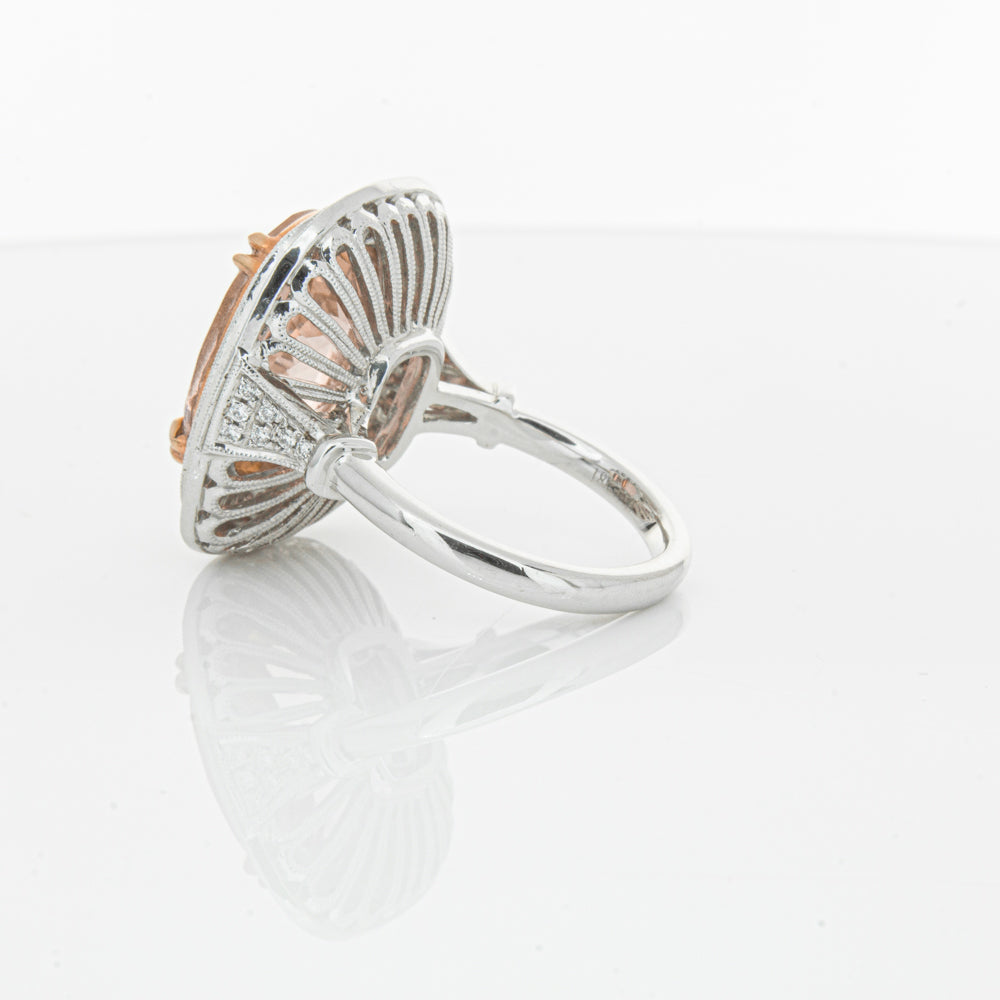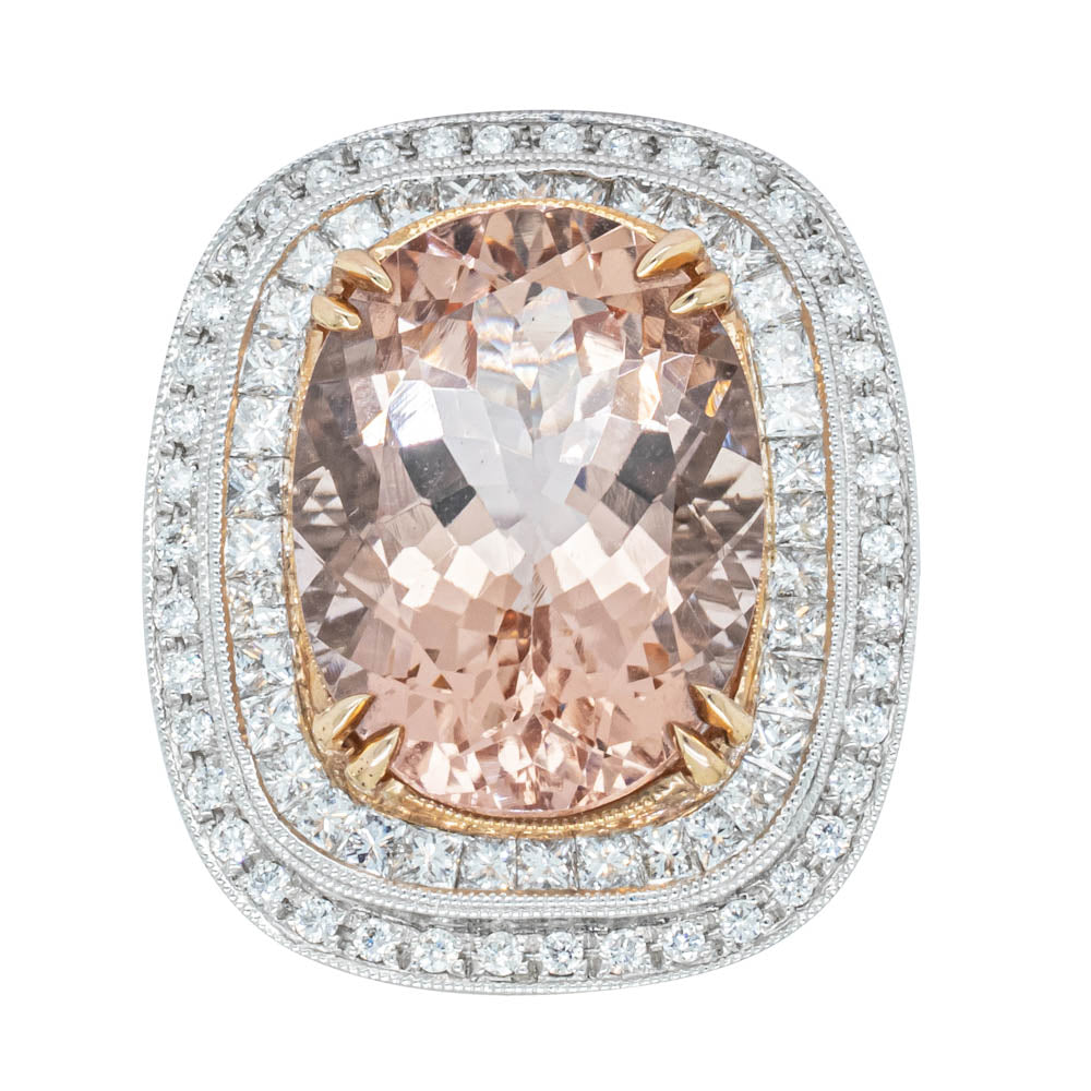 Beautifully crafted in 18ct white gold, this ring features a spectacular oval faceted pink beryl morganite framed by a halo of round brilliant cut diamonds. She will love showing off this ring on one hand with you on the other!