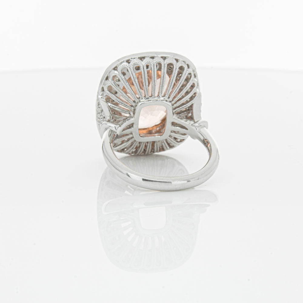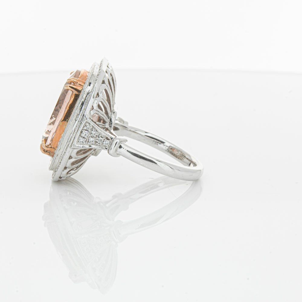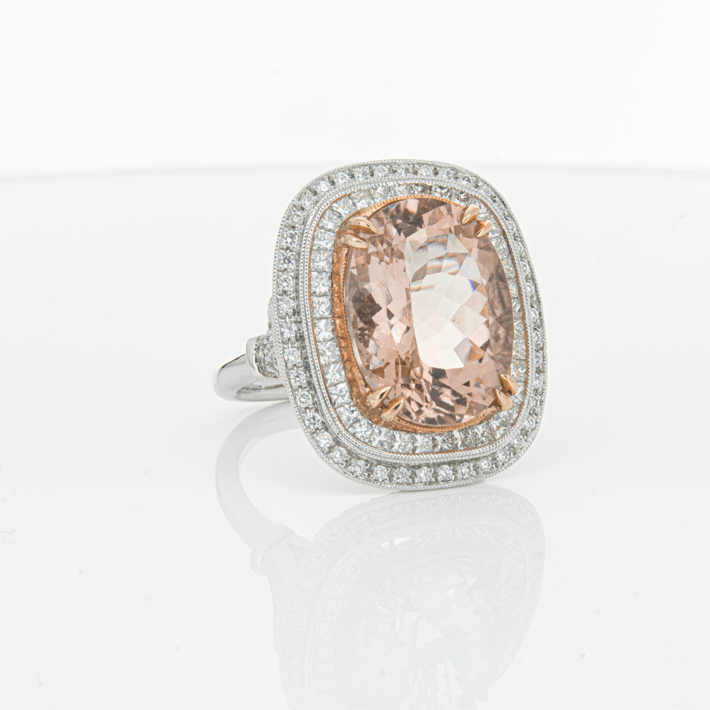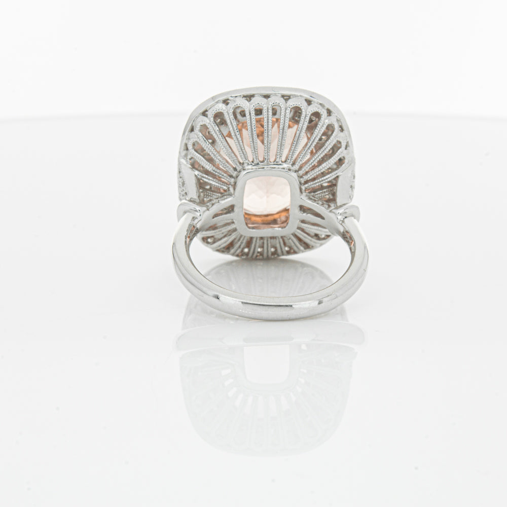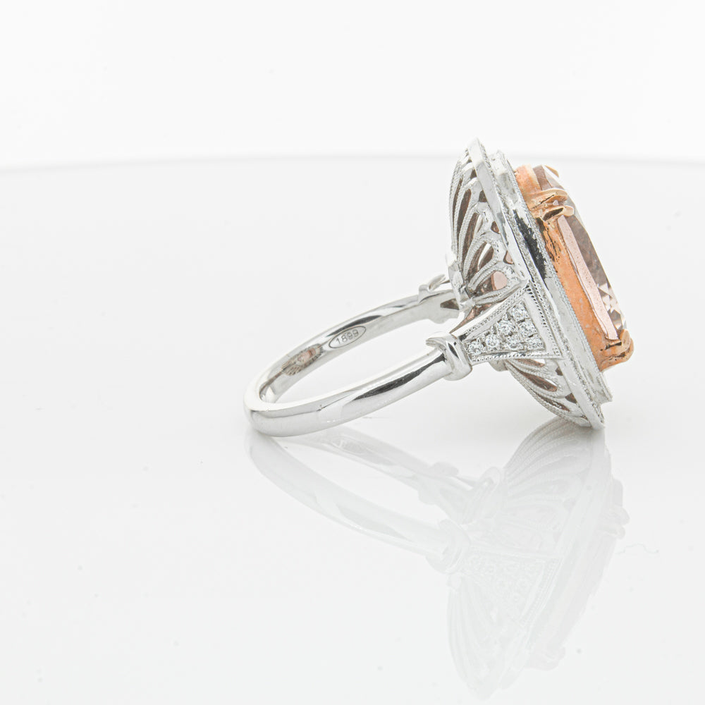 Beautifully crafted in 18ct white gold, this ring features a spectacular oval faceted pink beryl morganite framed by a halo of round brilliant cut diamonds. She will love showing off this ring on one hand with you on the other!