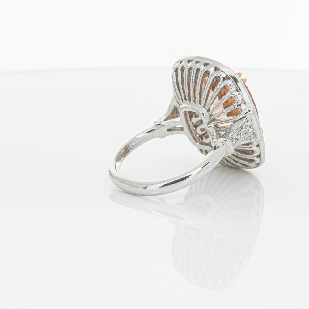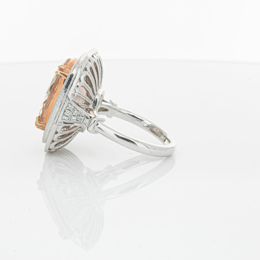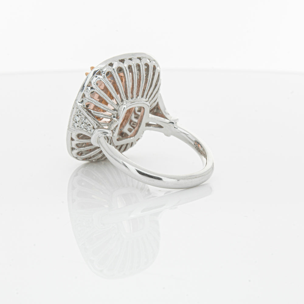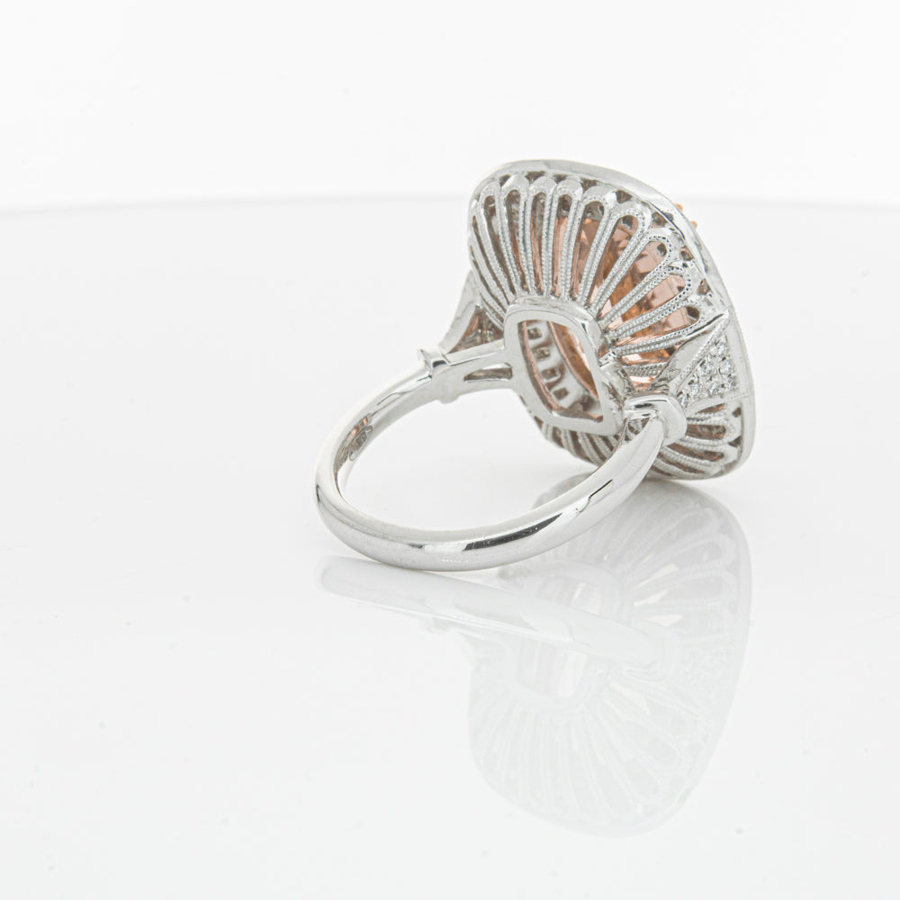Beautifully crafted in 18ct white gold, this ring features a spectacular oval faceted pink beryl morganite framed by a halo of round brilliant cut diamonds. She will love showing off this ring on one hand with you on the other!