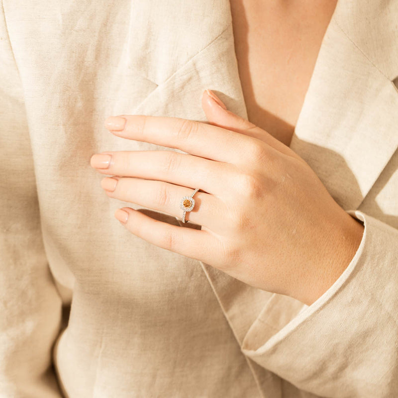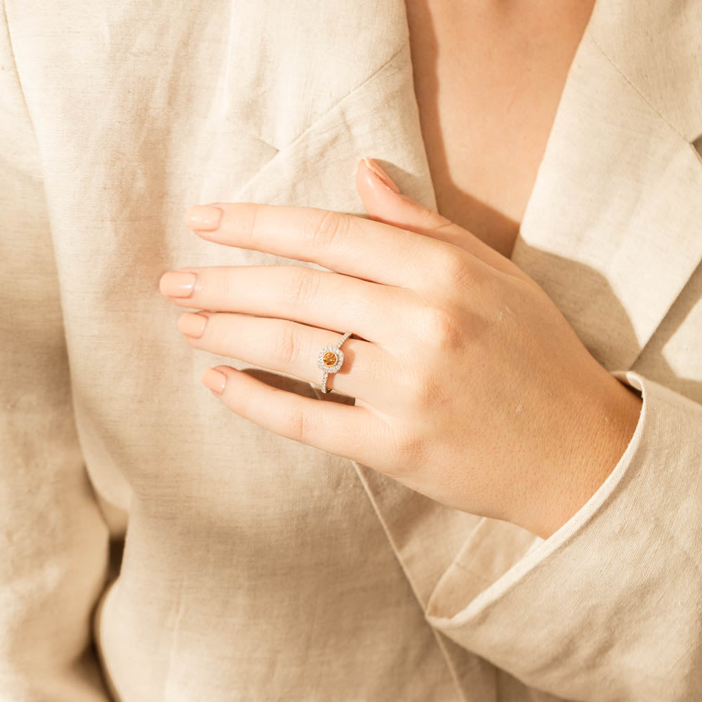 Sweep her off her feet with this dazzling diamond ring. Beautifully crafted in 18ct white gold, this rich yellow diamond is enhanced by a rose gold setting and shimmering round brilliant cut diamonds.A ring to fall in love with.