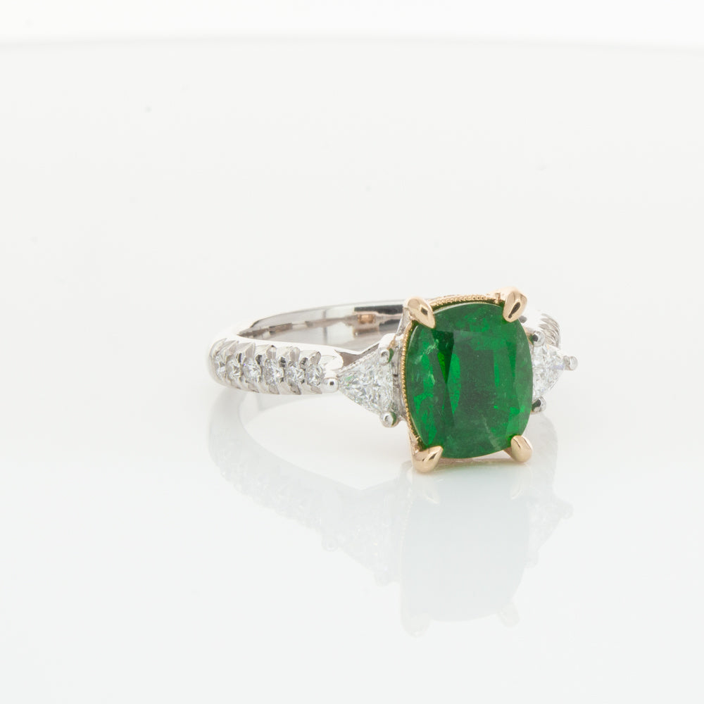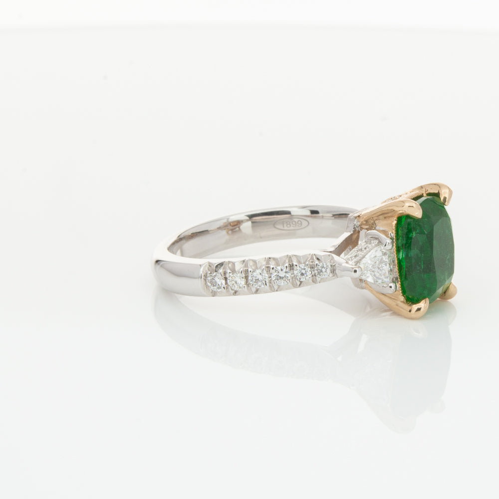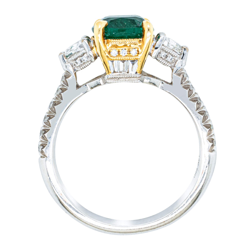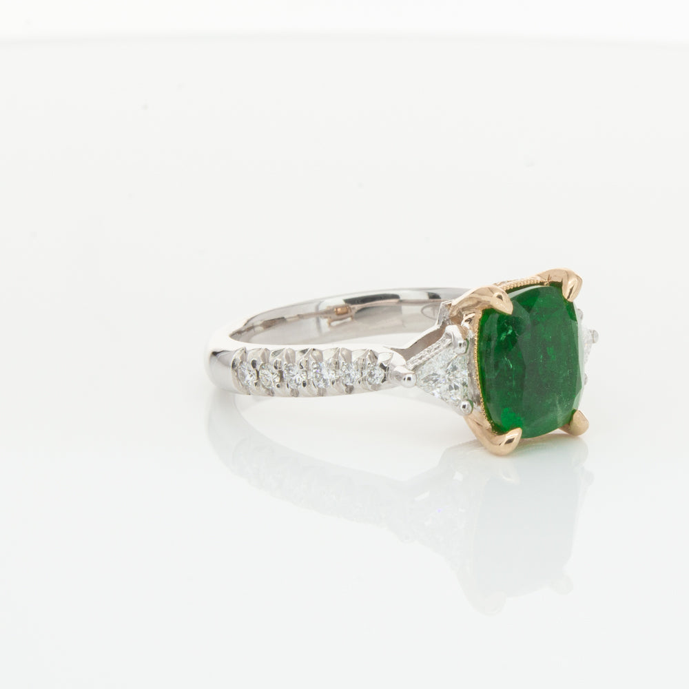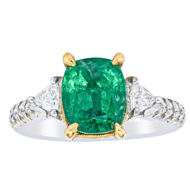 This stunning ring features a 2.67ct cushion cut emerald set in an 18ct white & yellow gold setting, framed by two trilliant cut diamonds, resting on diamond set shoulders. See the diamonds hidden under the basket - now you can sparkle from every angle!