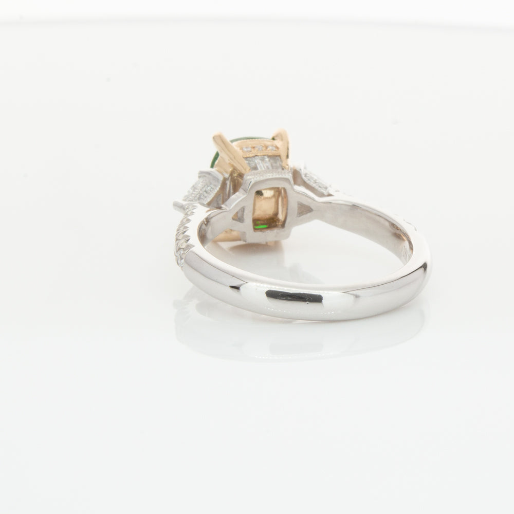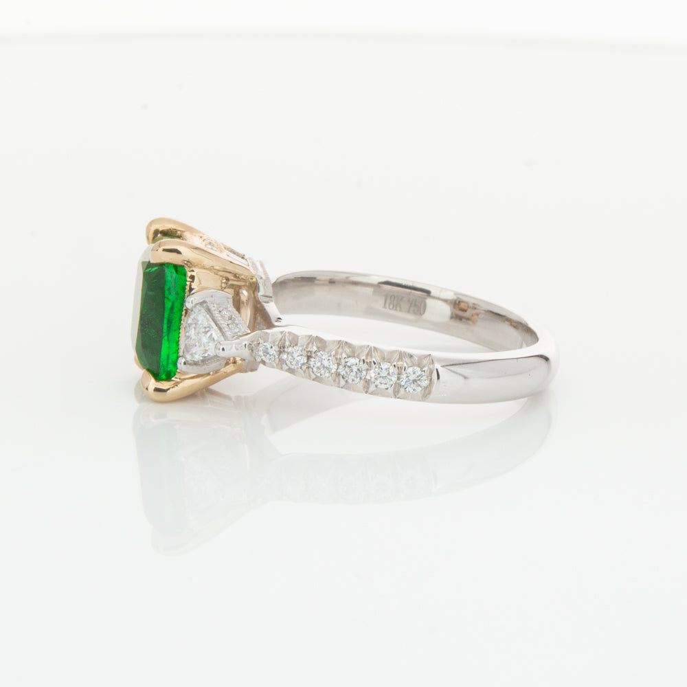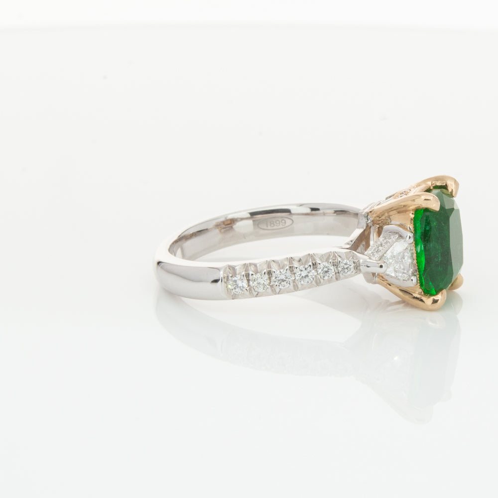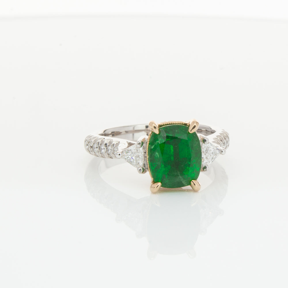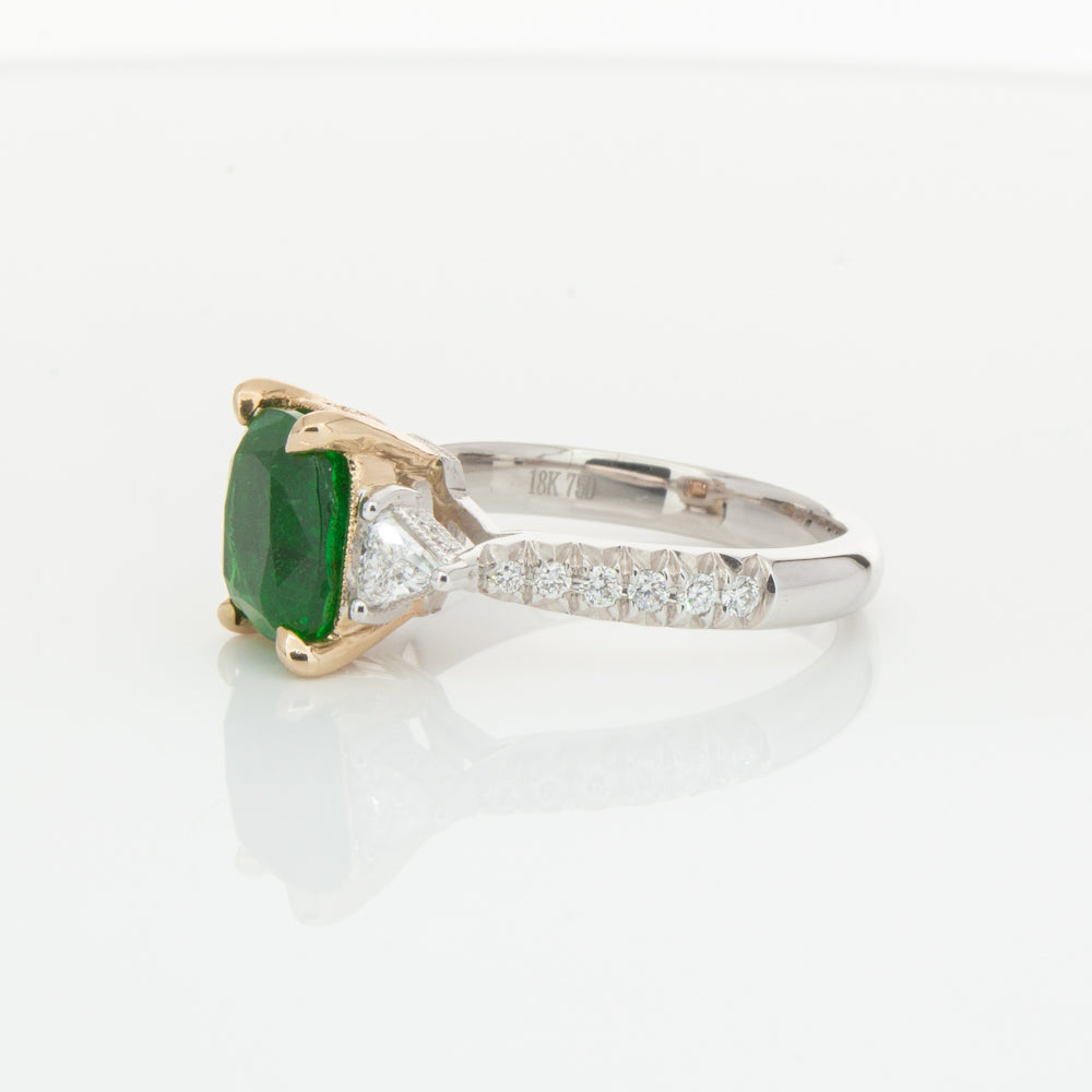 This stunning ring features a 2.67ct cushion cut emerald set in an 18ct white & yellow gold setting, framed by two trilliant cut diamonds, resting on diamond set shoulders. See the diamonds hidden under the basket - now you can sparkle from every angle!