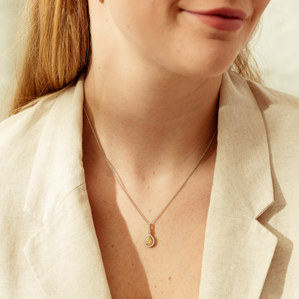 Treat her to the pendant of her dreams with this radiant yellow diamond cluster pendant! Beautifully crafted from 18ct white and 18ct yellow gold, this sparkling pendant boasts a centre yellow pear cut diamond, round brilliant cut diamond halo and diamond set bail. She will twinkle through the night in this.