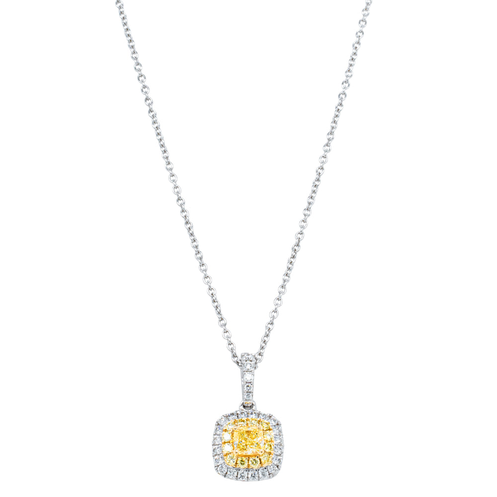 A cushion cut yellow diamond is the centre piece of this elegant pendant, giving it a unique spin on a classic. A double halo of round brilliant cut yellow and white diamonds is a stunning finishing touch.