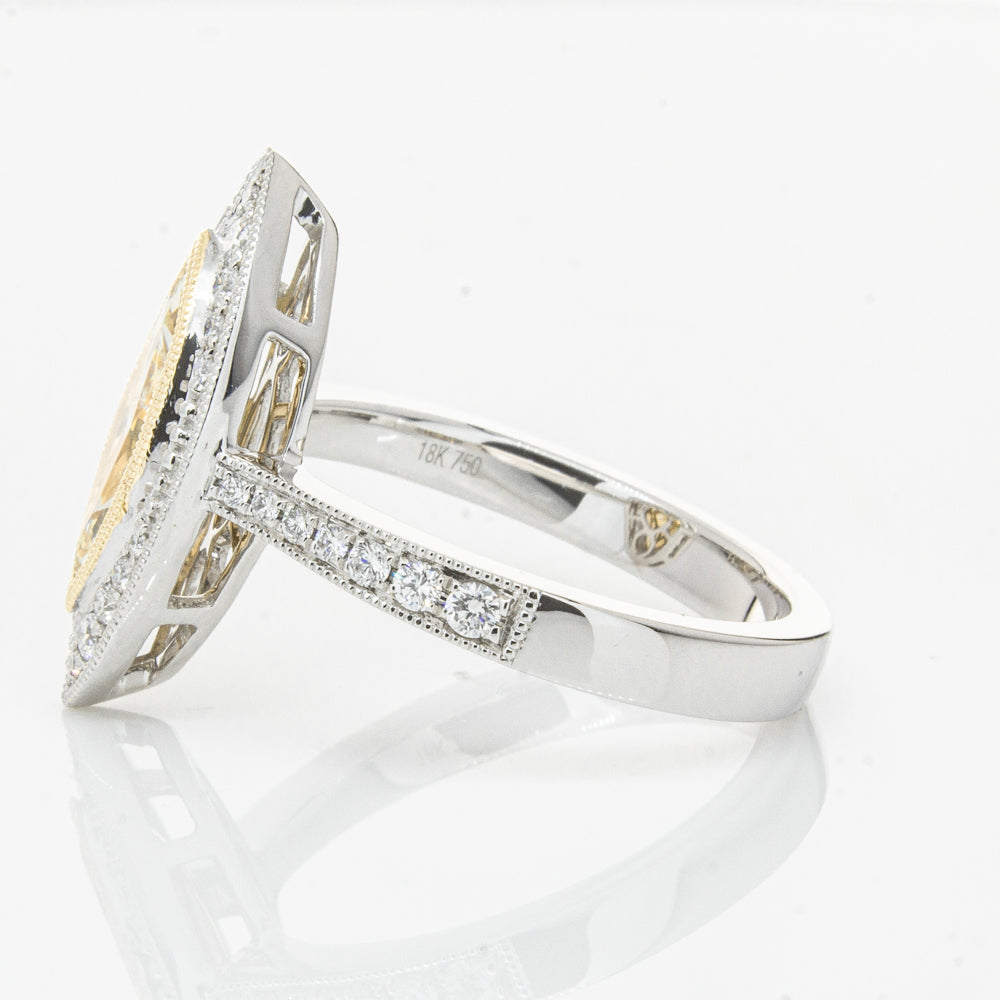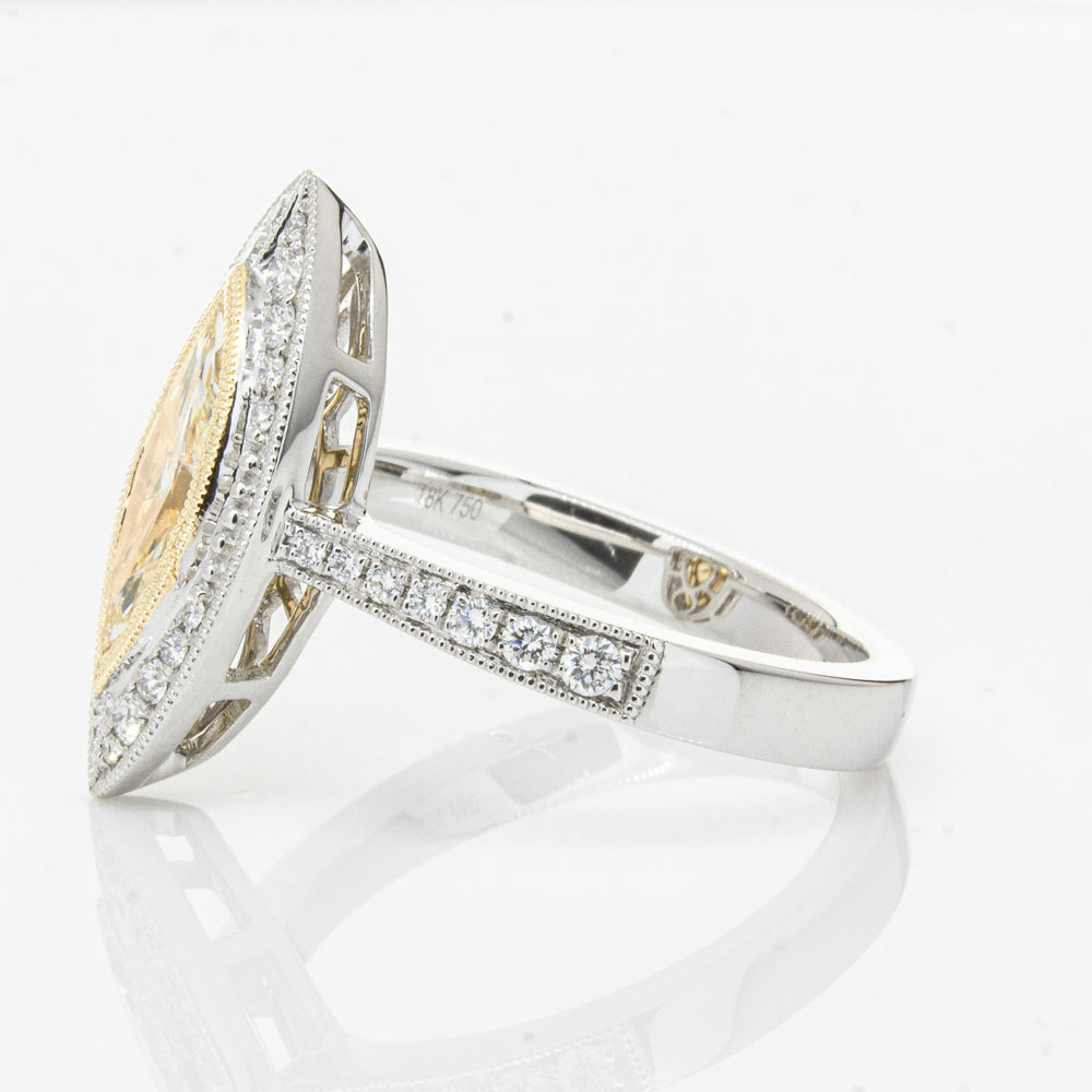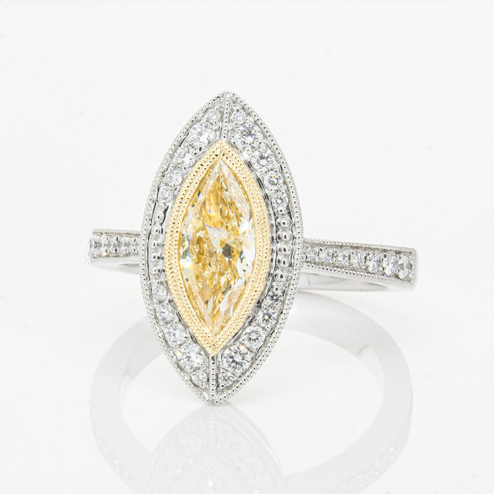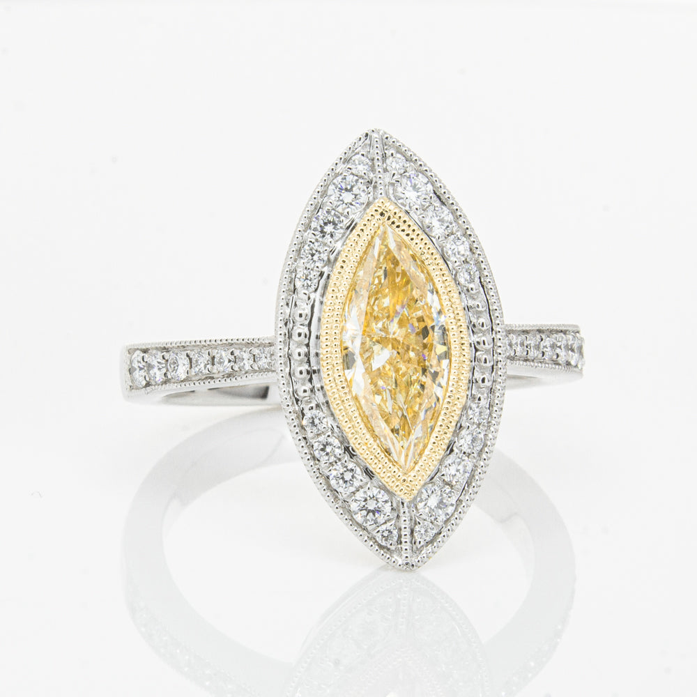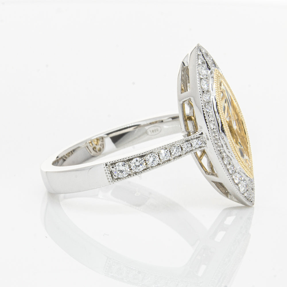 Carefully crafted in 18ct white and yellow gold from our signature 1899 collection, this stunning ring boasts one marquise cut yellow diamond framed by dazzling white diamonds, resting on diamond set shoulders.
