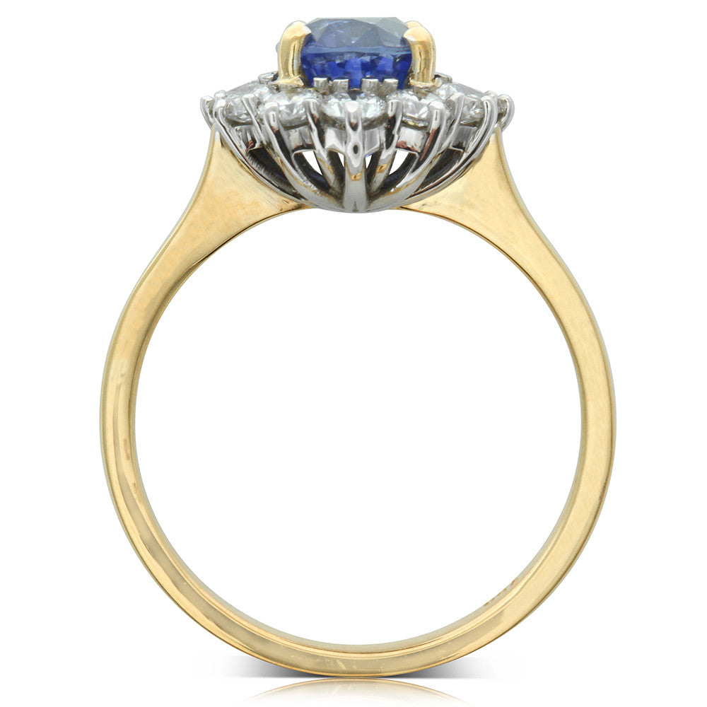 Shine in this elegant sapphire and diamond dress ring. This exquisite piece has been crafted from 18ct yellow and 18ct white gold. It boasts a violet blue centre stone surrounded by a glittering frame of diamonds.