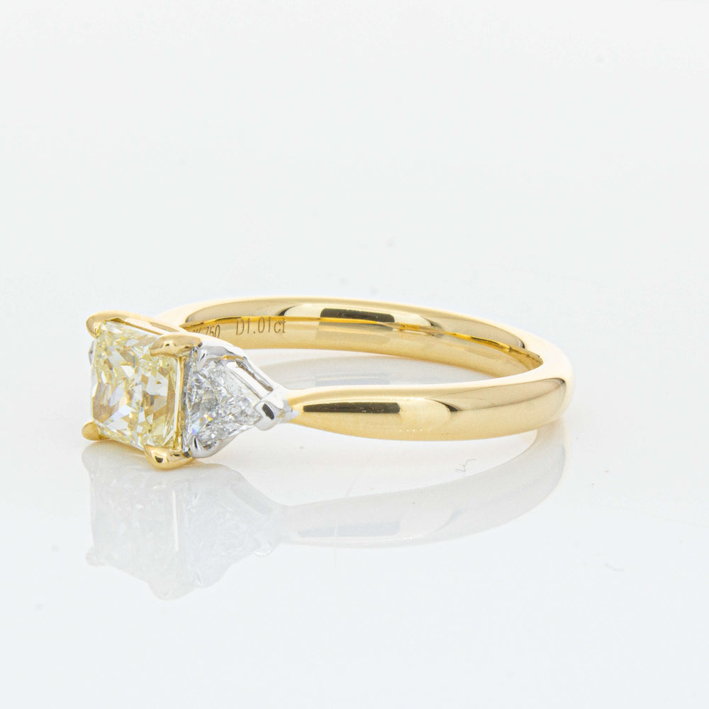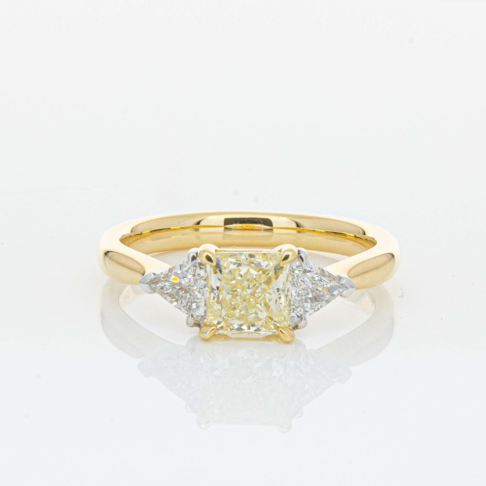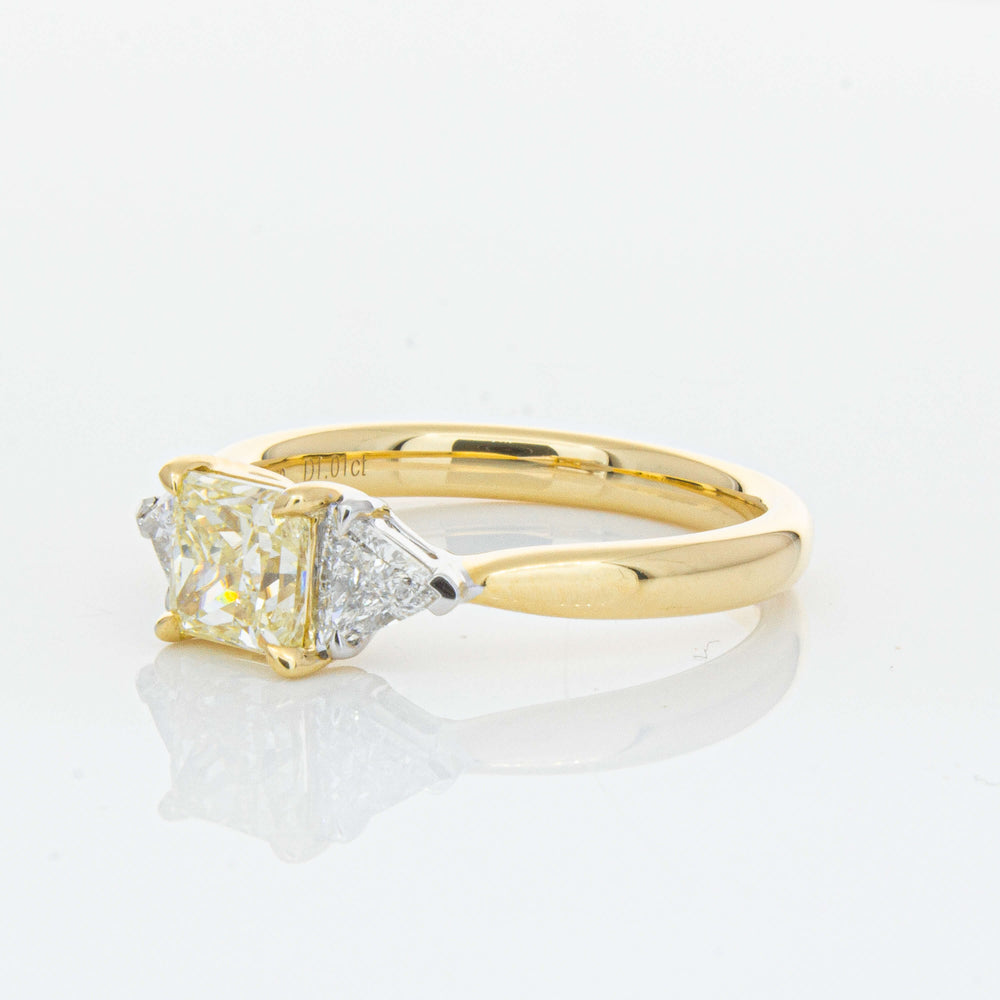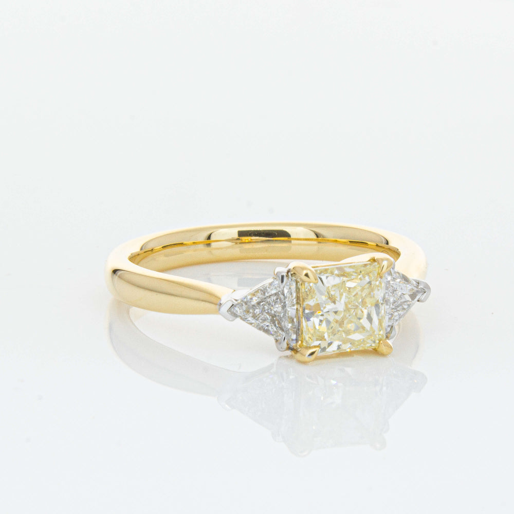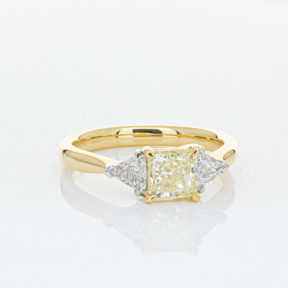 Simply radiant, this ring is sure to be the one. Beautifully crafted from 18ct yellow gold, this ring boasts a dazzling princess cut yellow diamond, framed by two trilliant cut diamonds. Make it a moment to remember.