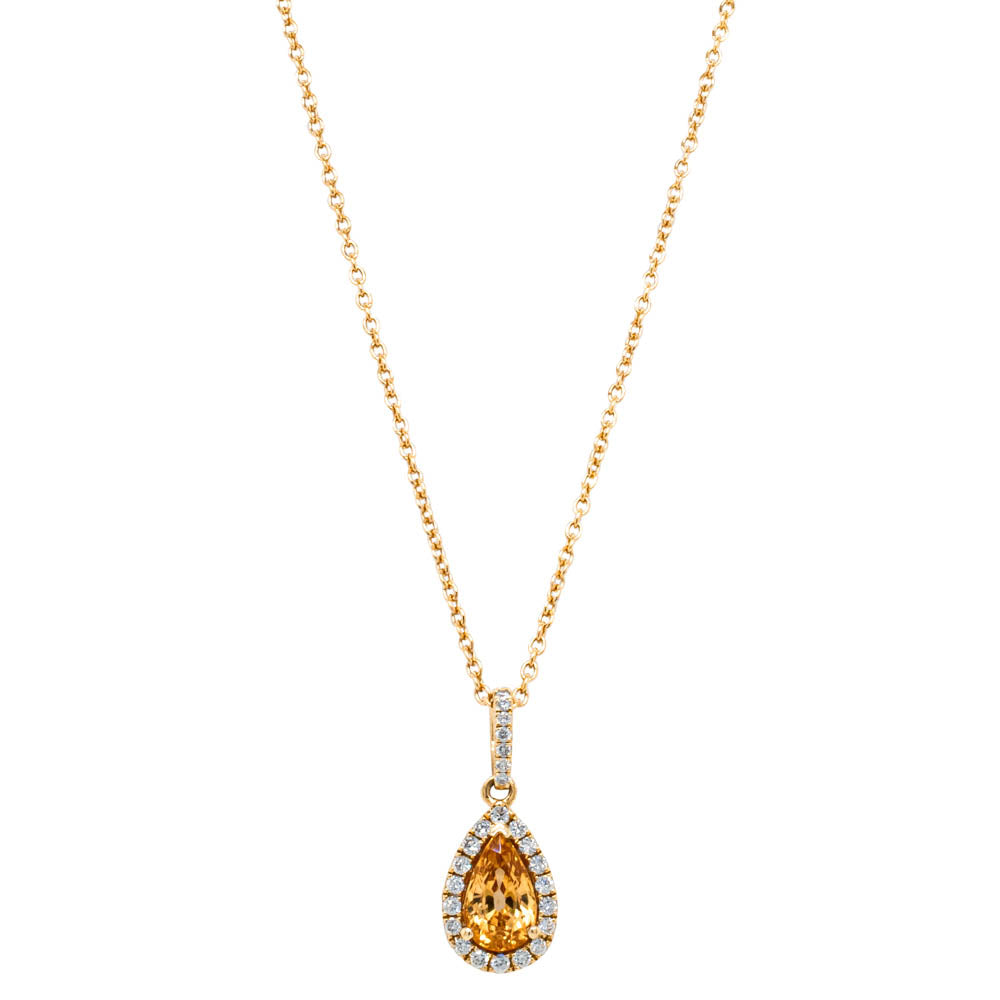 Stand out wearing this elegant golden sapphire and diamond halo pendant. Crafted beautifully in 18ct yellow gold this lovely pendant features a pear faceted sapphire framed by a dazzling diamond cluster.