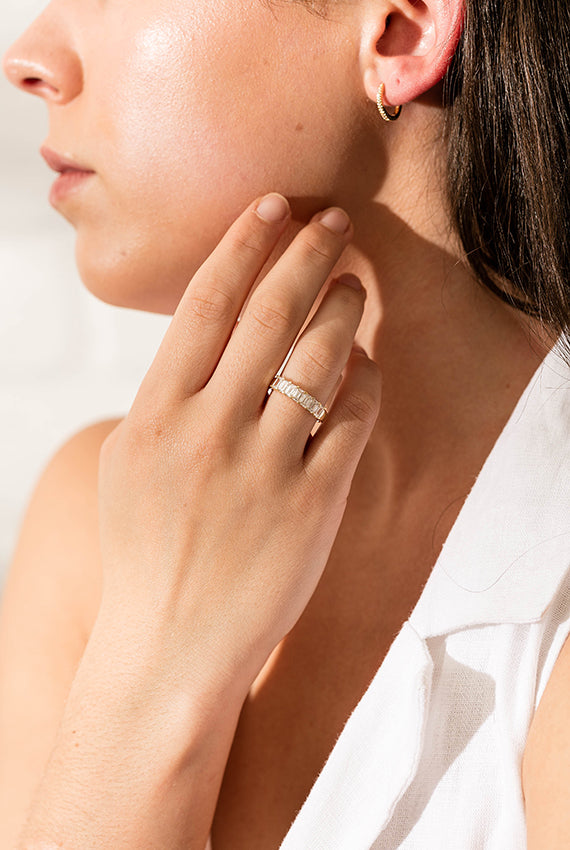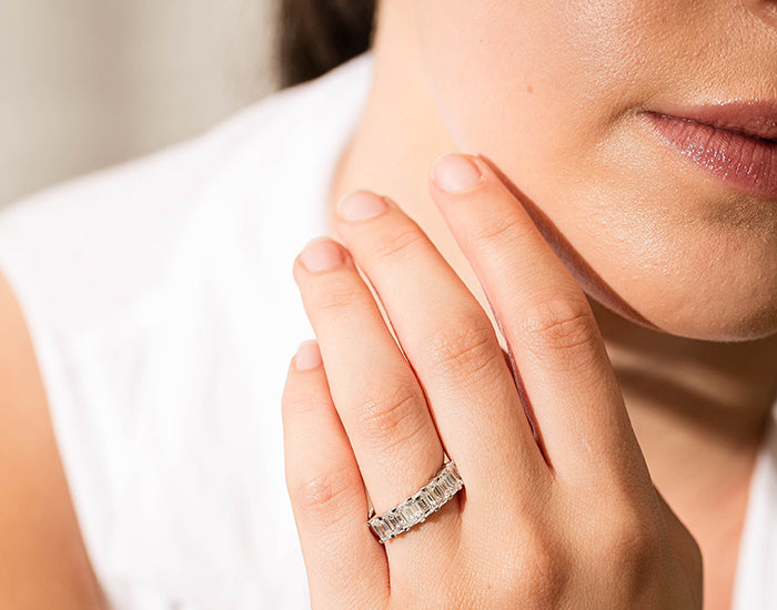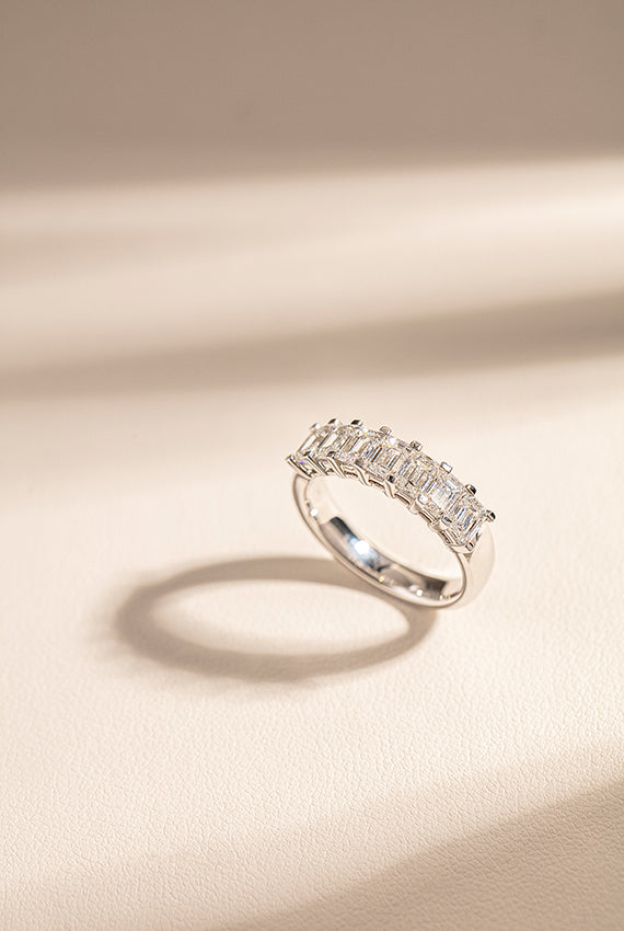 Presenting a ring symbolic of a never-ending river of paradise, Asra pays tribute to the nighttime traveller. A luxurious display of emerald-cut diamonds punctuates its brilliance set for seamless sparkle giving it a spirit of timeless glamour.