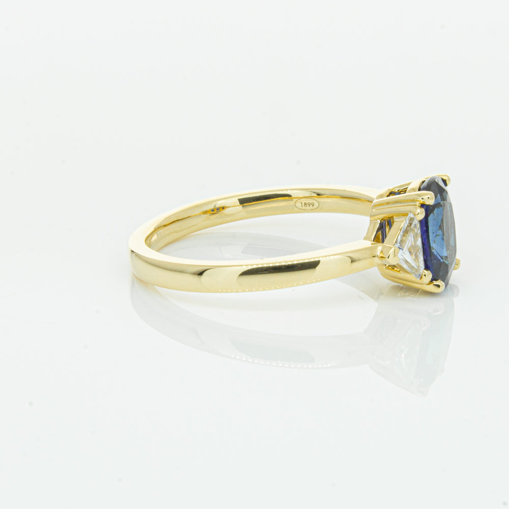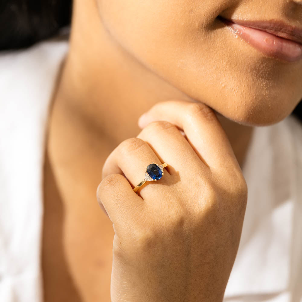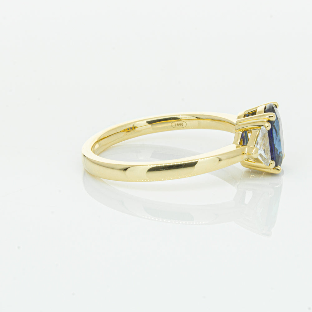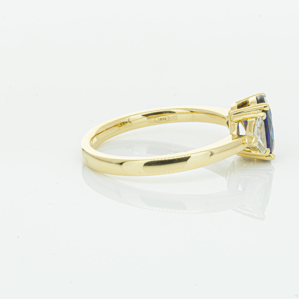 A breathtaking ring you will love to wear! Crafted carefully in luxurious 18ct yellow gold from our signature 1899 collection, this mesmerising ring boasts one oval faceted sapphire claw set inside two trilliant cut diamonds. A beautiful statement ring that is sure to receive many compliments!