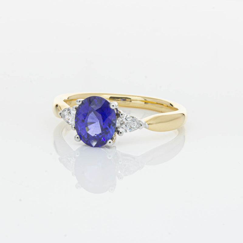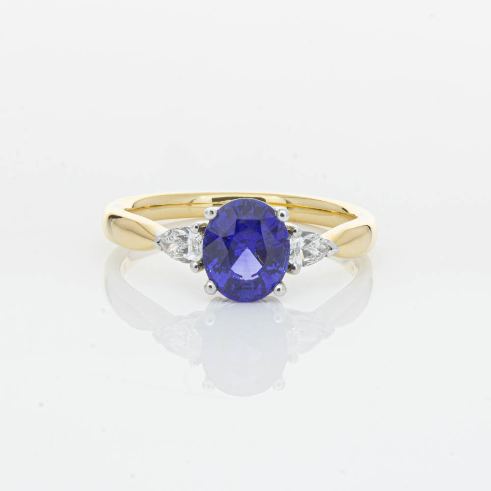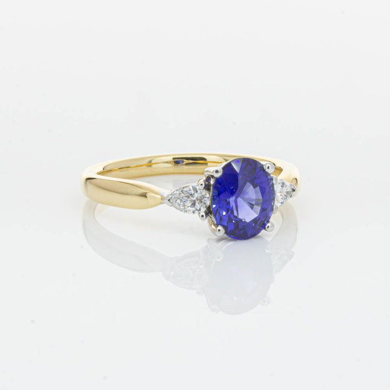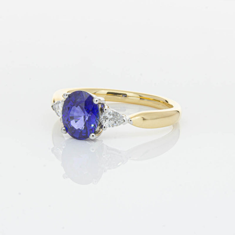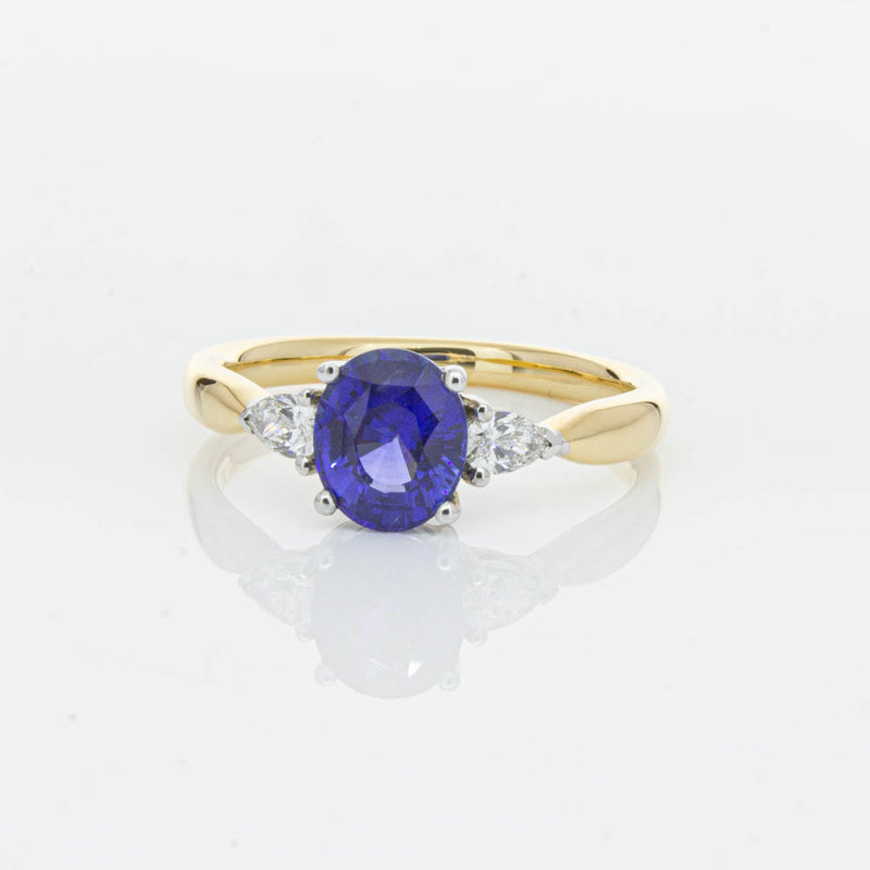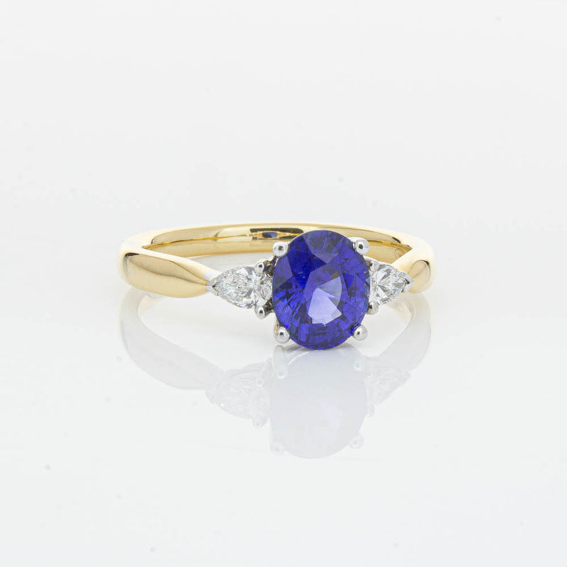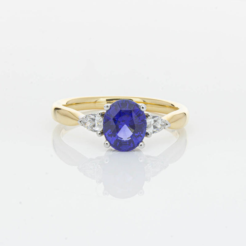 "A soft cornflower blue sapphire forms the central attraction, its vibrant radiance and oval profile is perfectly suited to the Ayla ring with balanced pear cut shoulder stones gracefully leading to a warm yellow gold band. ." - Joseph Tattersfield