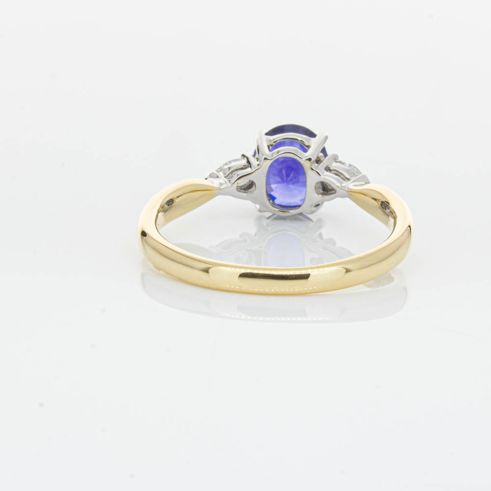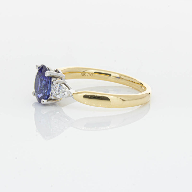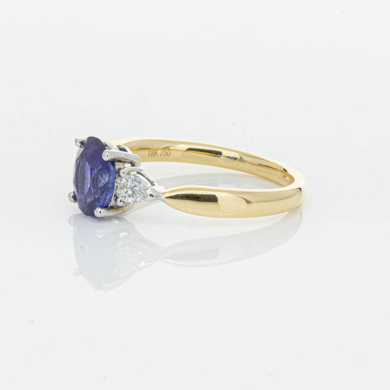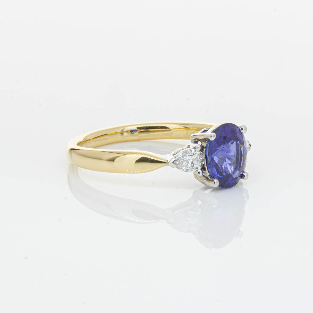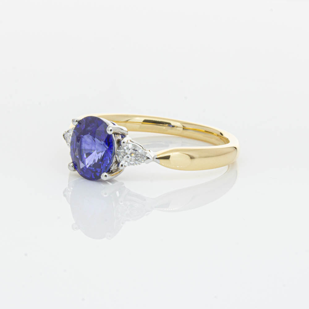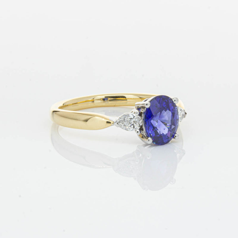 "A soft cornflower blue sapphire forms the central attraction, its vibrant radiance and oval profile is perfectly suited to the Ayla ring with balanced pear cut shoulder stones gracefully leading to a warm yellow gold band. ." - Joseph Tattersfield