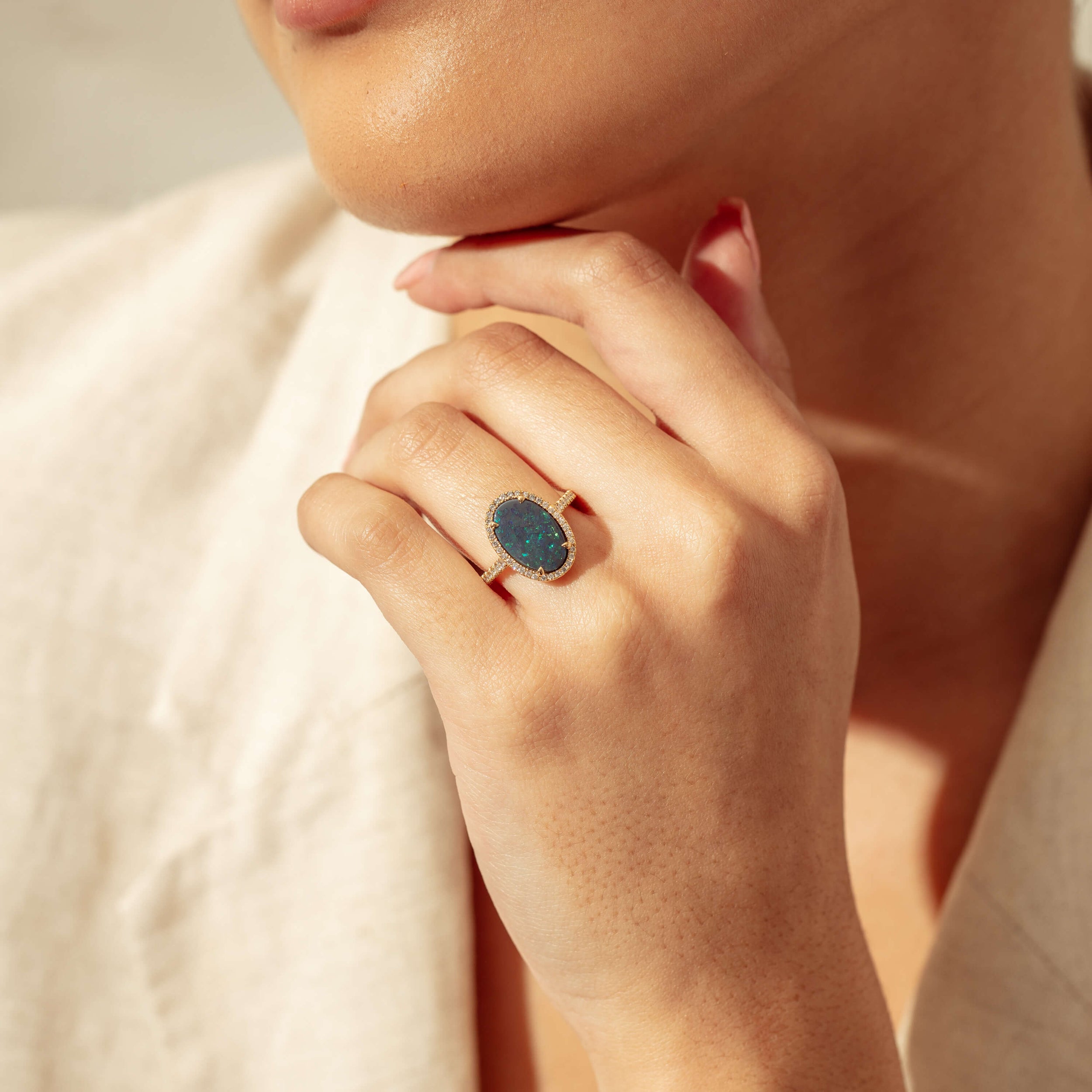 Encircling the opal, a radiant halo of round brilliant-cut diamonds enhances the gemstone’s natural mystique, amplifying the ring’s luminous presence. Set in gleaming 18ct yellow gold, the band is meticulously finished to provide a refined backdrop for the center stone’s bold spectrum.