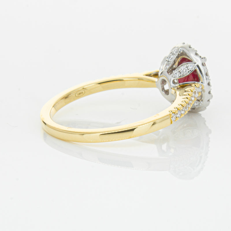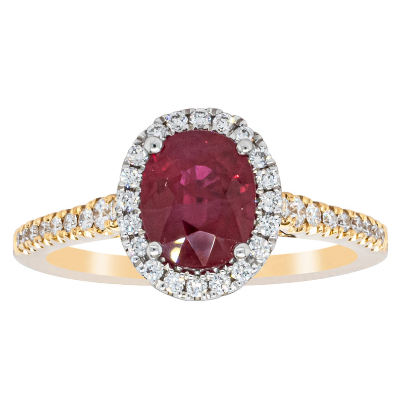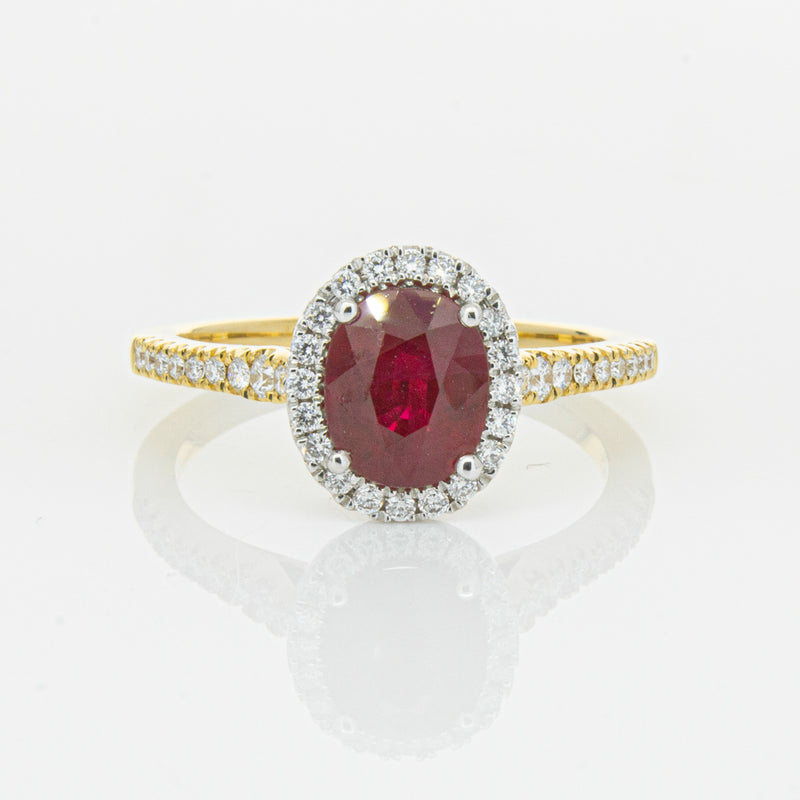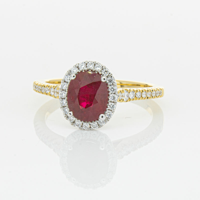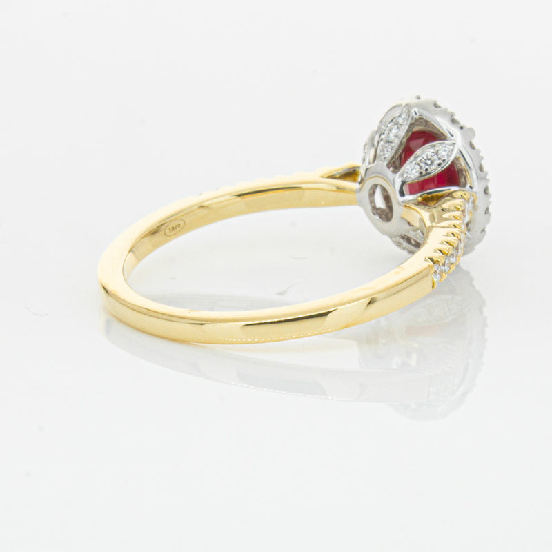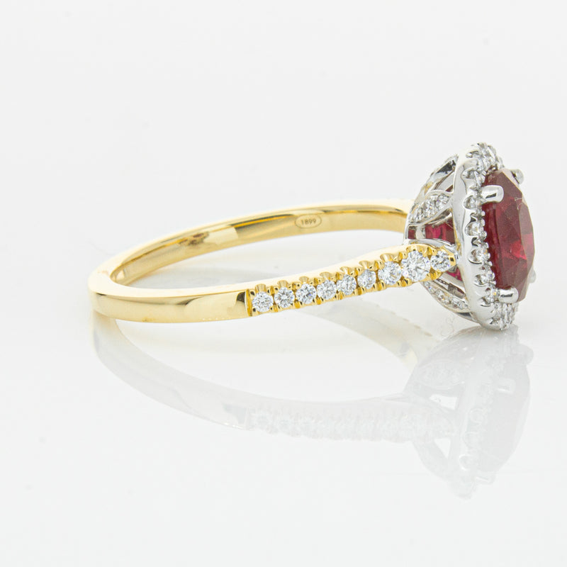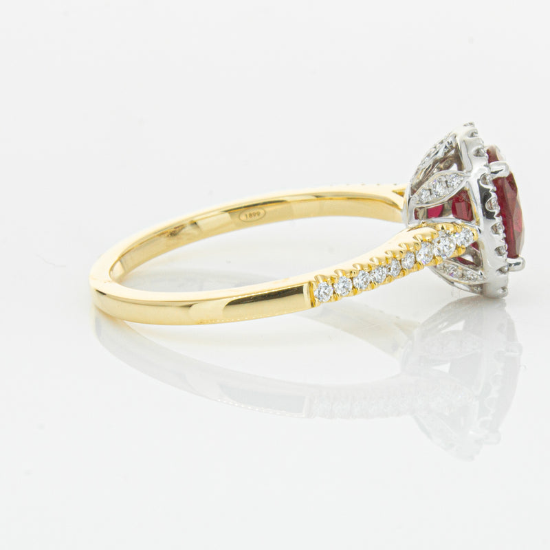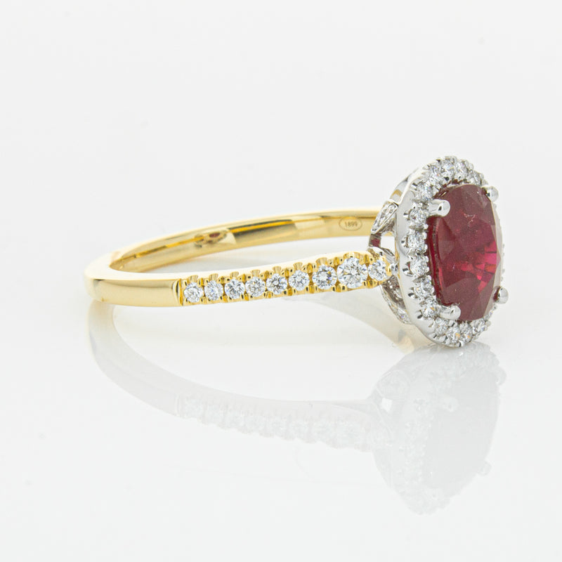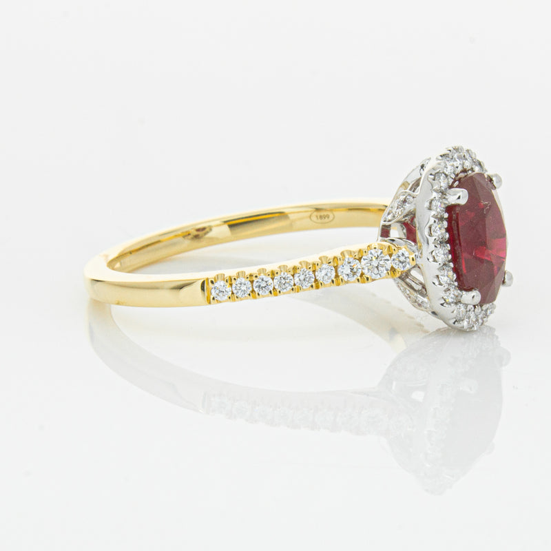 A brilliant red oval faceted ruby combines with exceptional sparkle to make a luminous statement in this gorgeous 18ct yellow and white gold Sierra ring from our signature 1899 collection. This particular ruby was sourced from Africa and is a dark strong red colour. The surrounding diamonds are round brilliant cut.