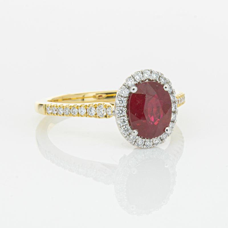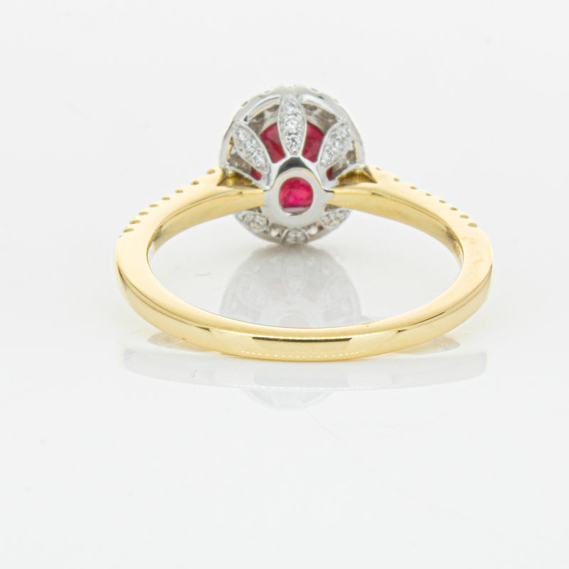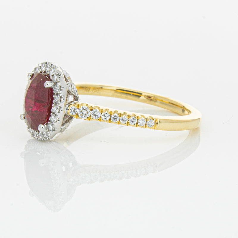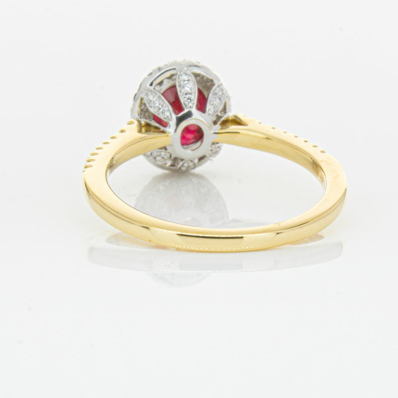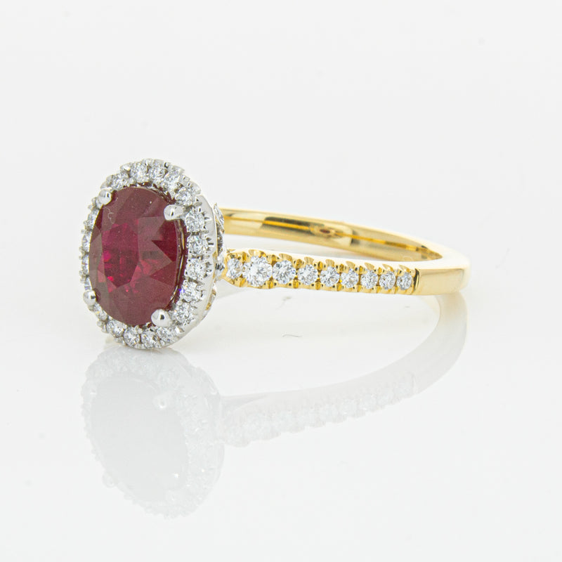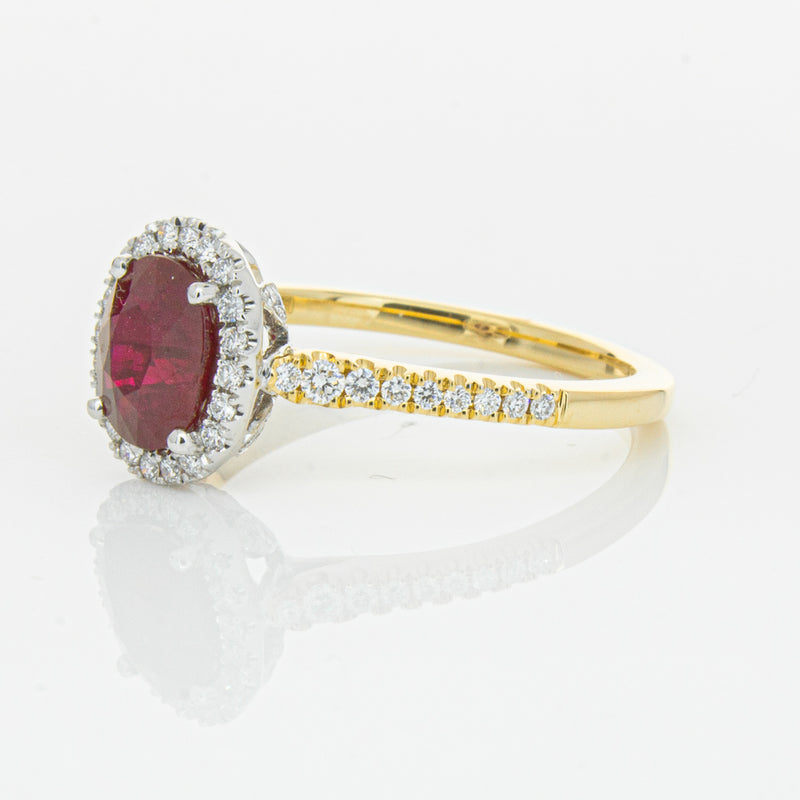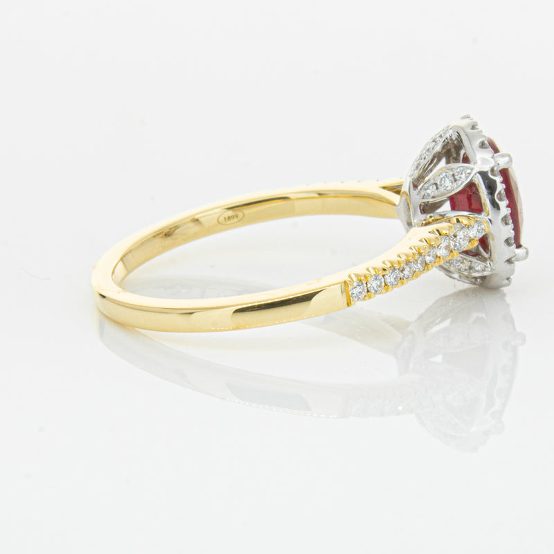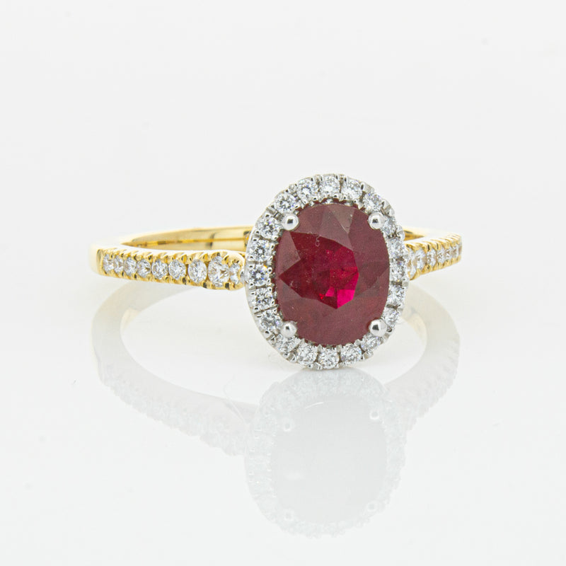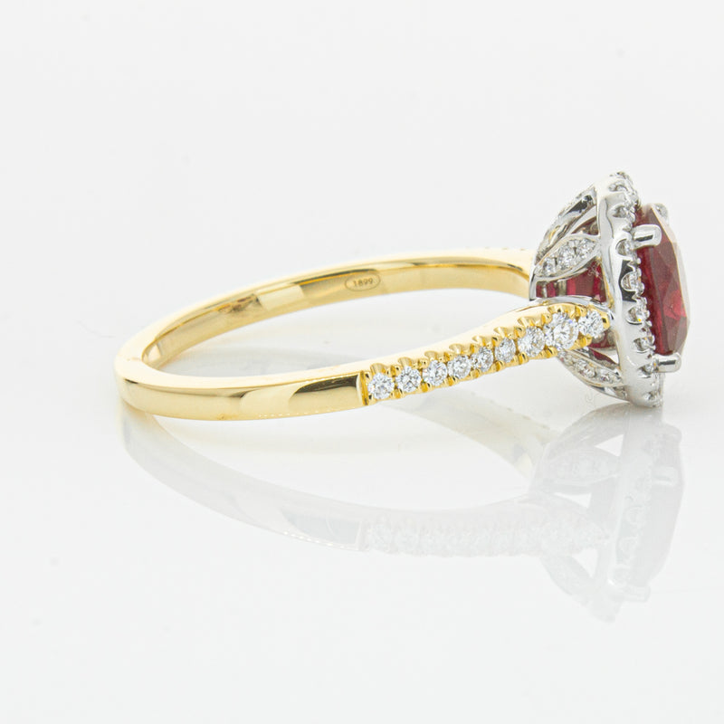 A brilliant red oval faceted ruby combines with exceptional sparkle to make a luminous statement in this gorgeous 18ct yellow and white gold Sierra ring from our signature 1899 collection. This particular ruby was sourced from Africa and is a dark strong red colour. The surrounding diamonds are round brilliant cut.