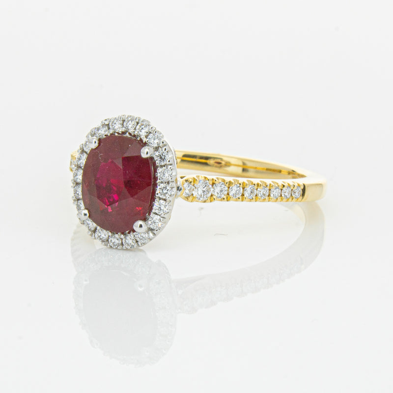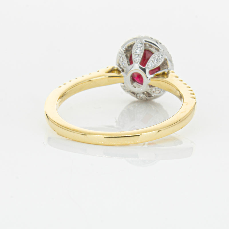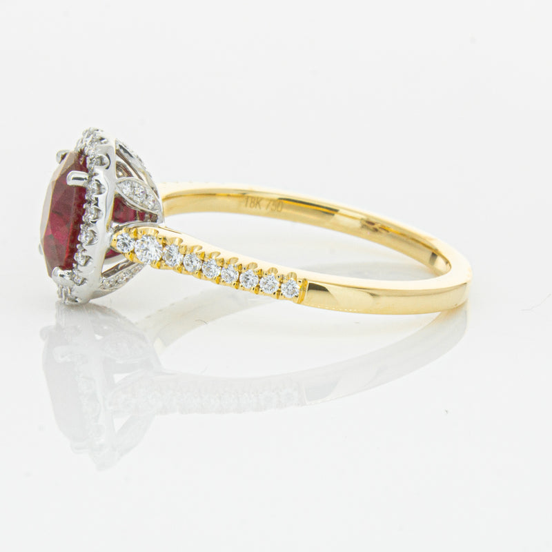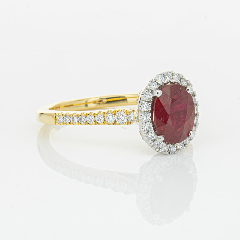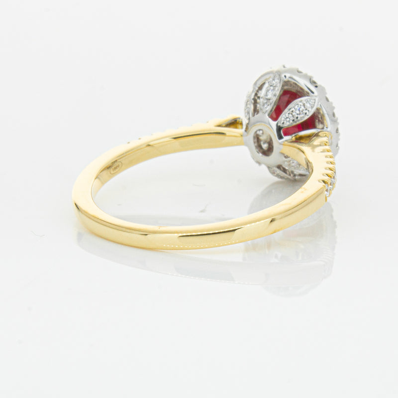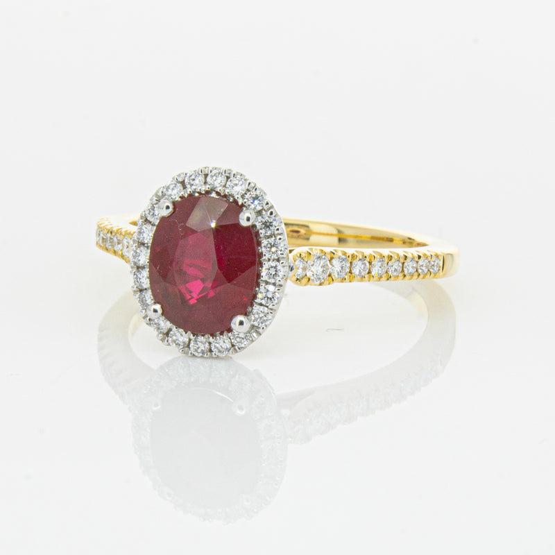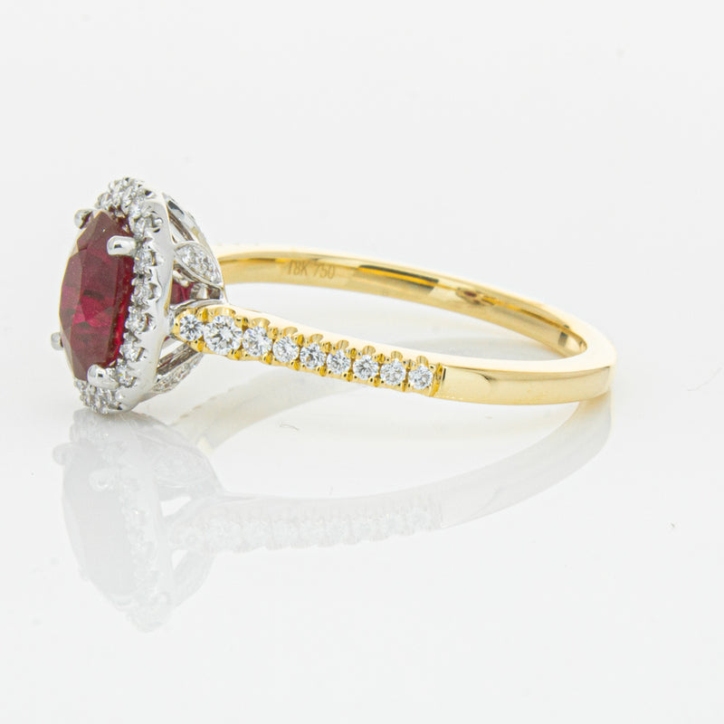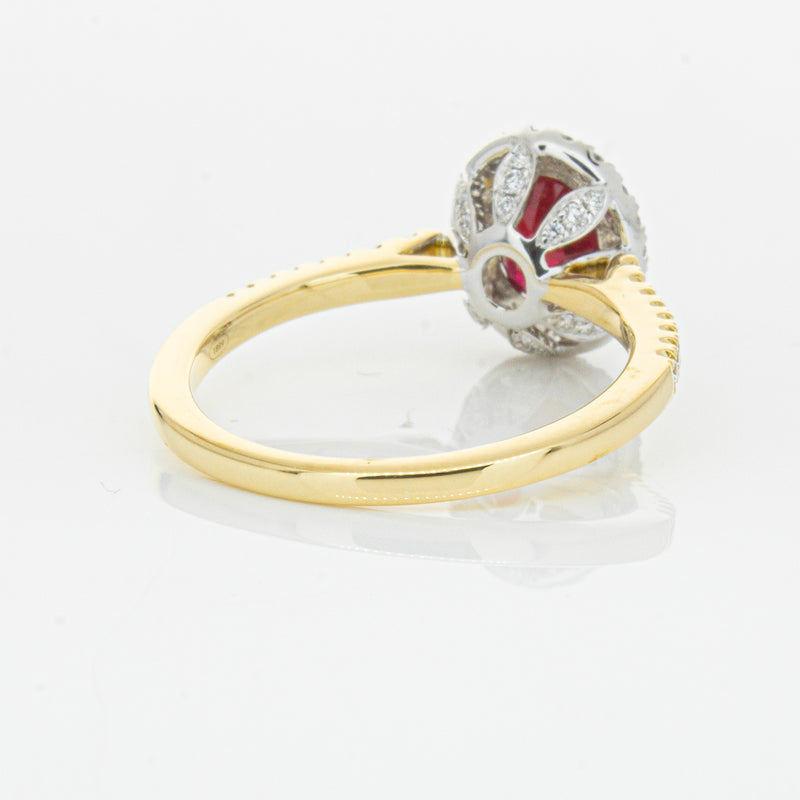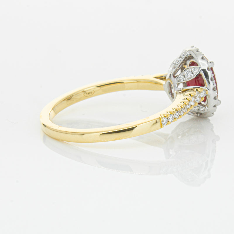 A brilliant red oval faceted ruby combines with exceptional sparkle to make a luminous statement in this gorgeous 18ct yellow and white gold Sierra ring from our signature 1899 collection. This particular ruby was sourced from Africa and is a dark strong red colour. The surrounding diamonds are round brilliant cut.