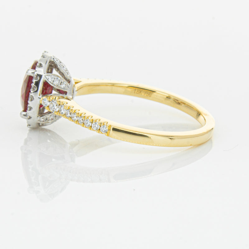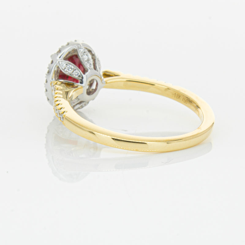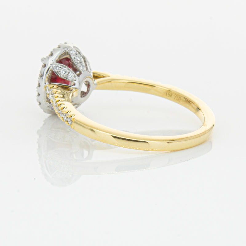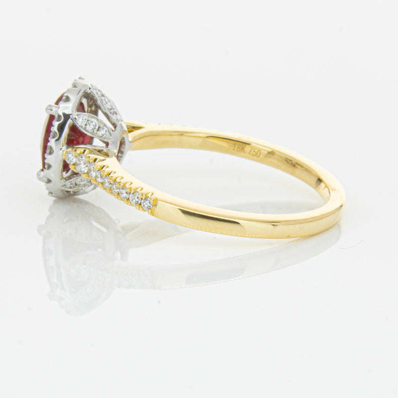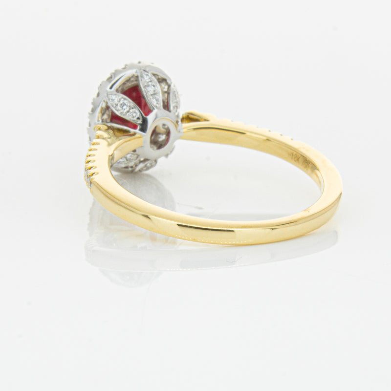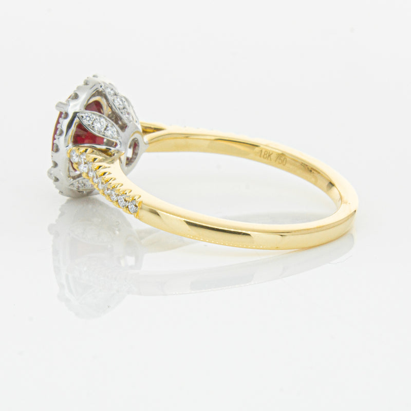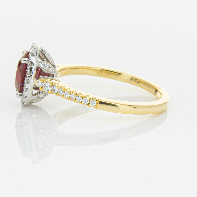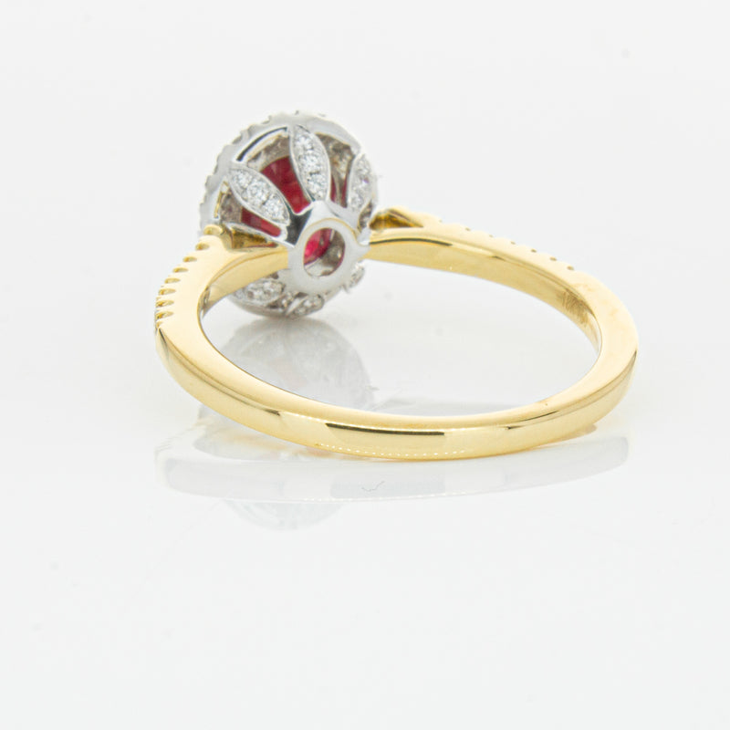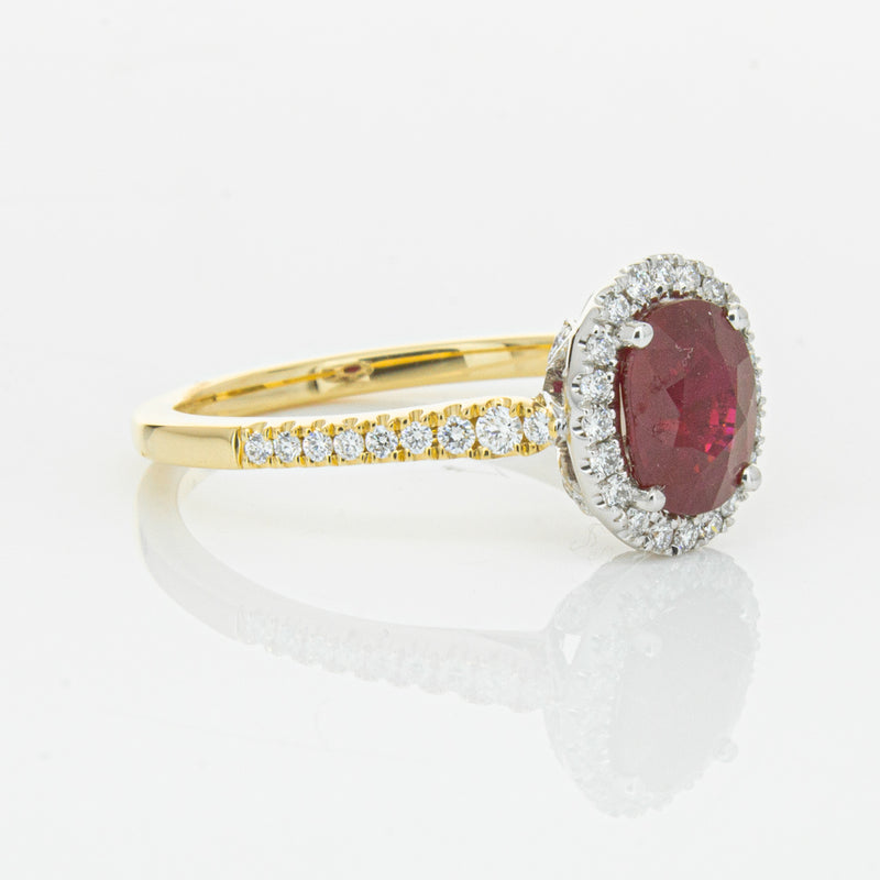 A brilliant red oval faceted ruby combines with exceptional sparkle to make a luminous statement in this gorgeous 18ct yellow and white gold Sierra ring from our signature 1899 collection. This particular ruby was sourced from Africa and is a dark strong red colour. The surrounding diamonds are round brilliant cut.