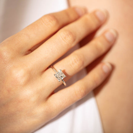 A fine minimalist design, Melba was named after the Greek word for 'slender'. The barely-there slim band allows the diamond to float above the finger.
