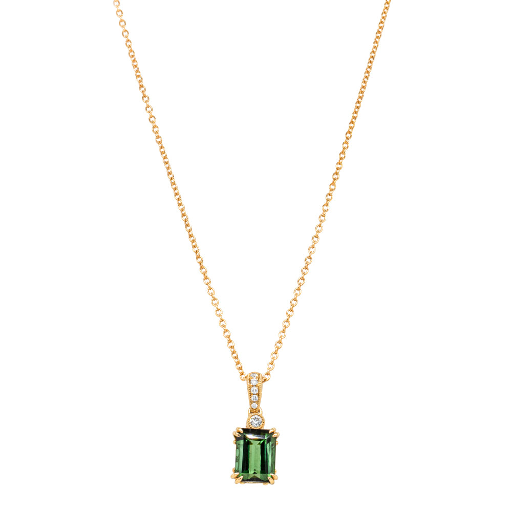 The lush green-hued tourmaline in this Romanov pendant flaunts vintage inspired details with an innate artistic flair, glowing in 18ct yellow gold from our signature 1899 collection. A diamond set bail provides a luminous finish.