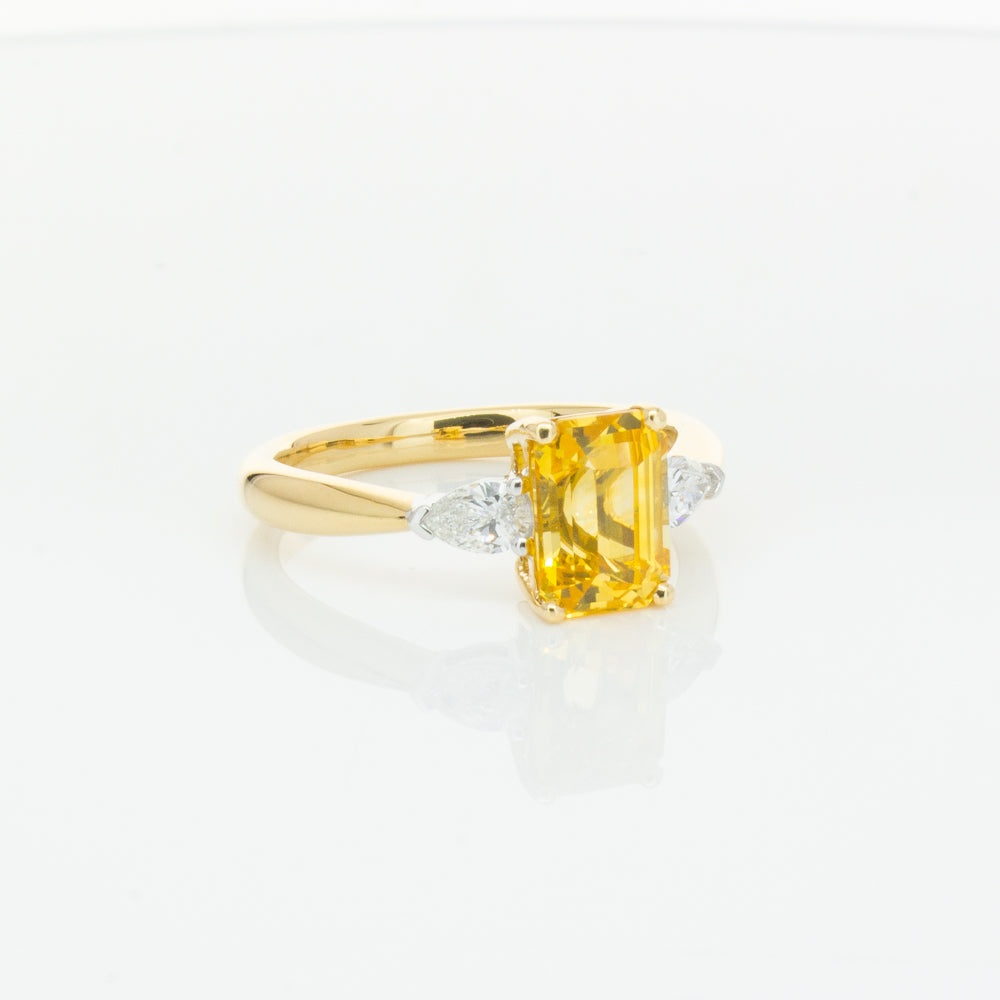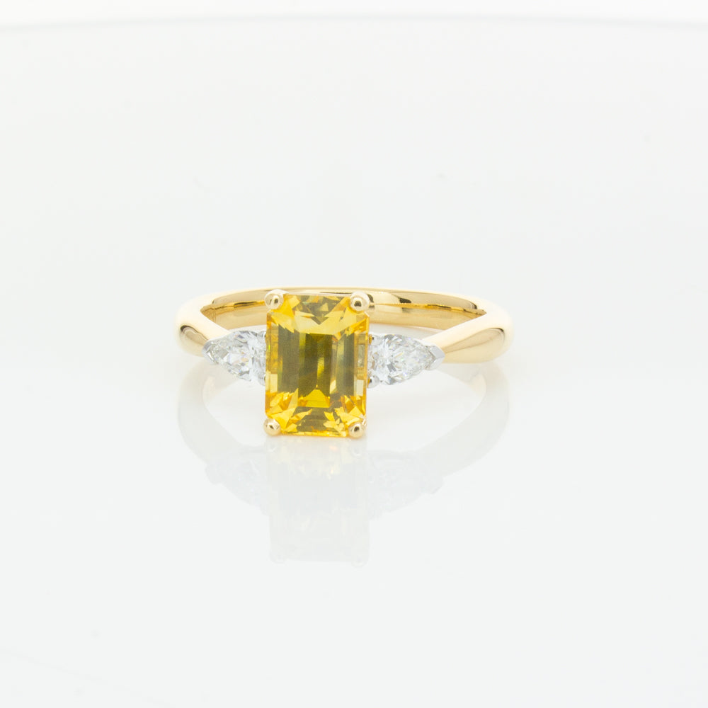 Boasting a 2.15ctrectangular step cut sapphire from Sri Lanka and two pear brilliant cut diamonds you will be the definition of beauty and elegance in this Ayla ring from our signature 1899 collection, beautifully set in 18ct yellow and white gold.