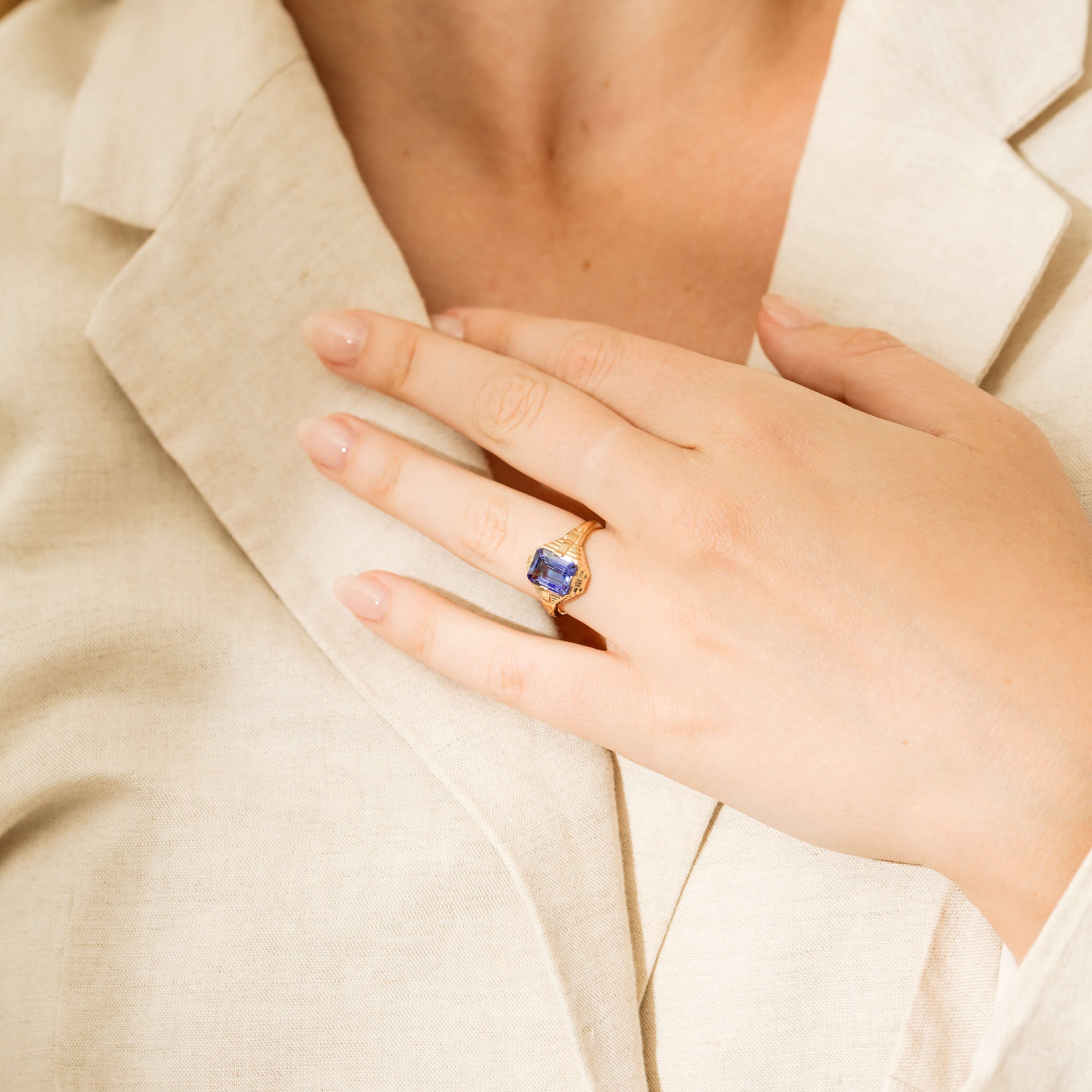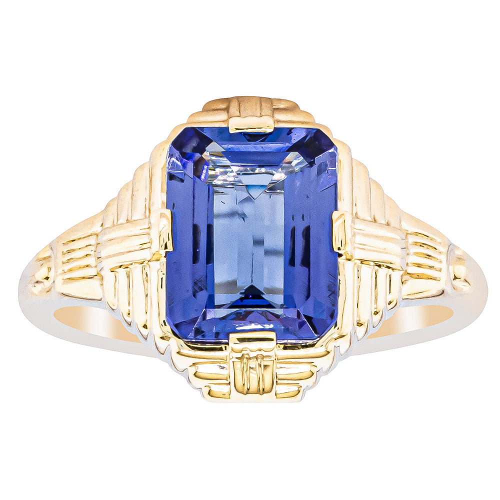 This beautiful Nile ring has been crafted from 18ct yellow gold and features one rectangular step cut tanzanite set on a decorative Art Deco styled mount.