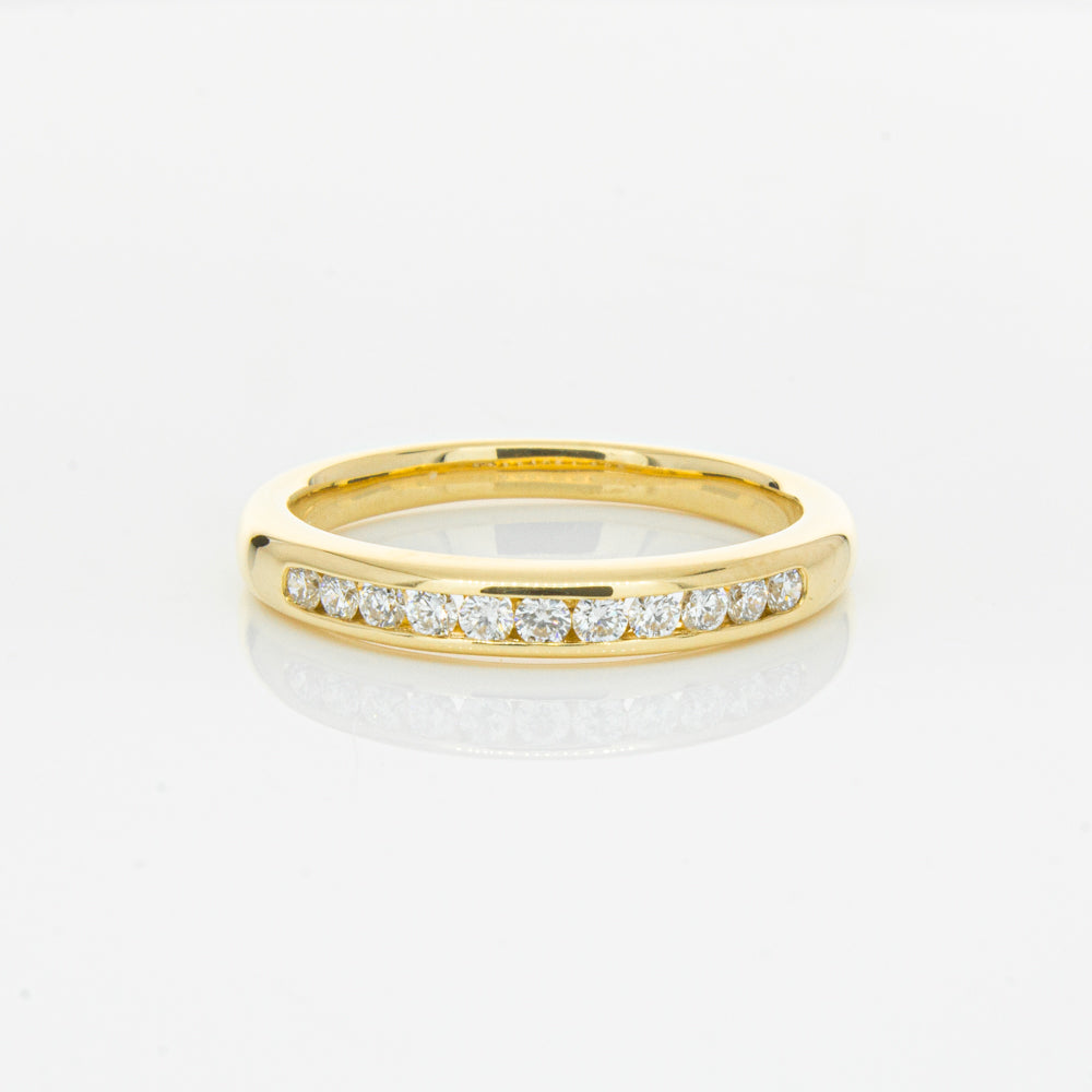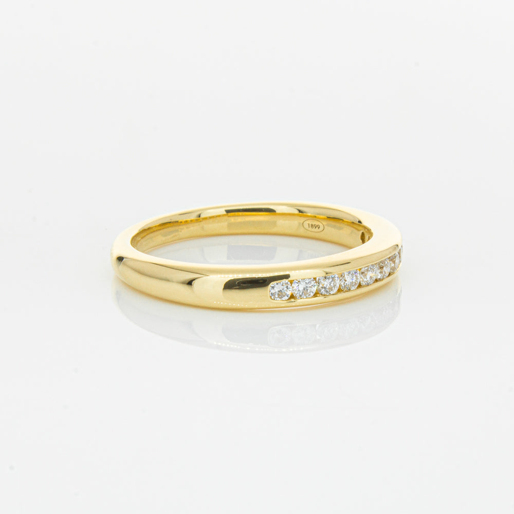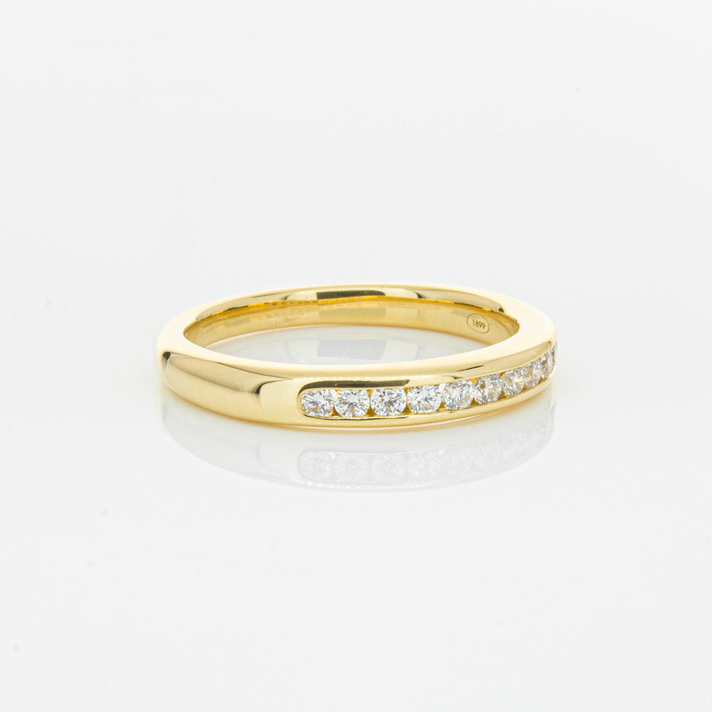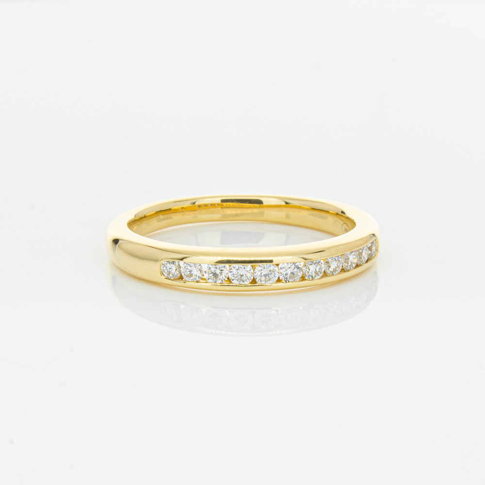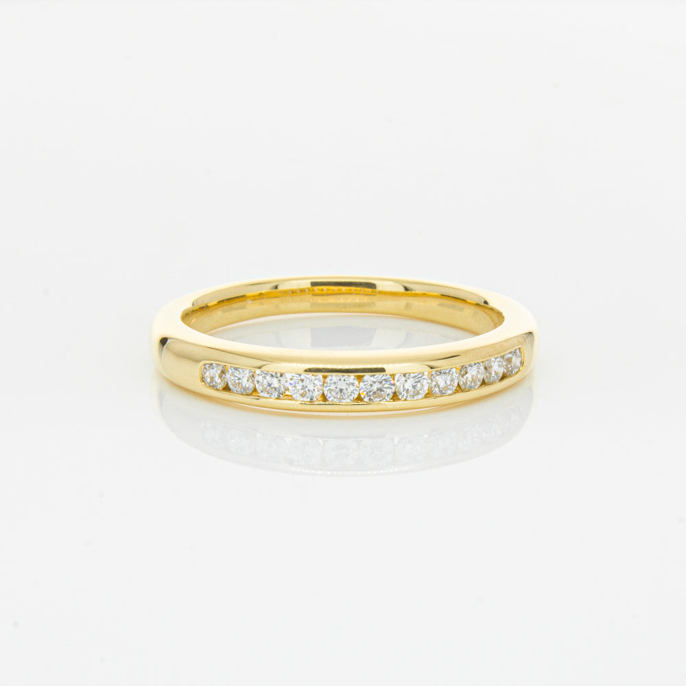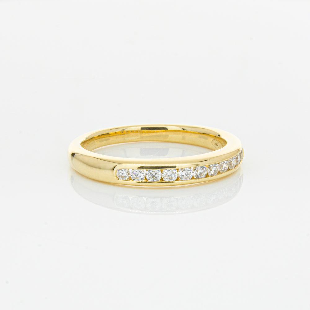 This diamond band boasts a refined and sophisticated design, adorned with shimmering round brilliant cut diamonds and crafted from 18ct yellow gold.